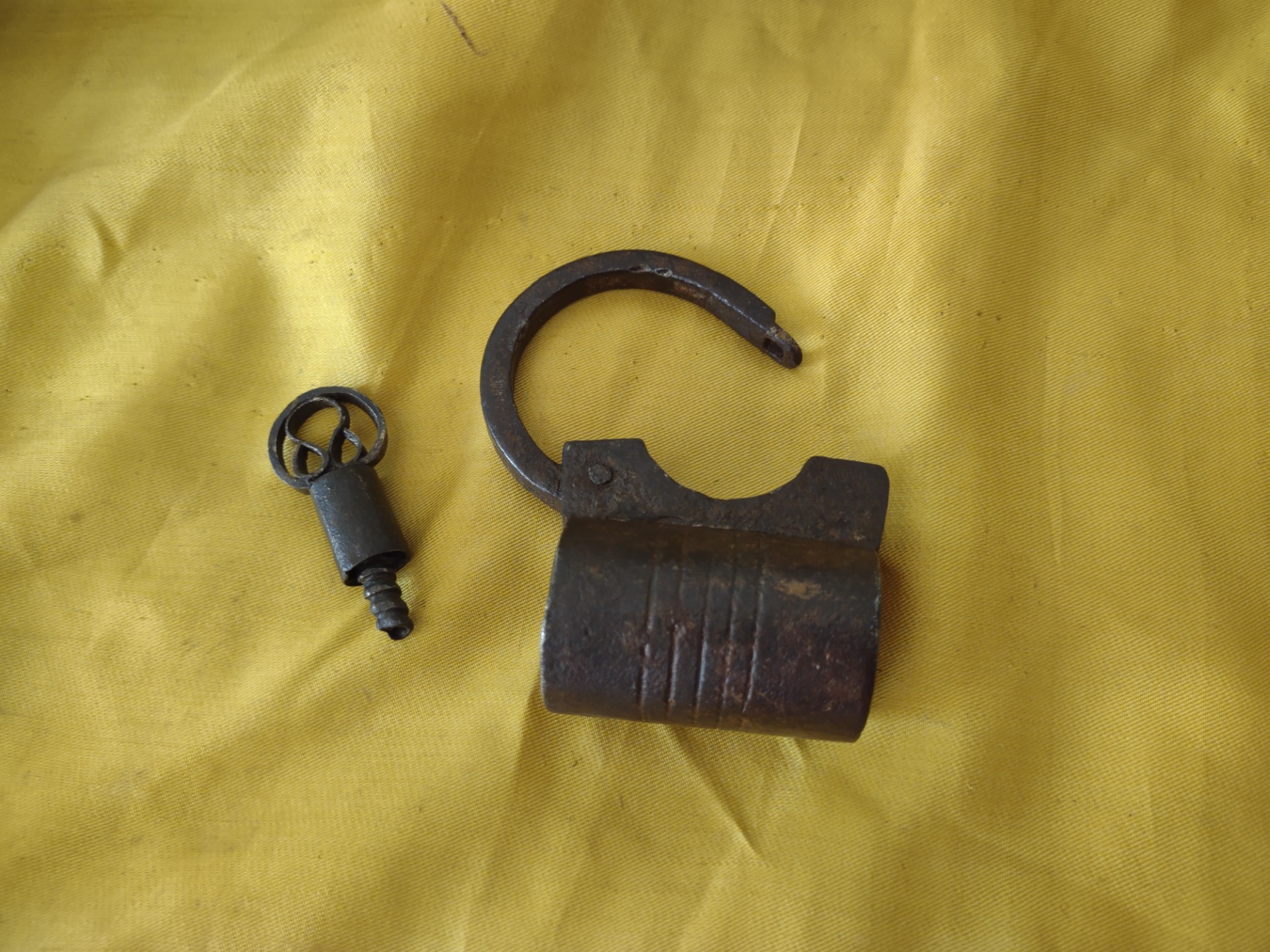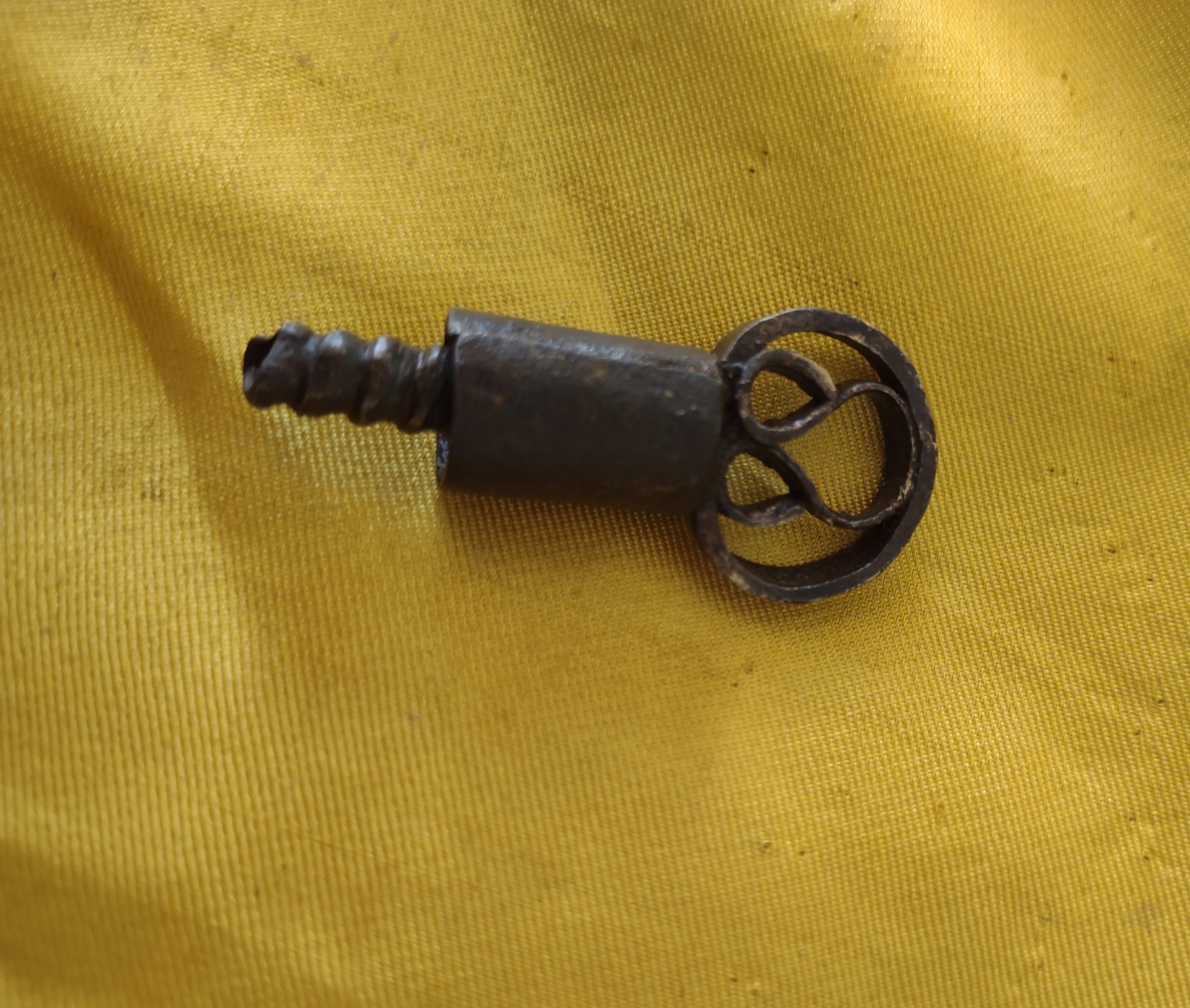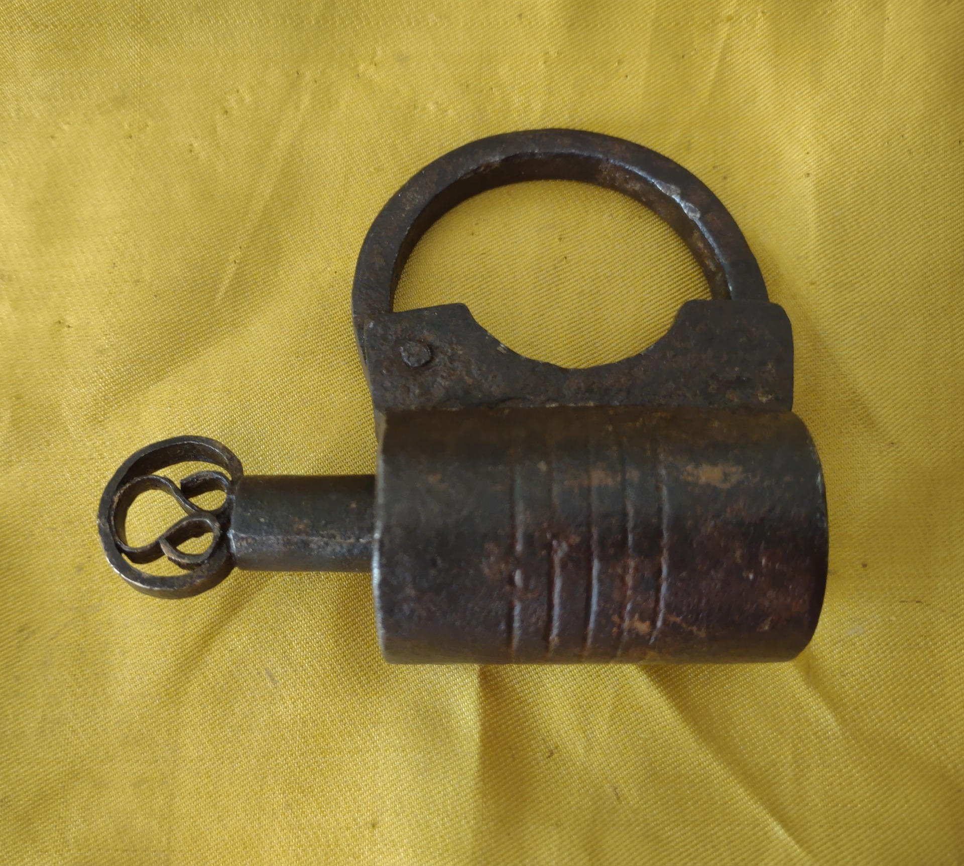 German padlock in wrought iron, cylindrical case decorated with 5 grooves. Locking mechanism with left-handed threaded bolt and helical thrust spring.Original threaded key, oval handle with ornamental volutes.