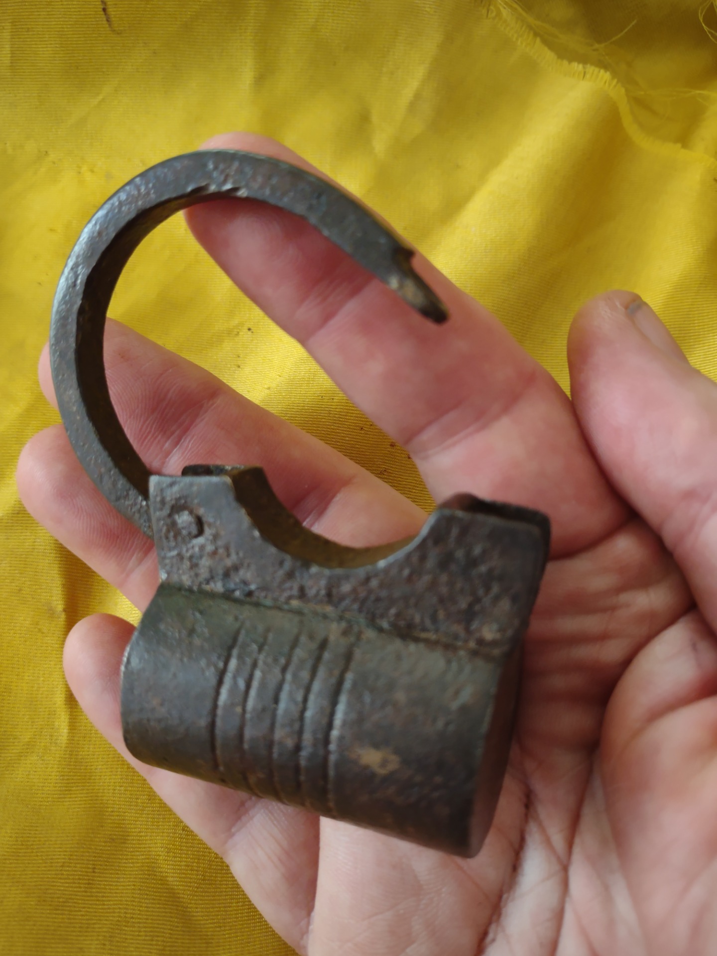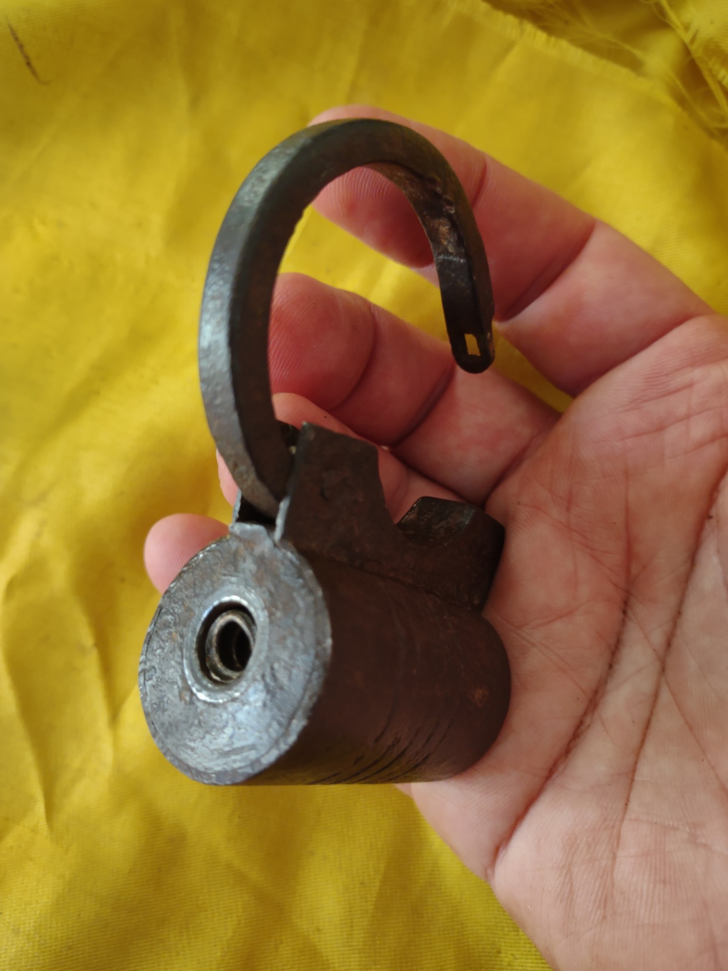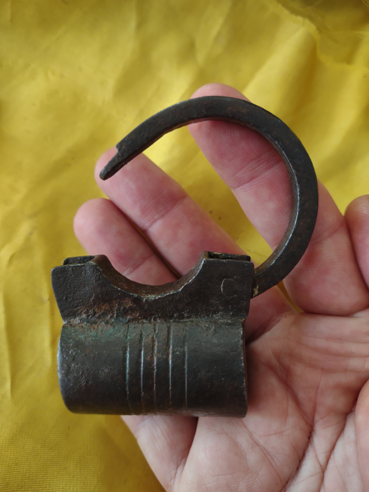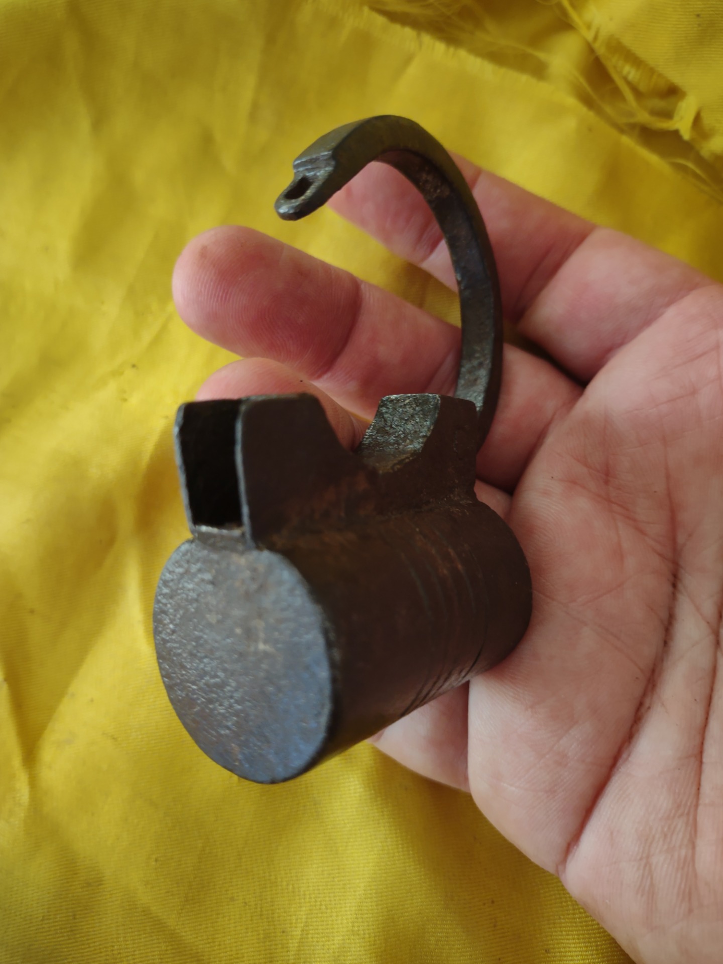 German padlock in wrought iron, cylindrical case decorated with 5 grooves. Locking mechanism with left-handed threaded bolt and helical thrust spring.Original threaded key, oval handle with ornamental volutes.