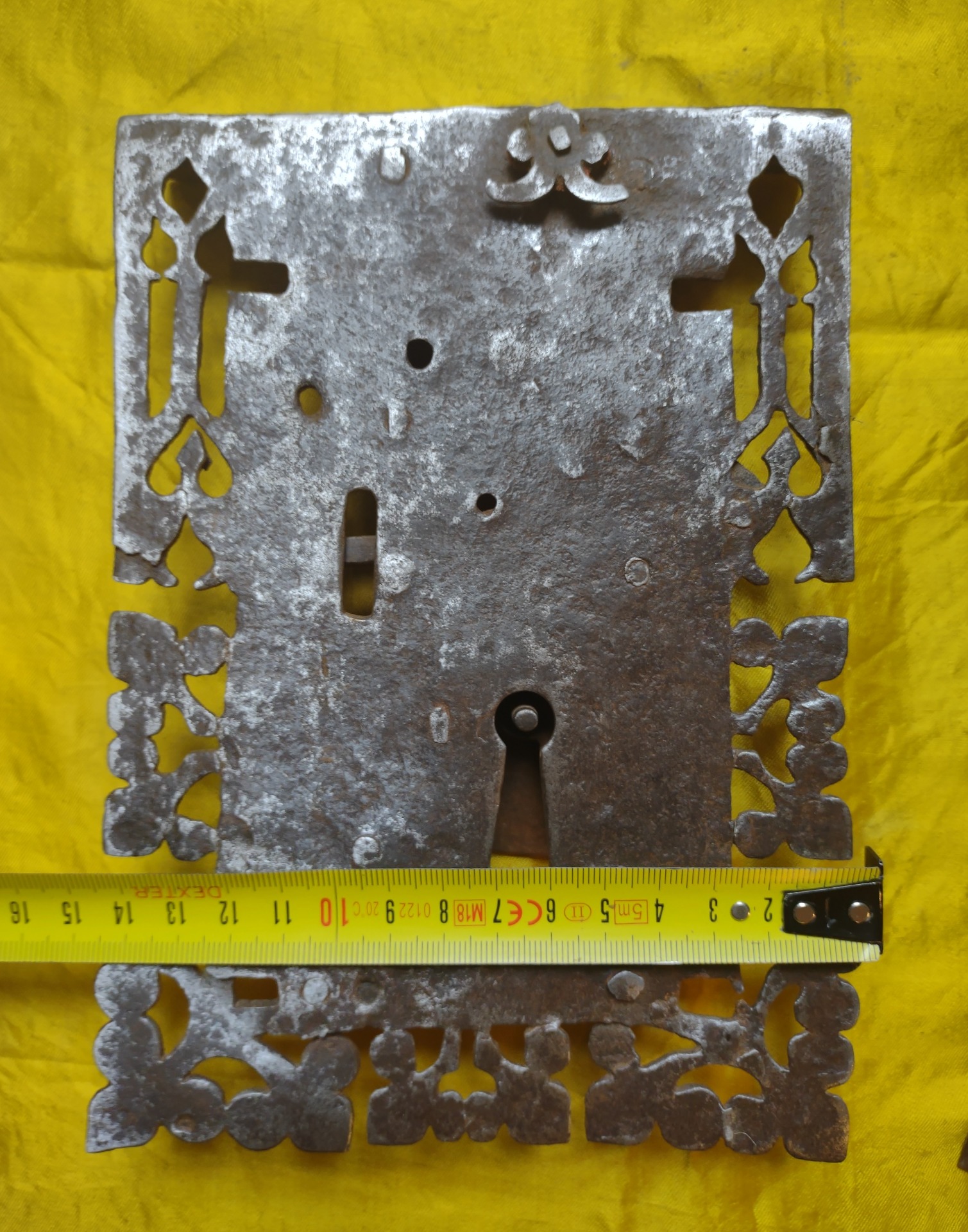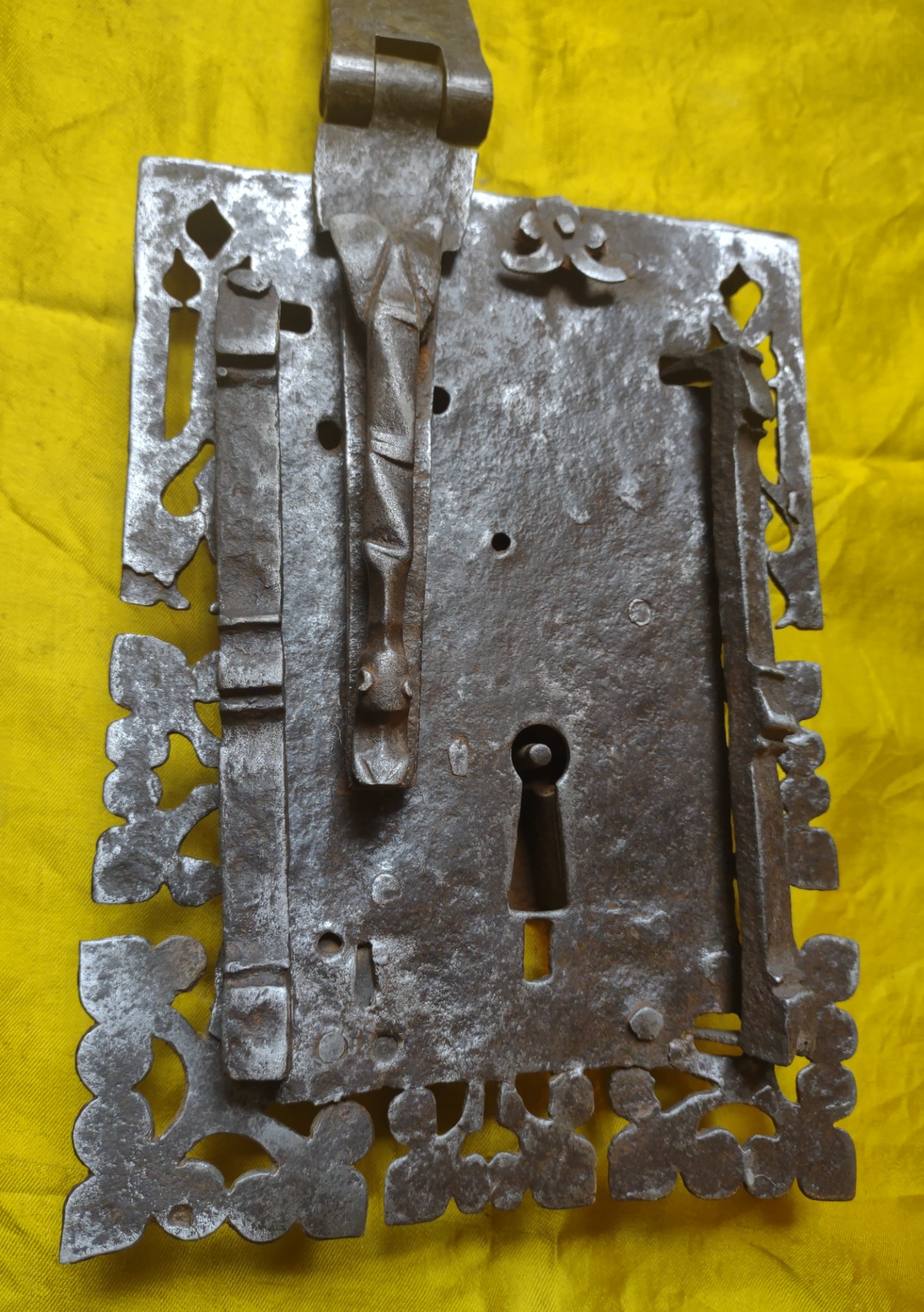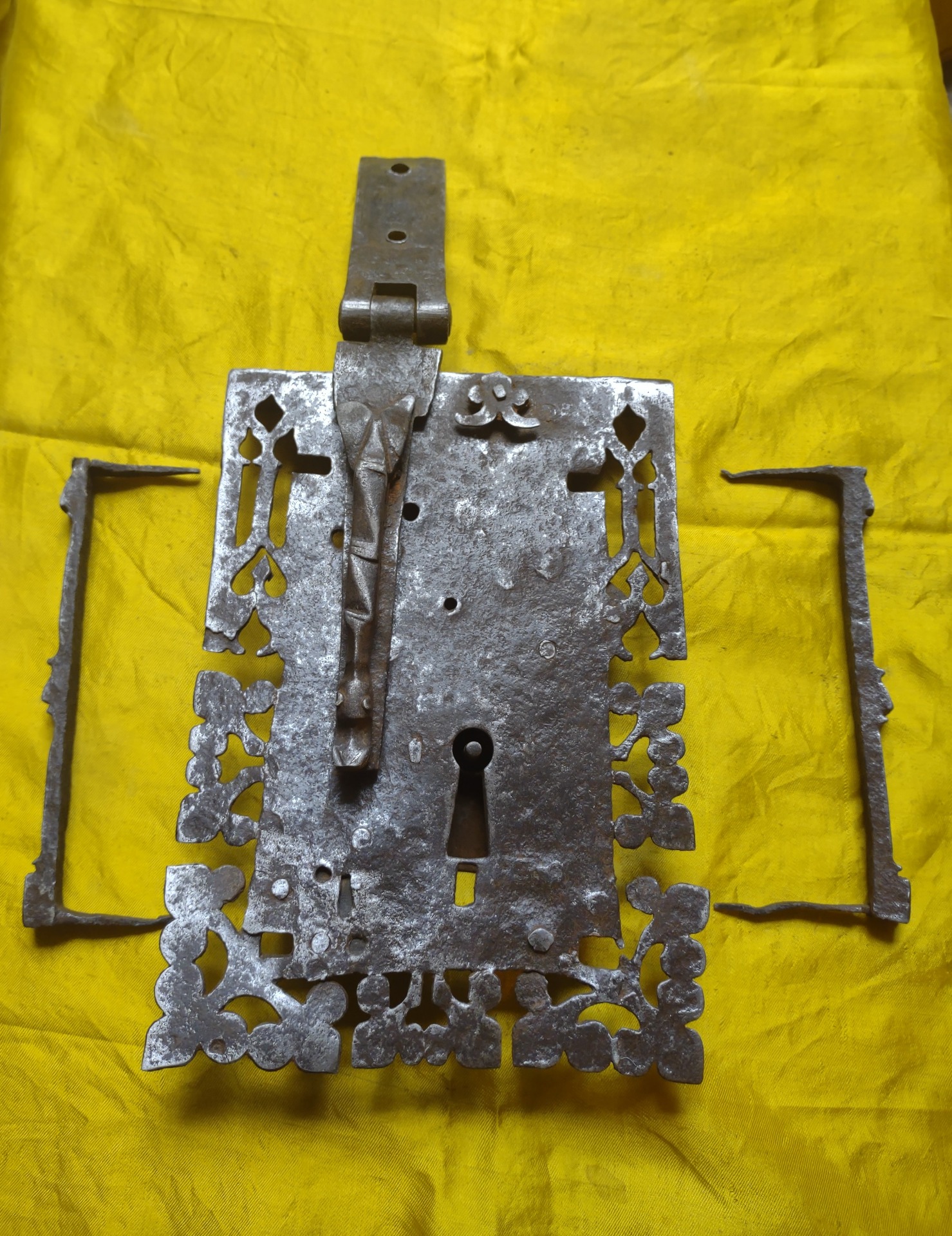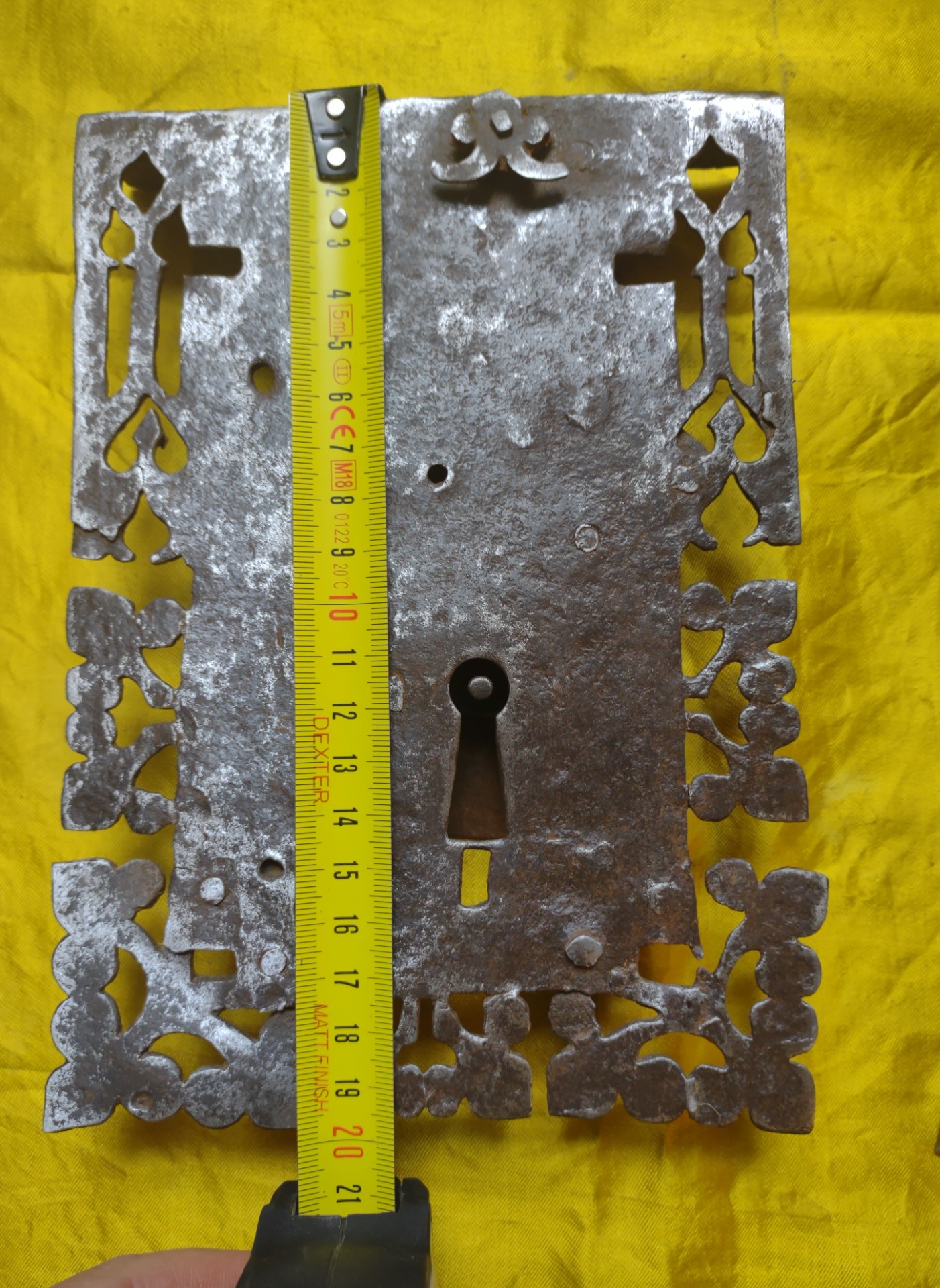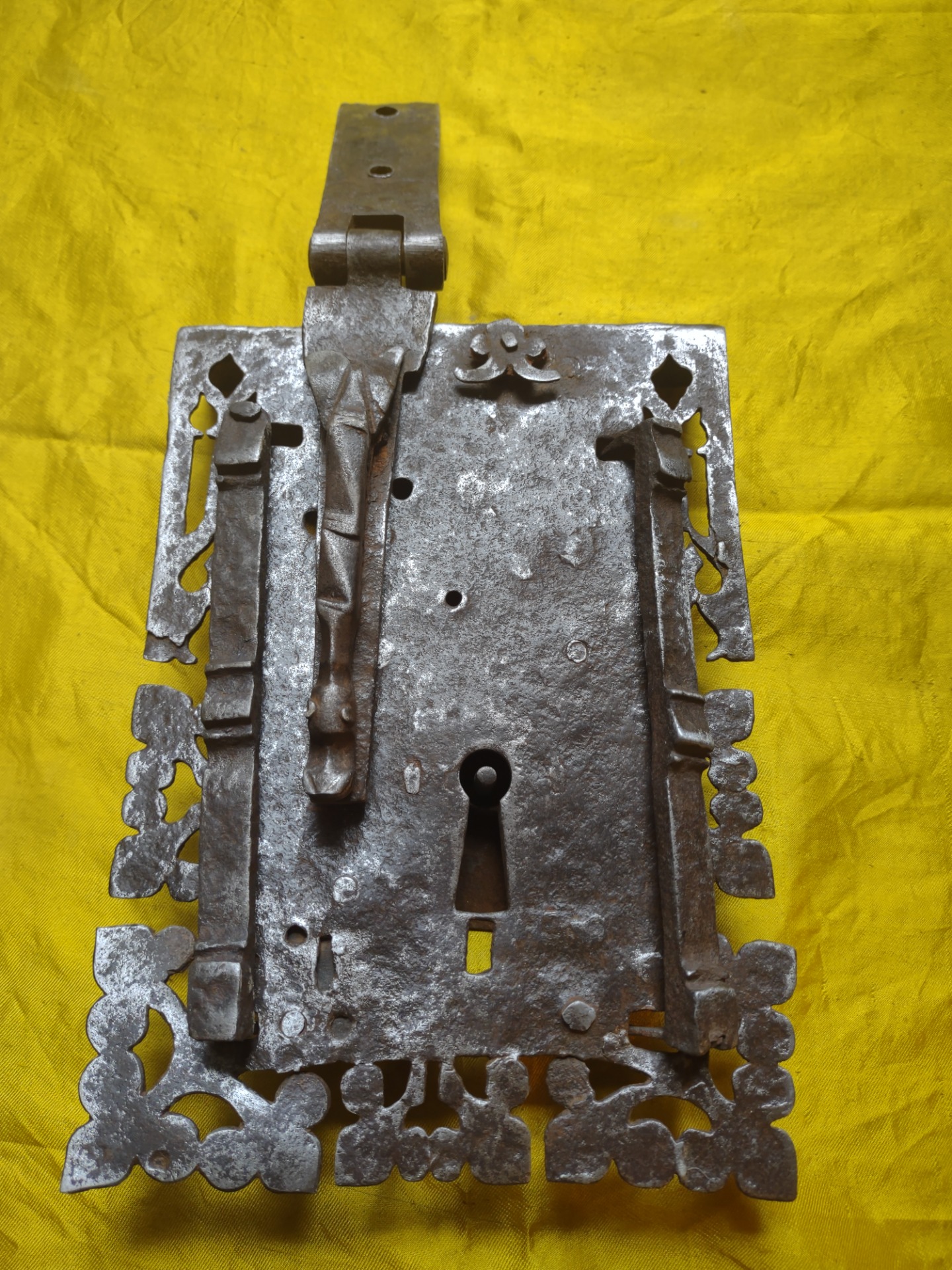 Splendid chest lock in wrought and openwork iron. Bolt in the shape of a dragon. Ancient repair in the lower right corner (see photo of the back). Dimensions cm 19*14