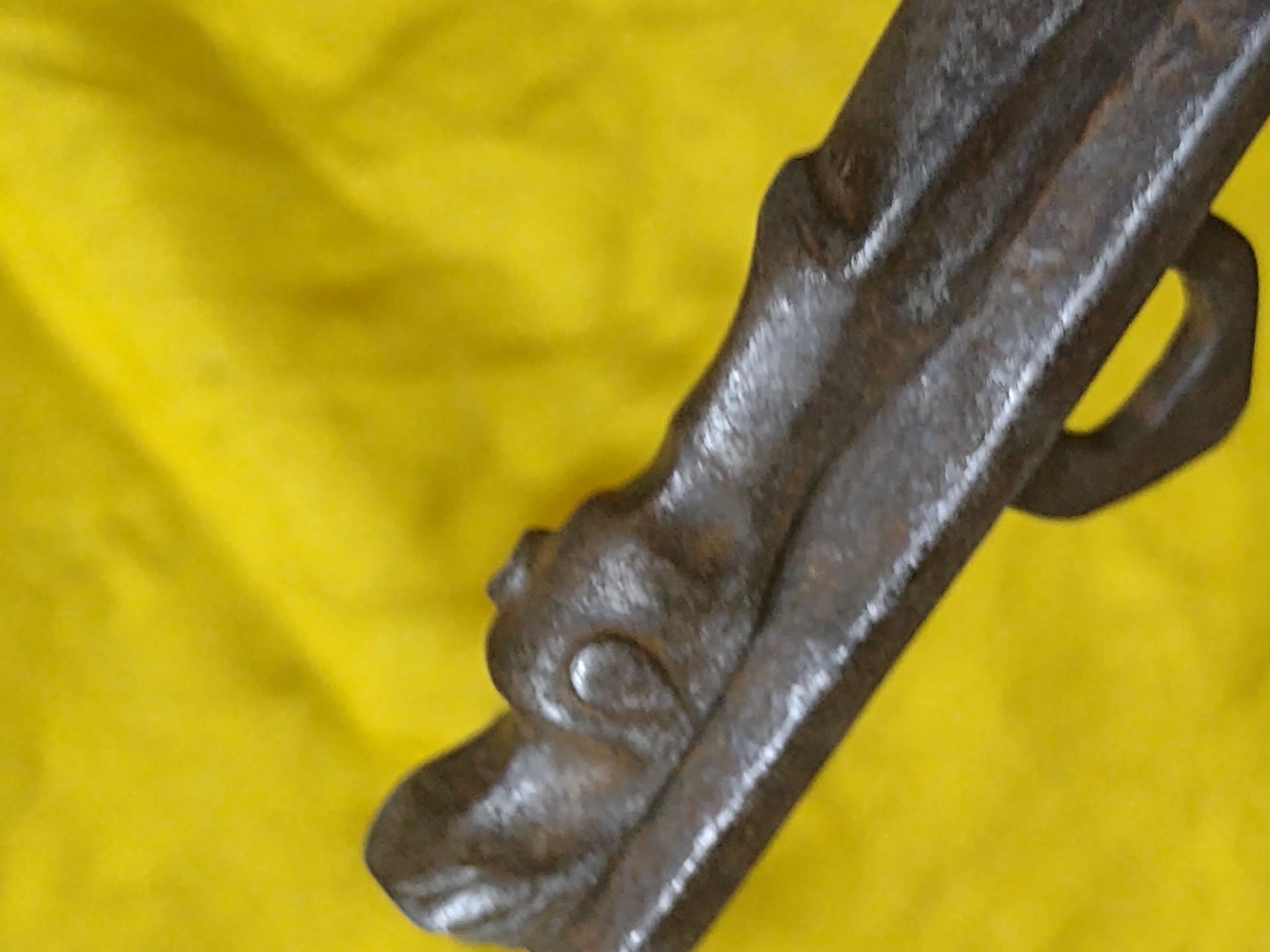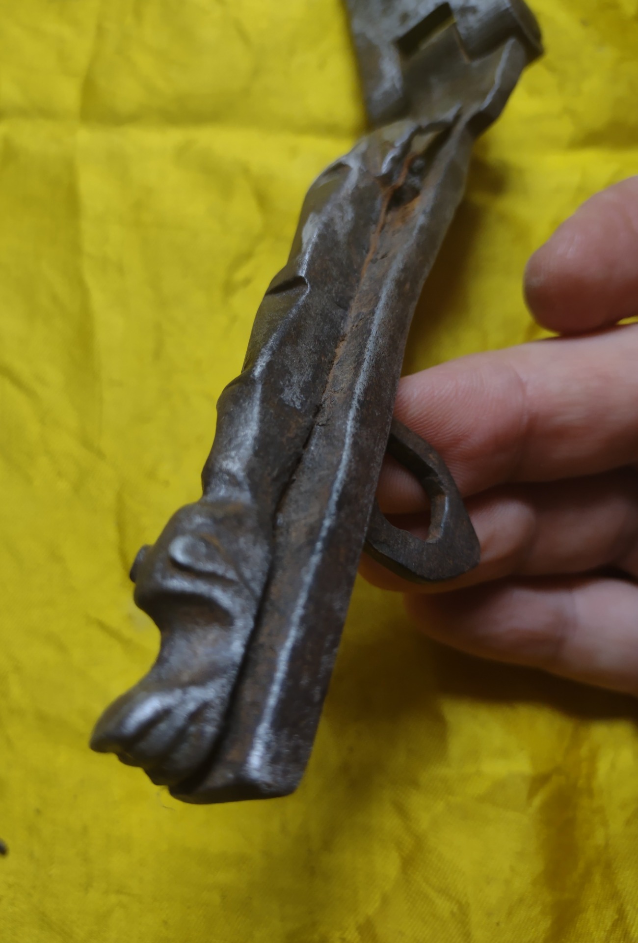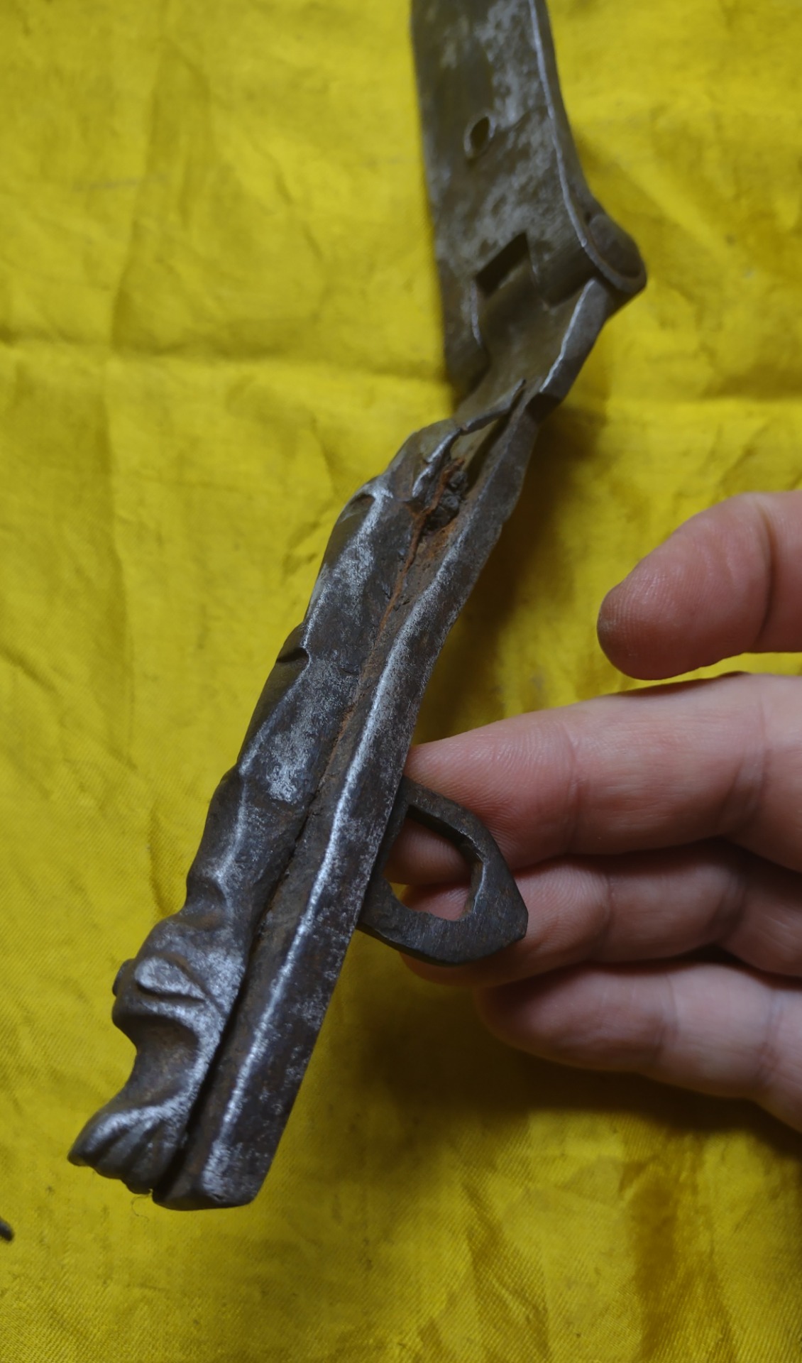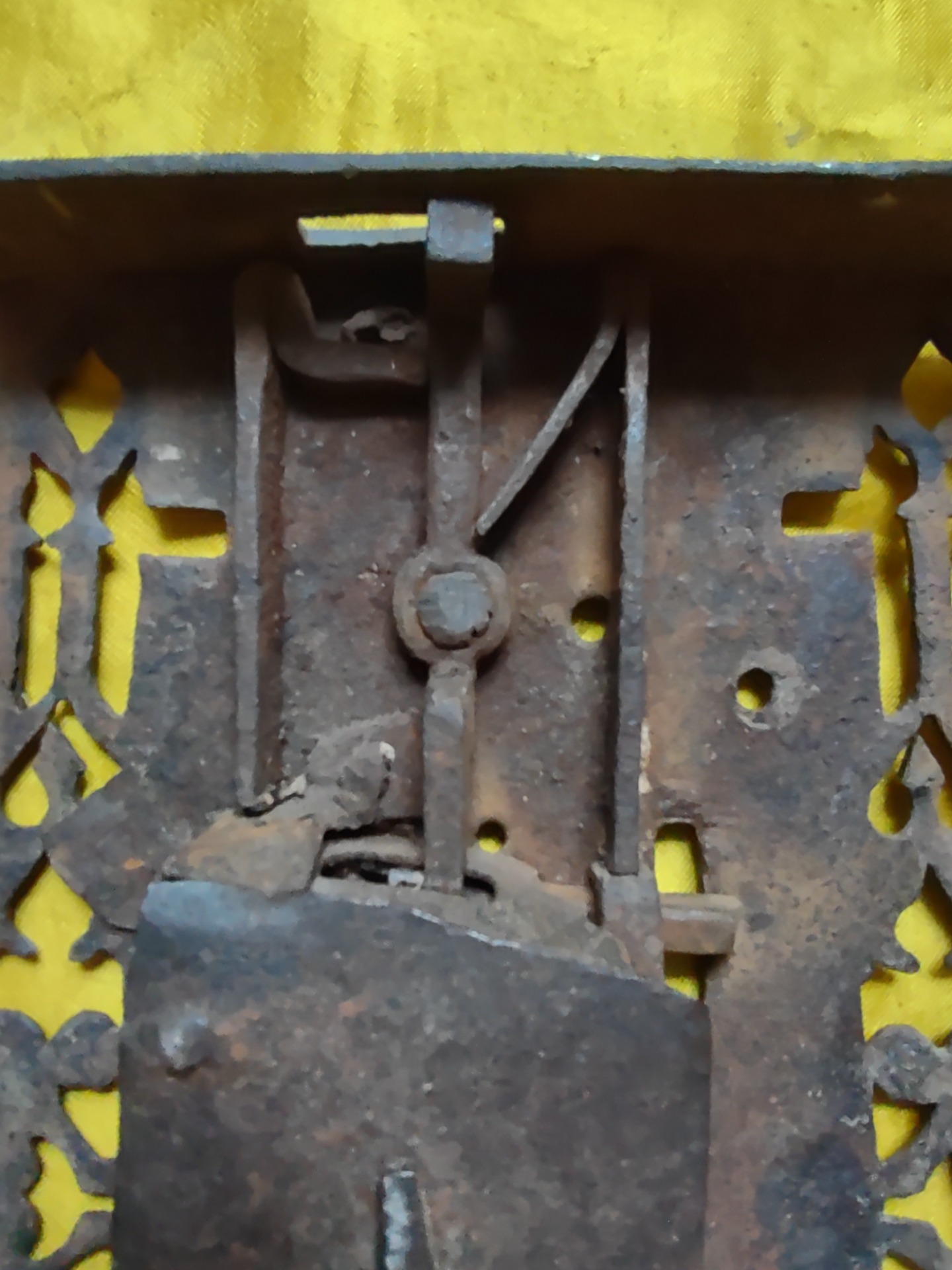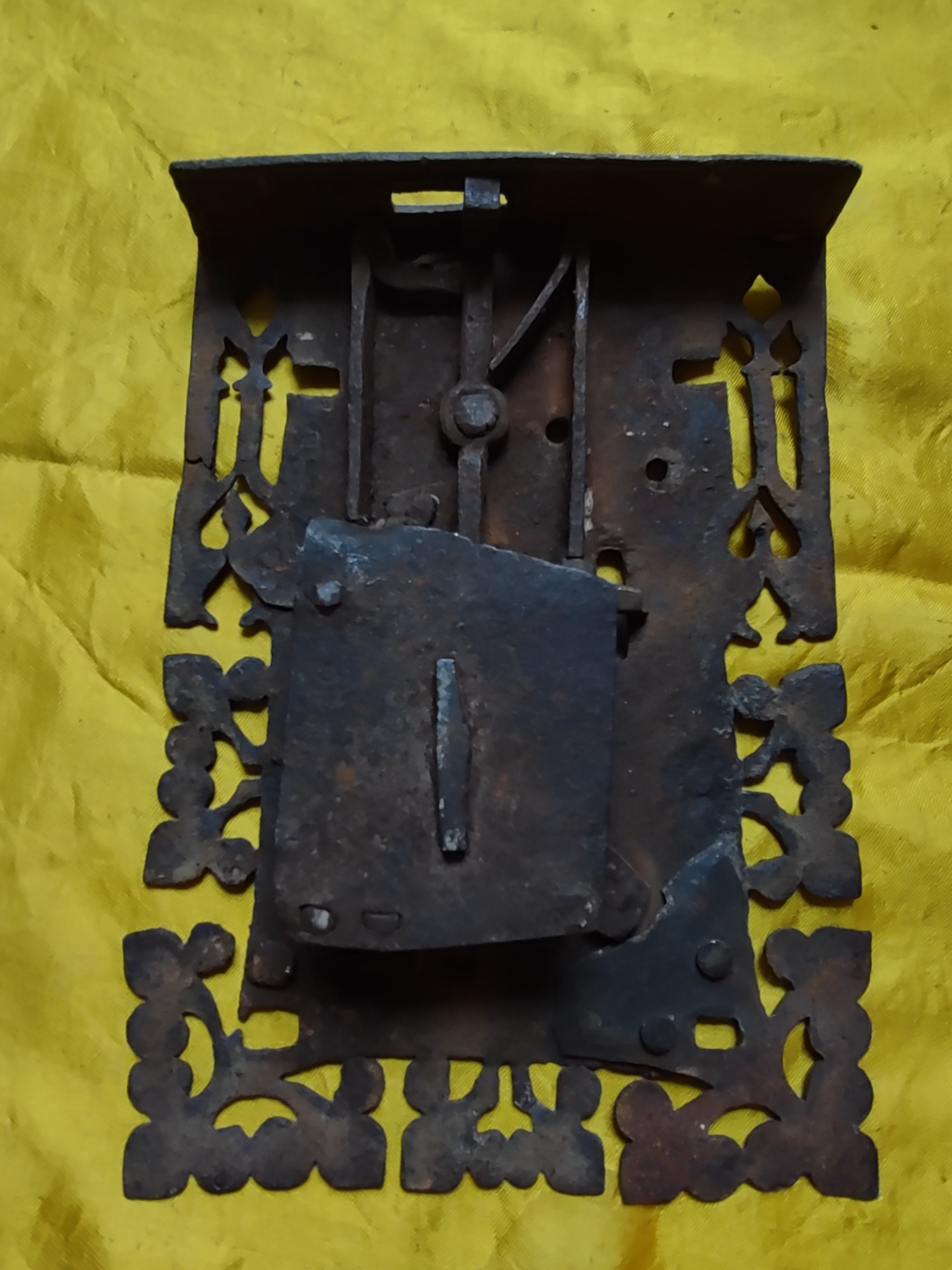 Splendid chest lock in wrought and openwork iron. Bolt in the shape of a dragon. Ancient repair in the lower right corner (see photo of the back). Dimensions cm 19*14