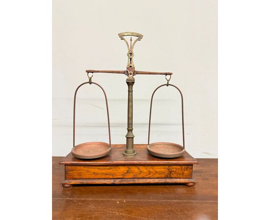 Antica bilancia da farmacista '800, 46x36 cm, in legno, castagno e metallo, molto ben tenuta e funzionante!