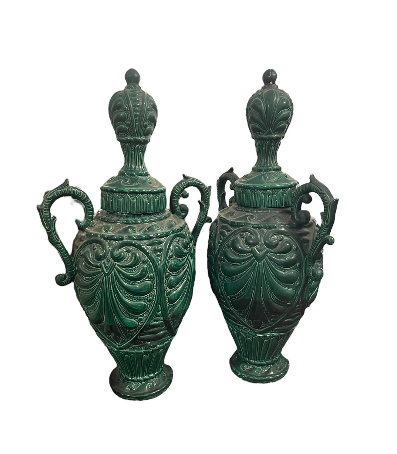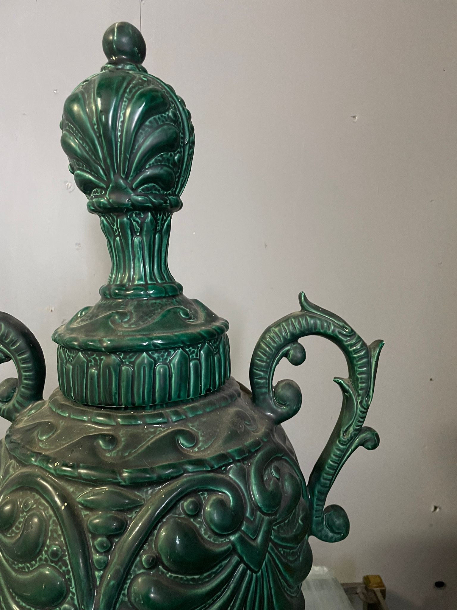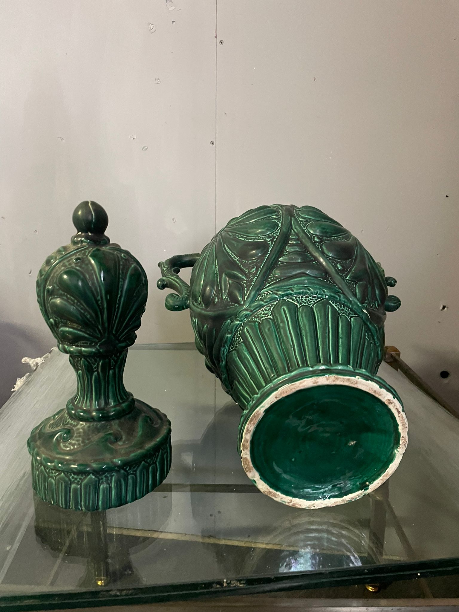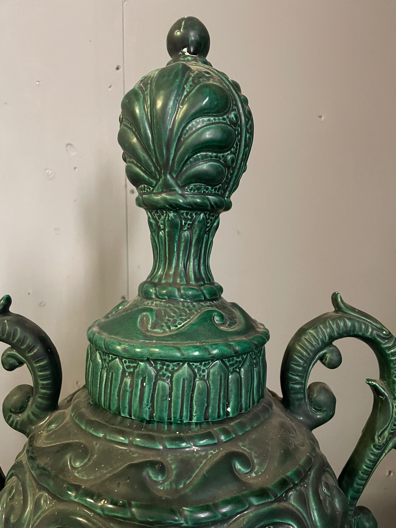 Coppia di grandi vasi Potiche d'epoca, con coperchio e fatti ad anfora con 2 manici cadauno. In ceramica tipo maiolica, verde smeraldo, riccamente decorate con palmette e fregi