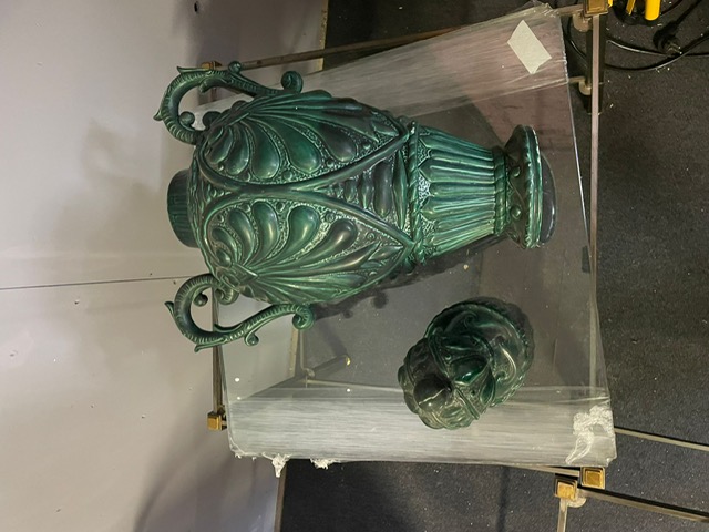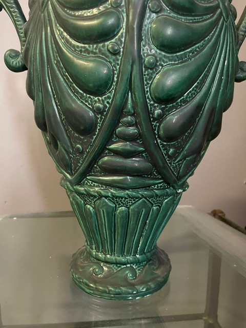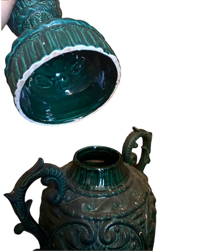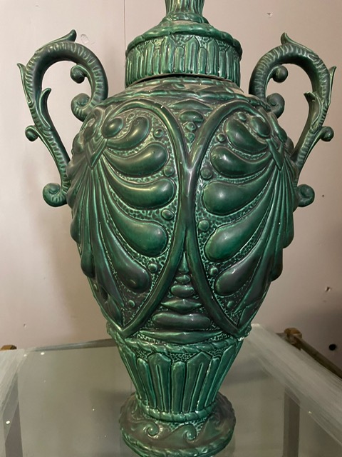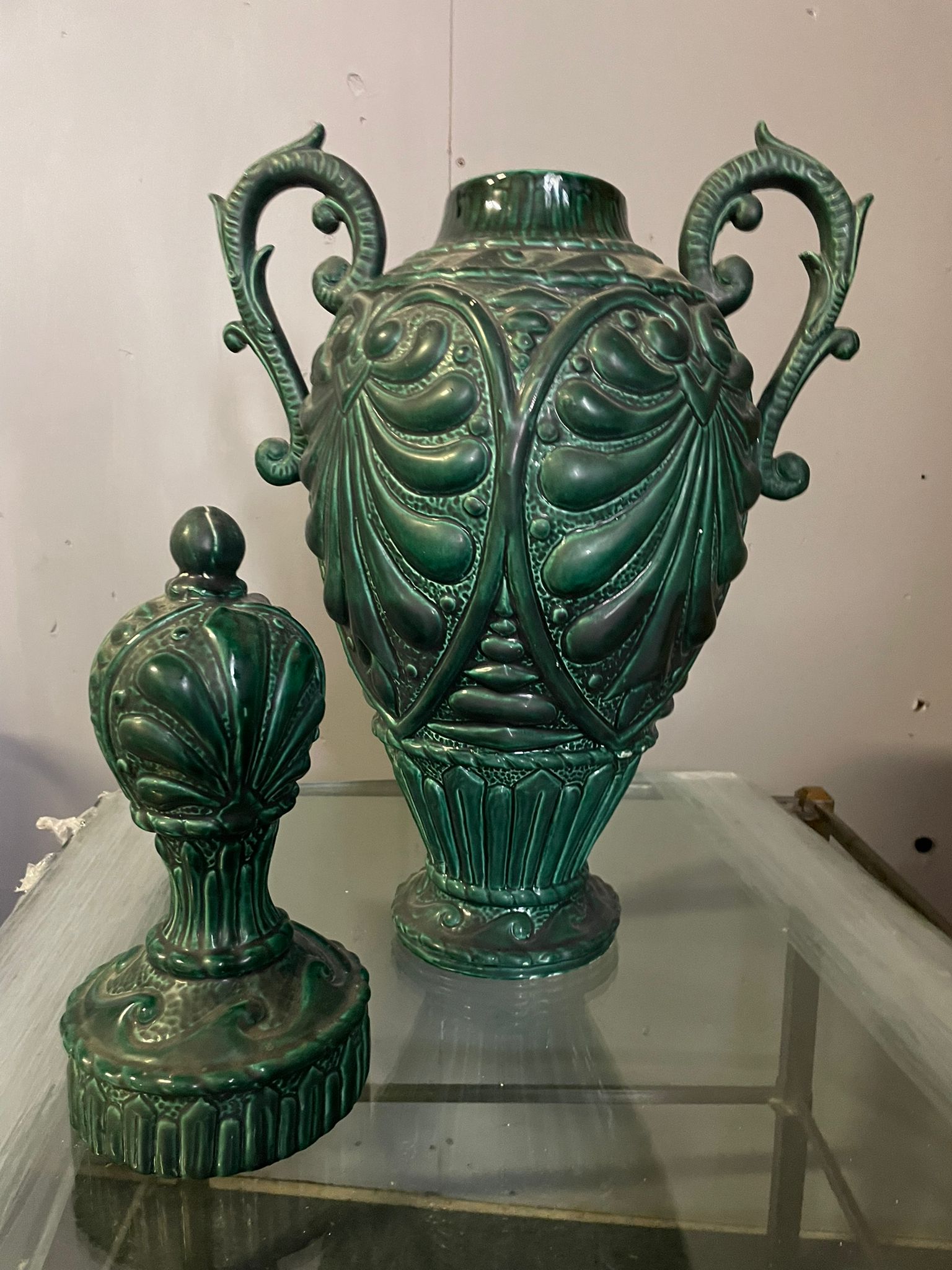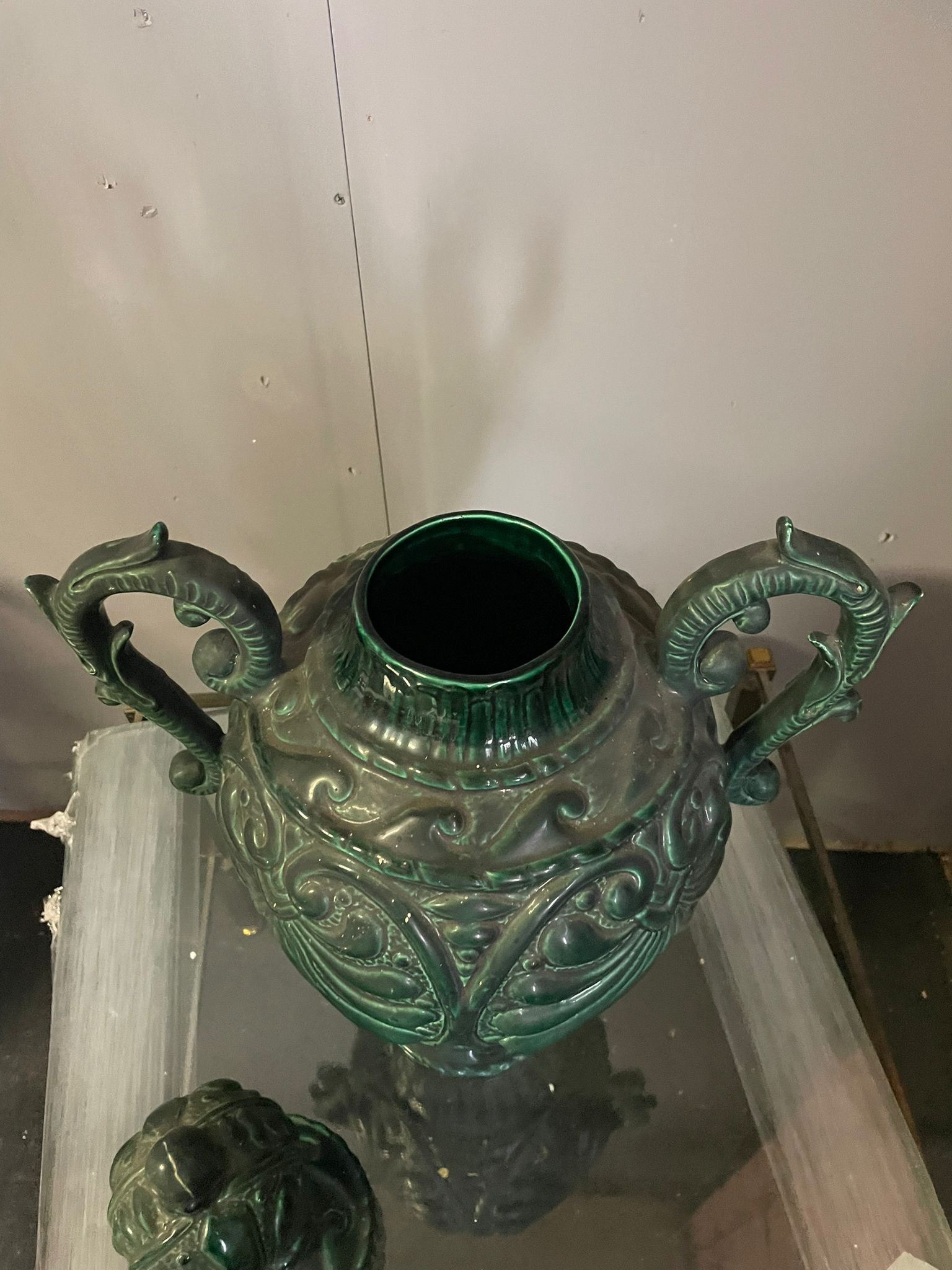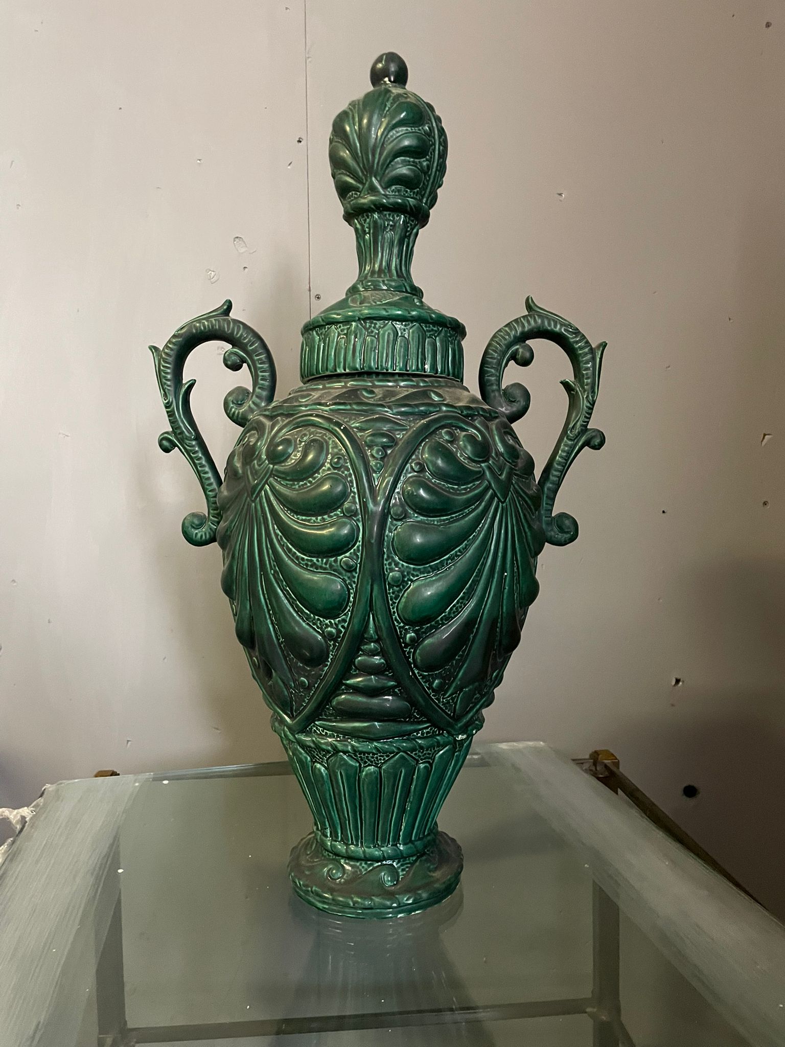Coppia di grandi vasi Potiche d'epoca, con coperchio e fatti ad anfora con 2 manici cadauno. In ceramica tipo maiolica, verde smeraldo, riccamente decorate con palmette e fregi