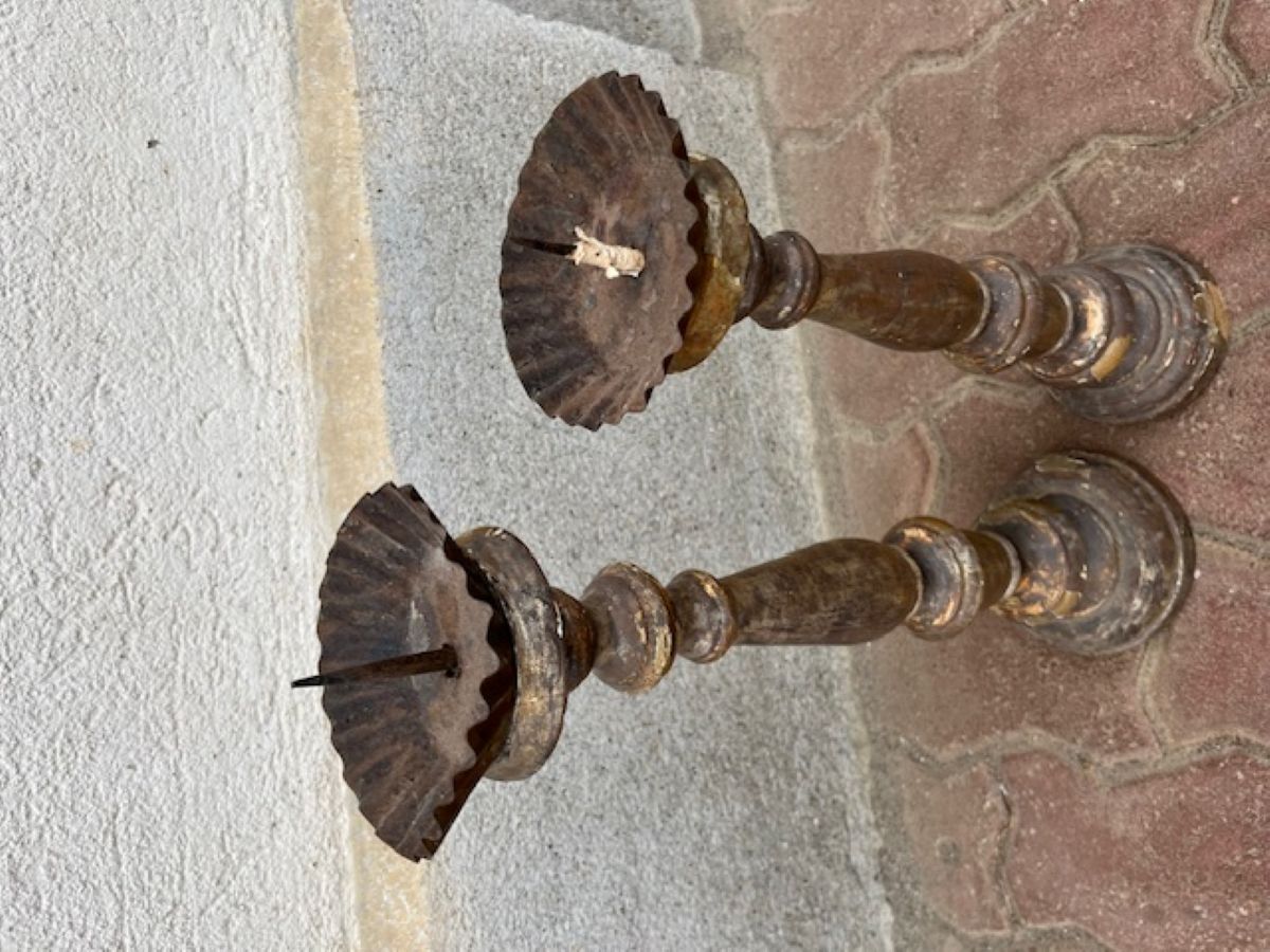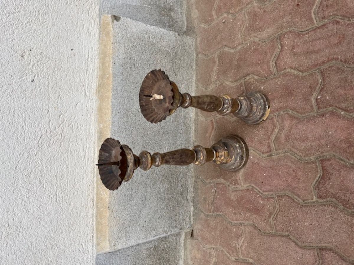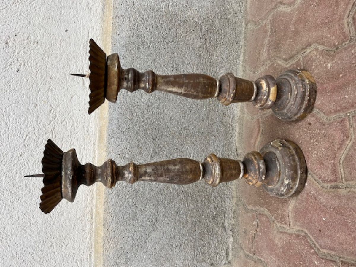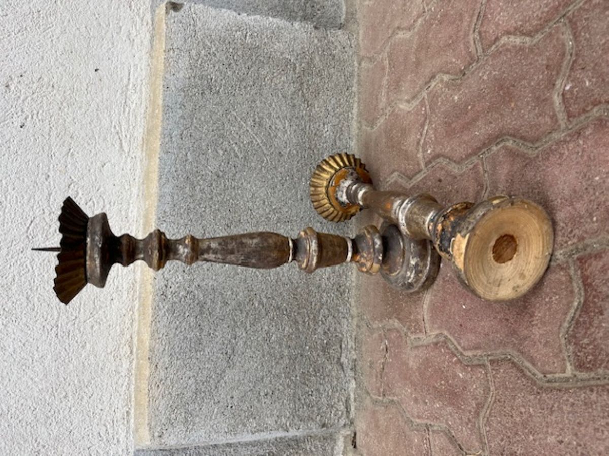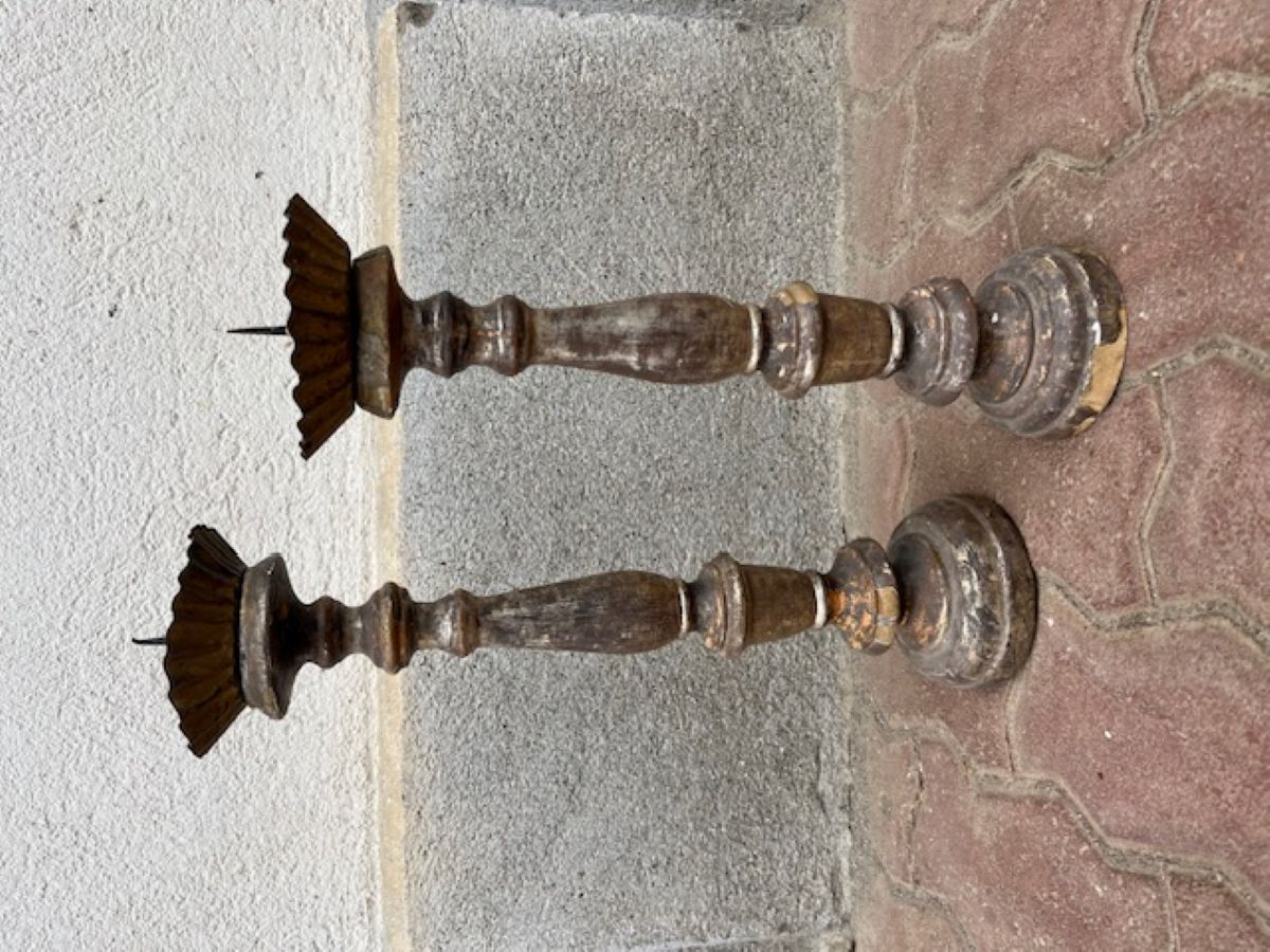 Coppia di candelieri in legno scolpiti e argentati