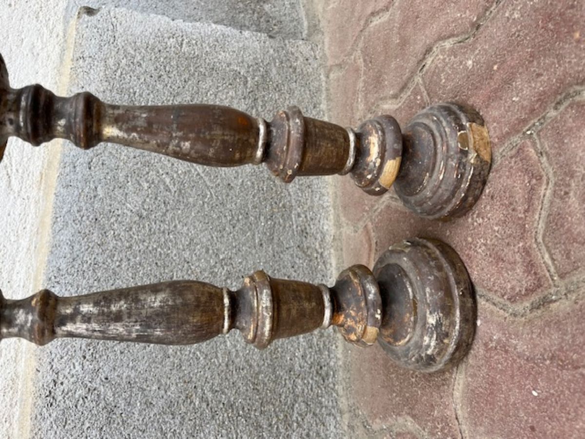 Coppia di candelieri in legno argentato, scolpite e originali di epoca tardo '800, presentano alcune riprese con vernice argentata, ma completi di coppette in ferro portacandela. Venduti in coppia. Misura cadauno D 12 x H 48 in cm.