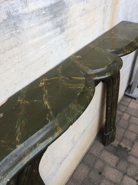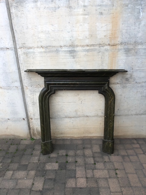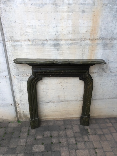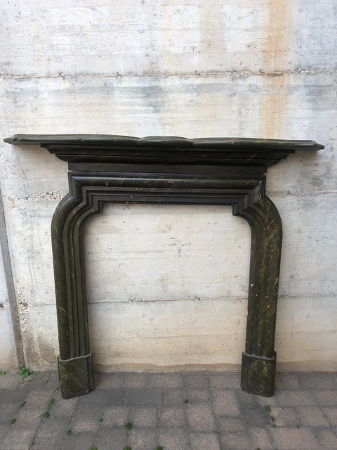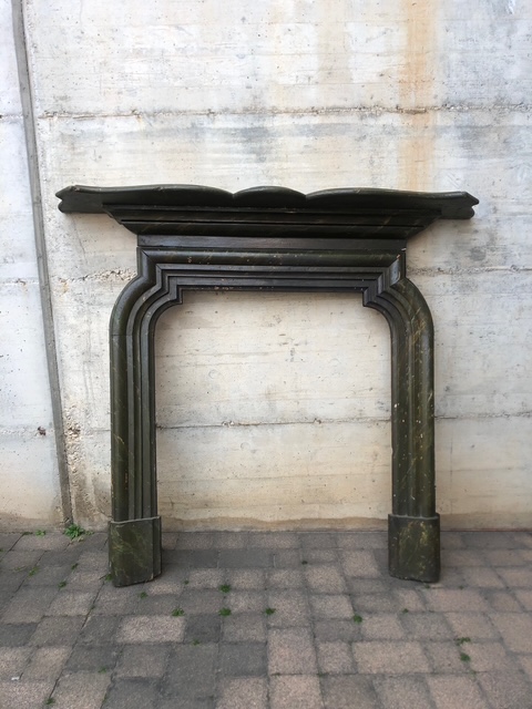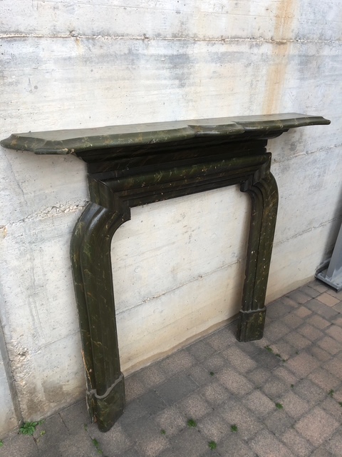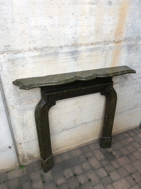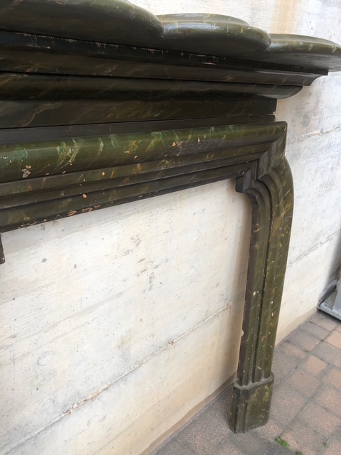 Cornice di camino in legno, con mensola sporgente, forma mossa di epoca '700, scolpito in legno di pioppo e laccato a finto marmo color verdone scuro/nero
