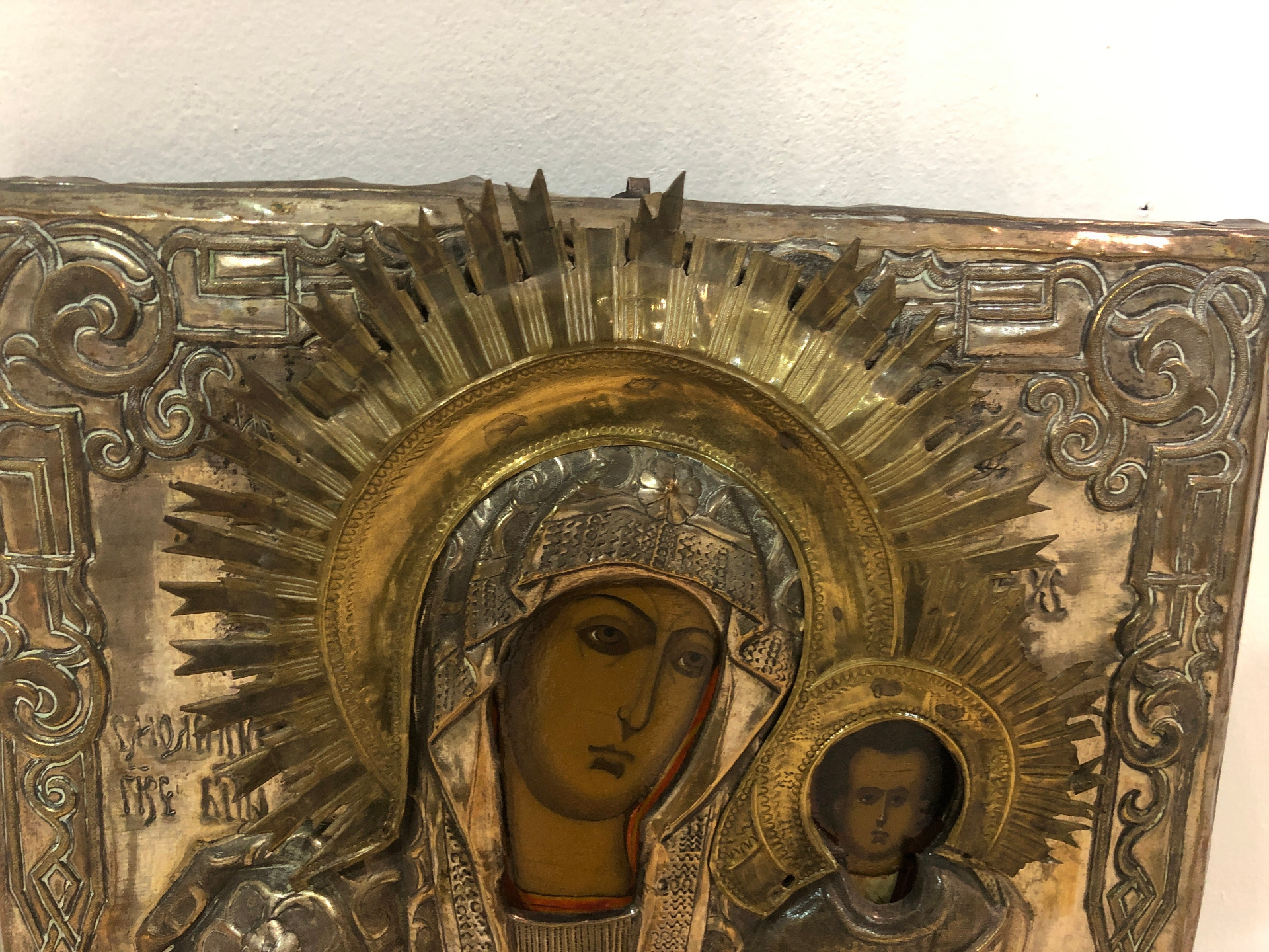 Icon depicting the Madonna and Child, painting on wood panel, embossed silver-plated copper Riza, 19th century