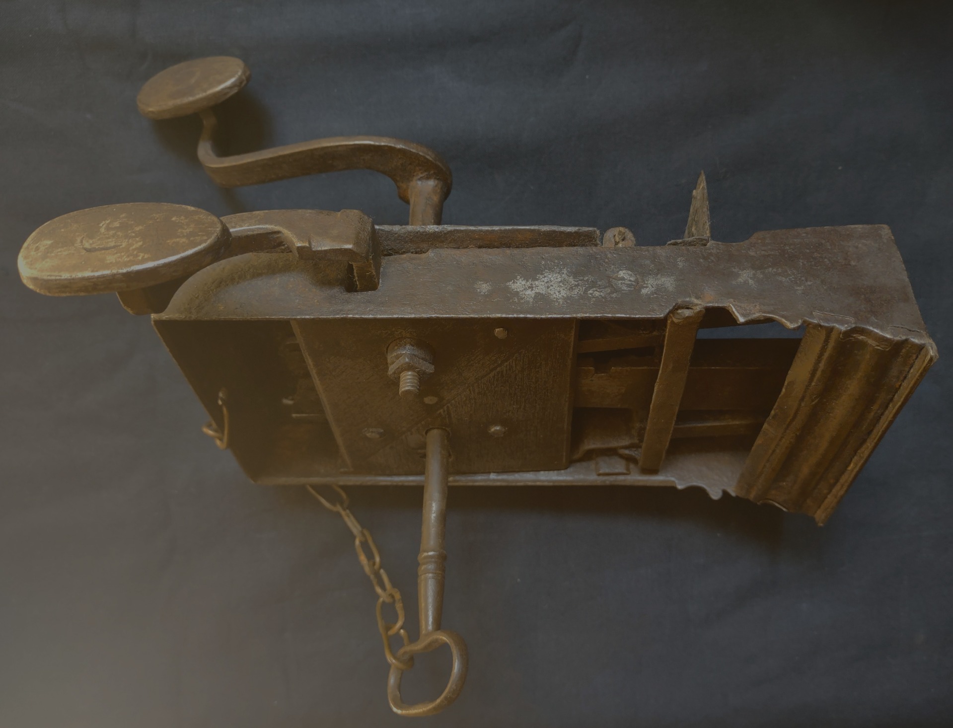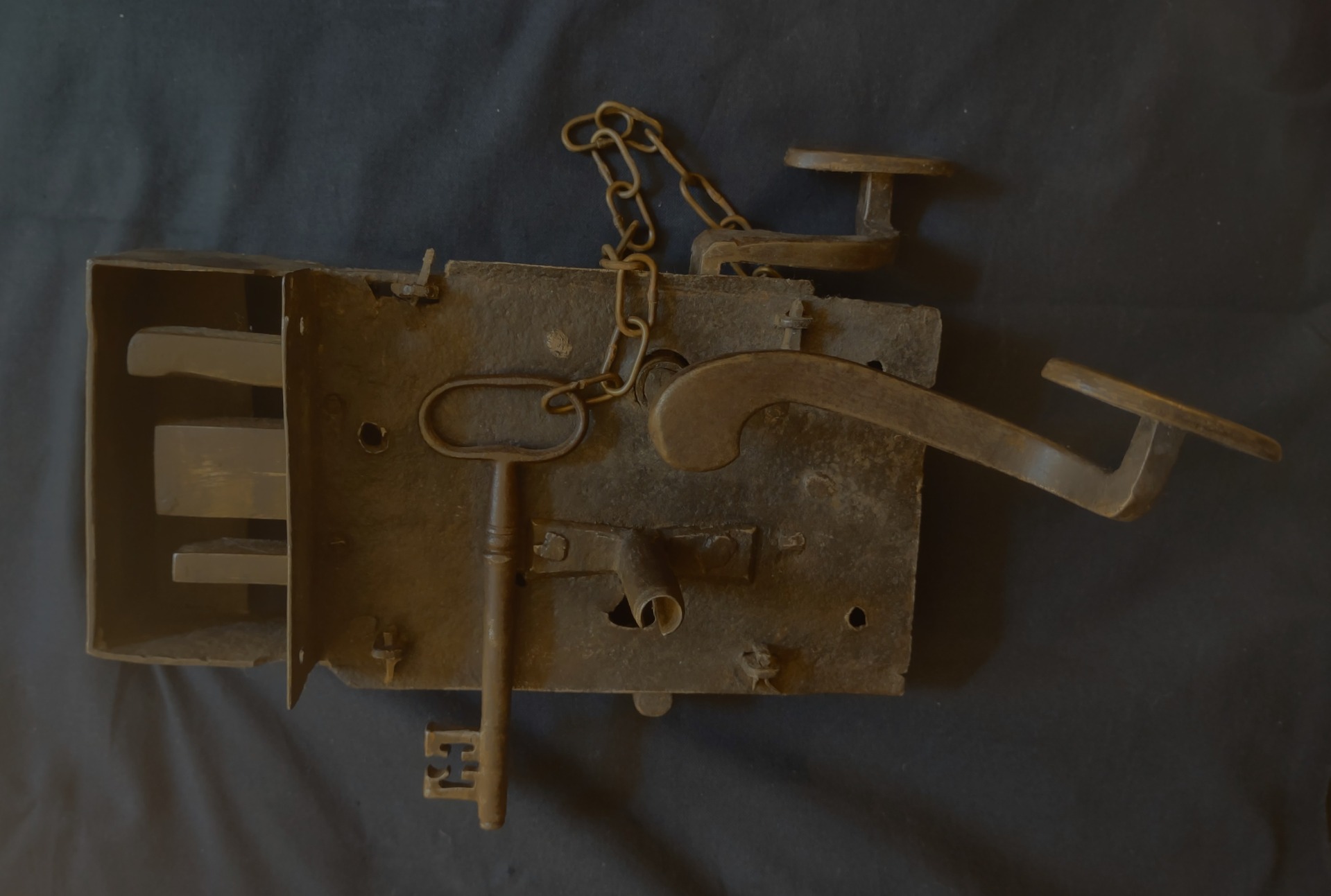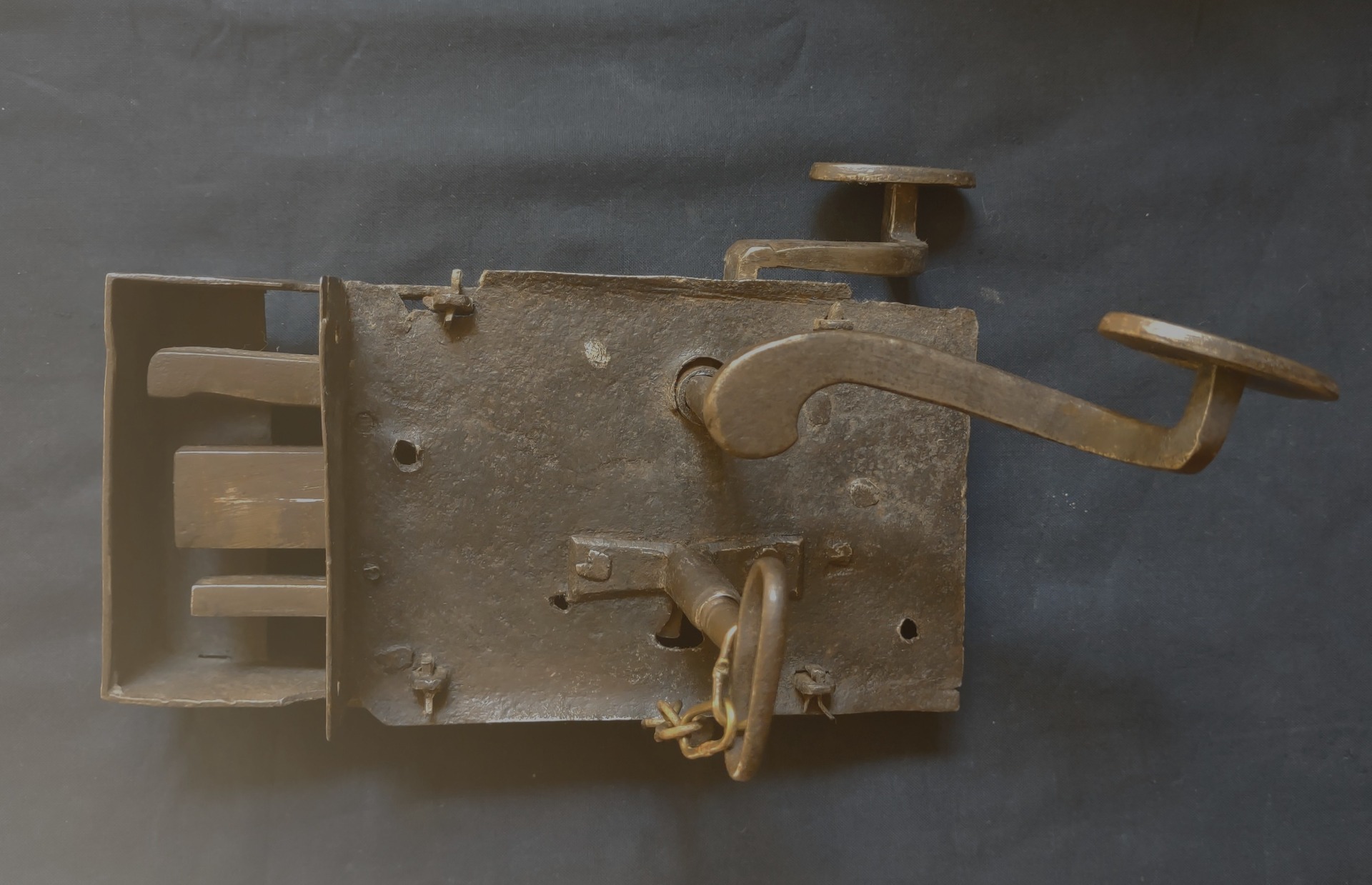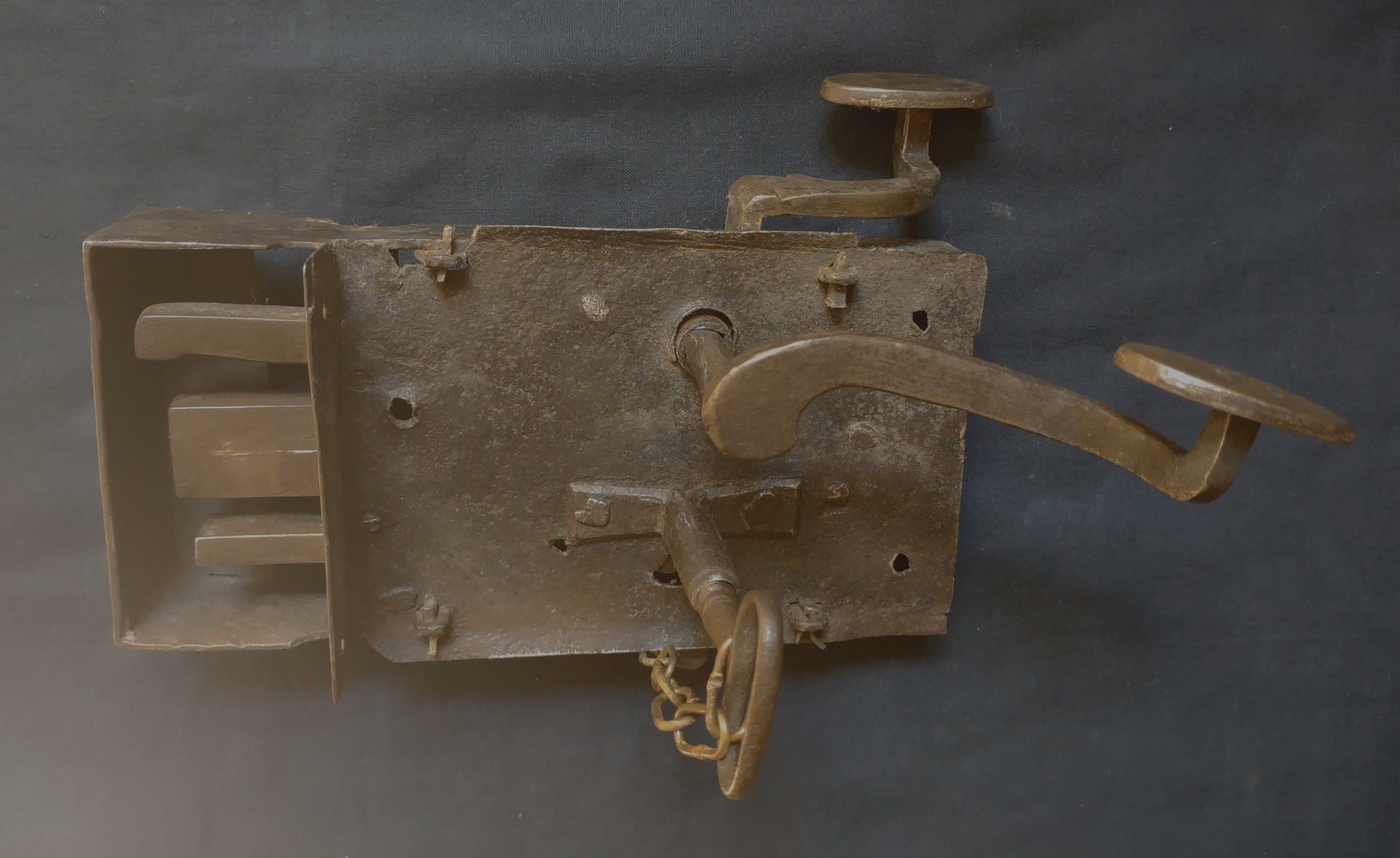 Forged iron door lock, complete with handles for opening on both sides, original working key, lower bolt usable only from the inside. Northern Italy, 17th century. Dimensions: length 20cm, height 14 cm, depth 14 cm. Key: 11 cm.