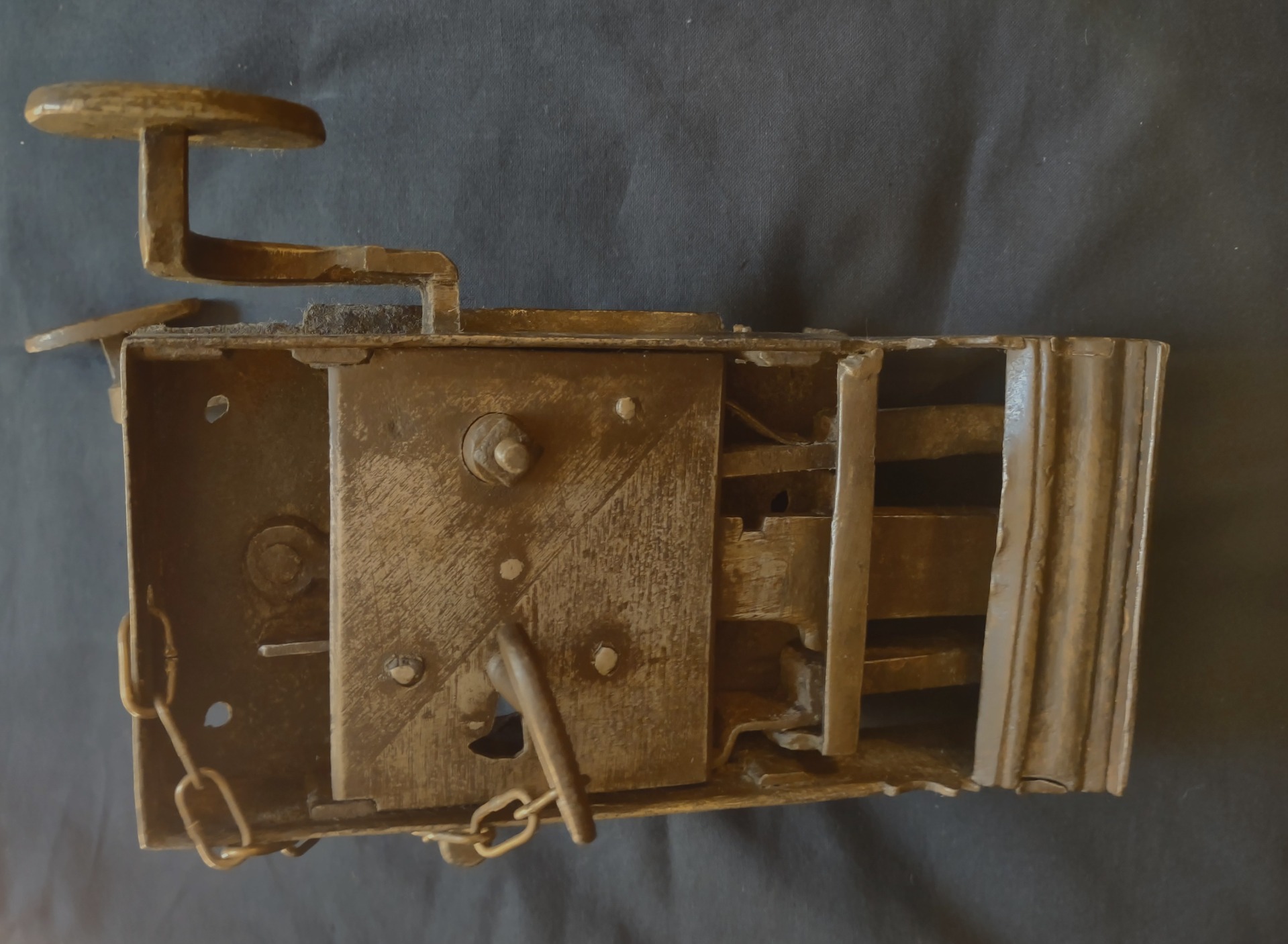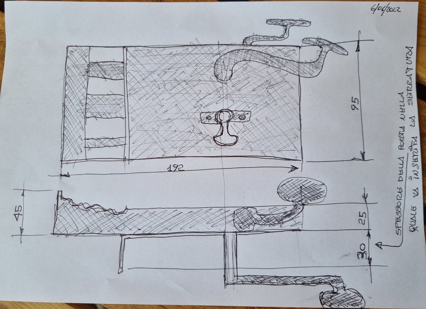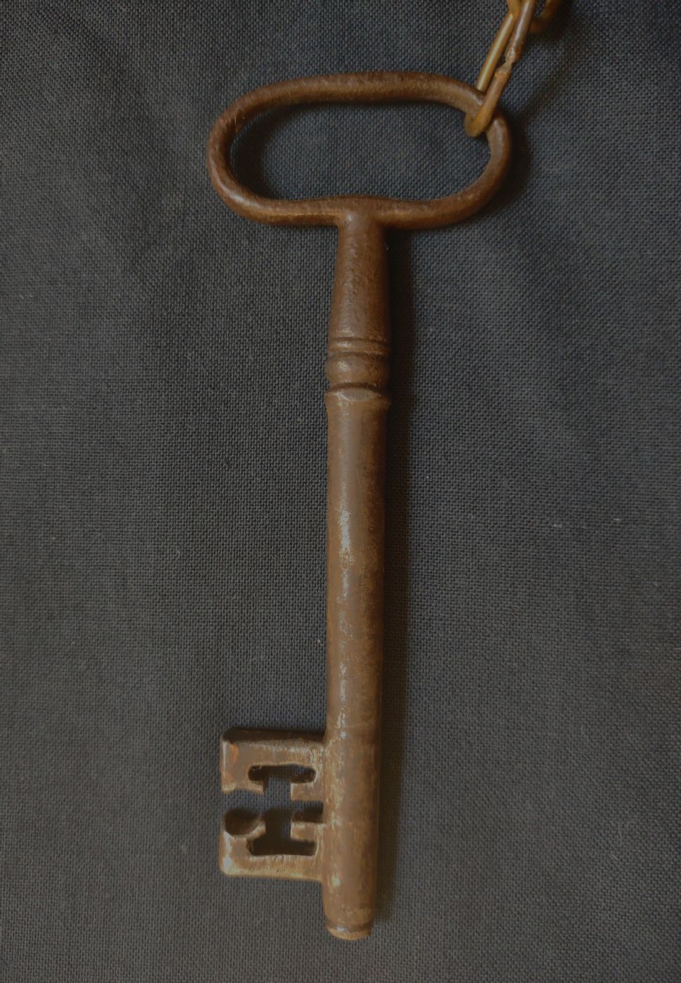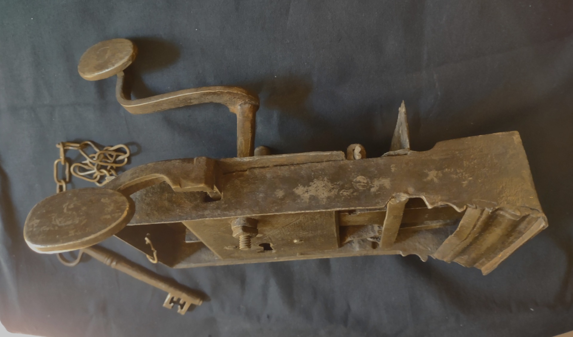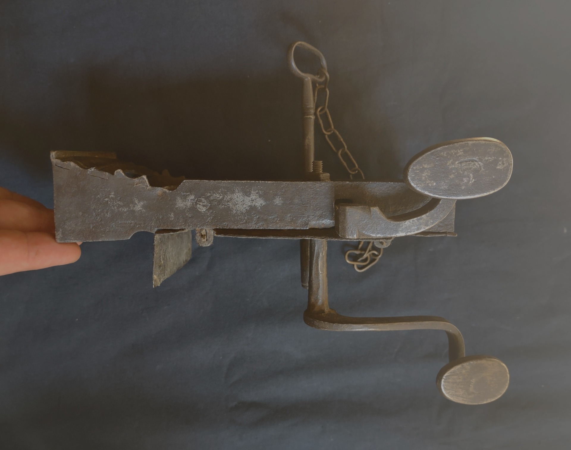 Forged iron door lock, complete with handles for opening on both sides, original working key, lower bolt usable only from the inside. Northern Italy, 17th century. Dimensions: length 20cm, height 14 cm, depth 14 cm. Key: 11 cm.