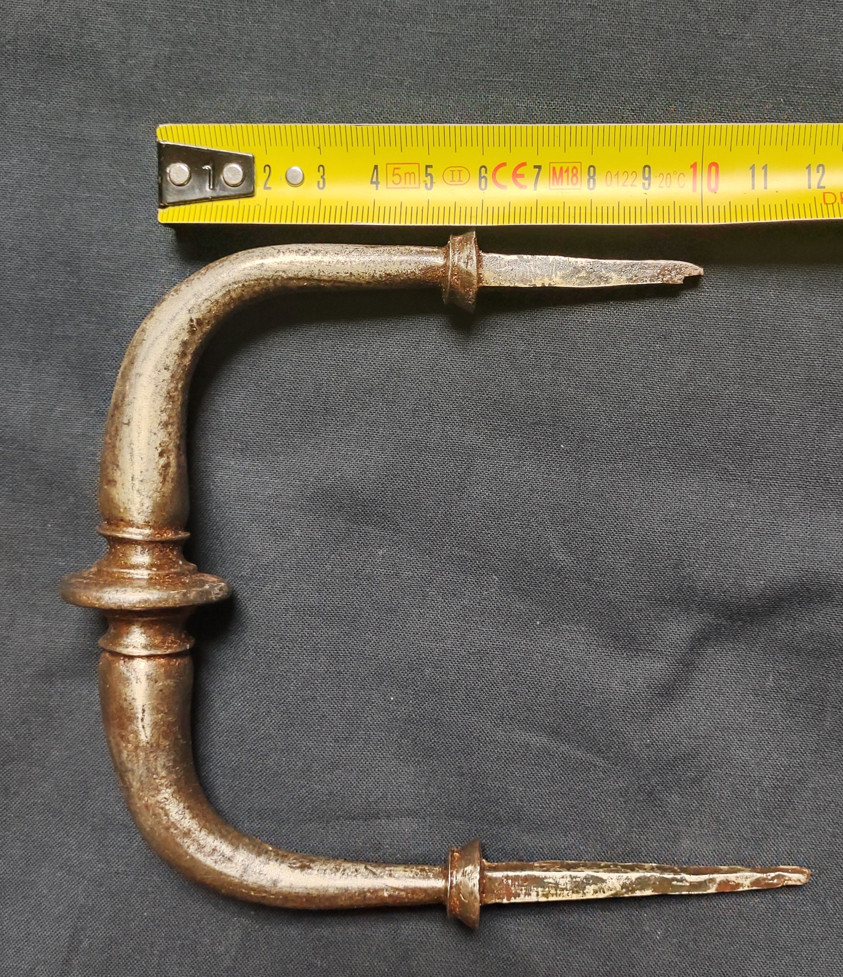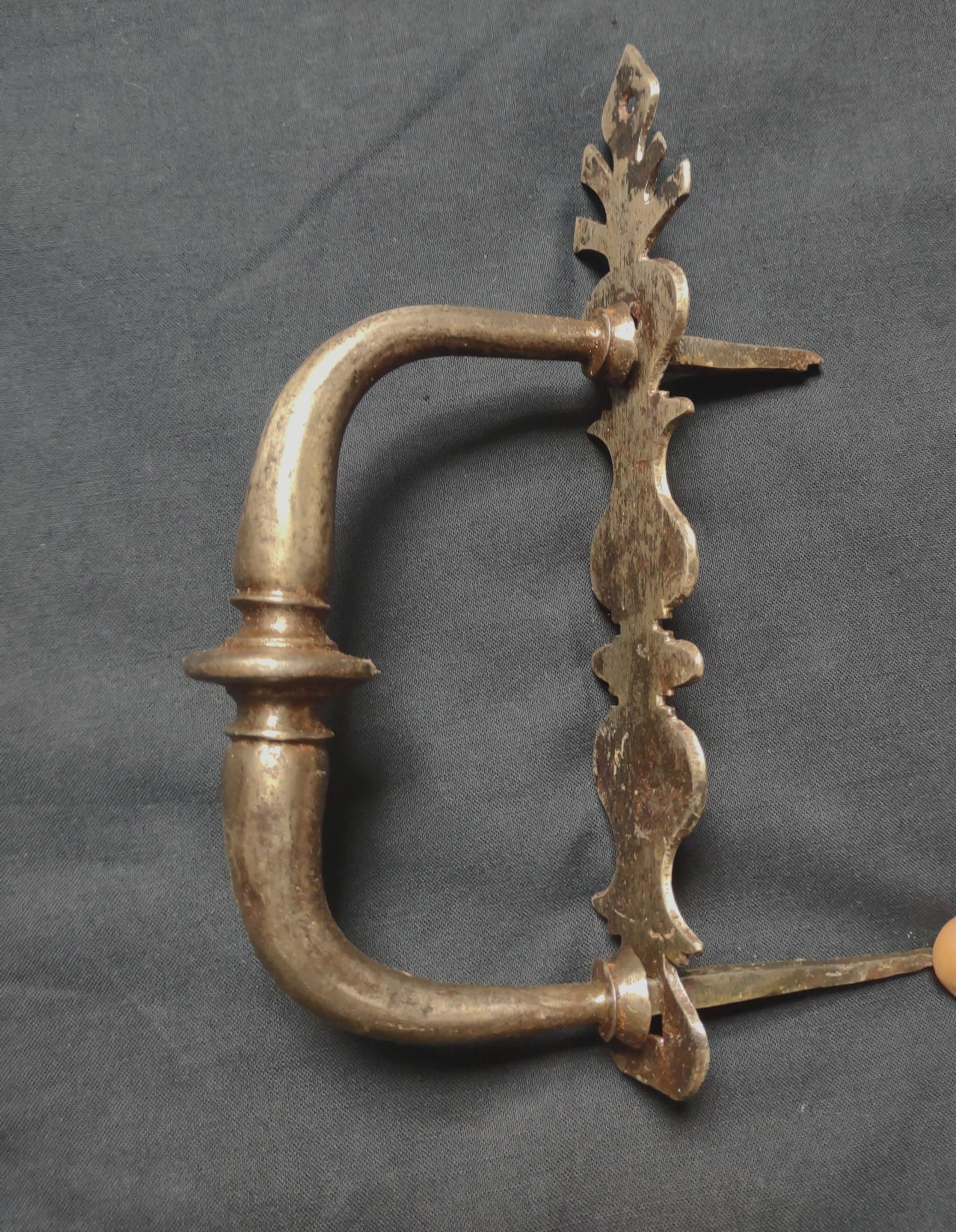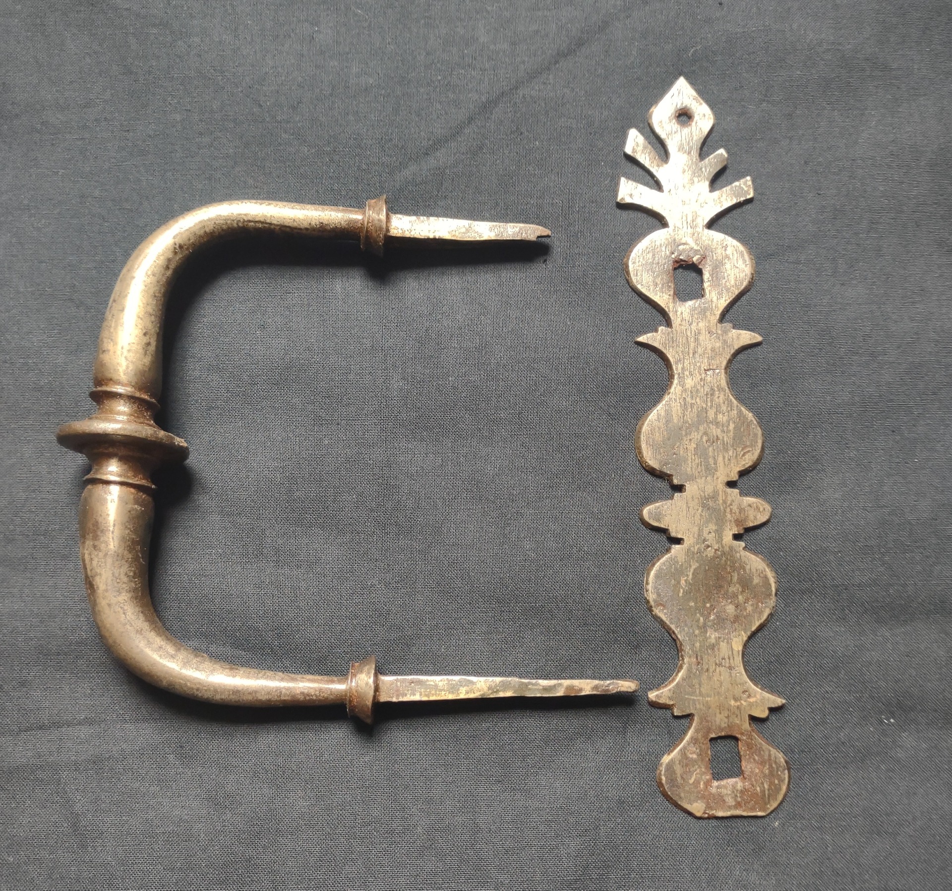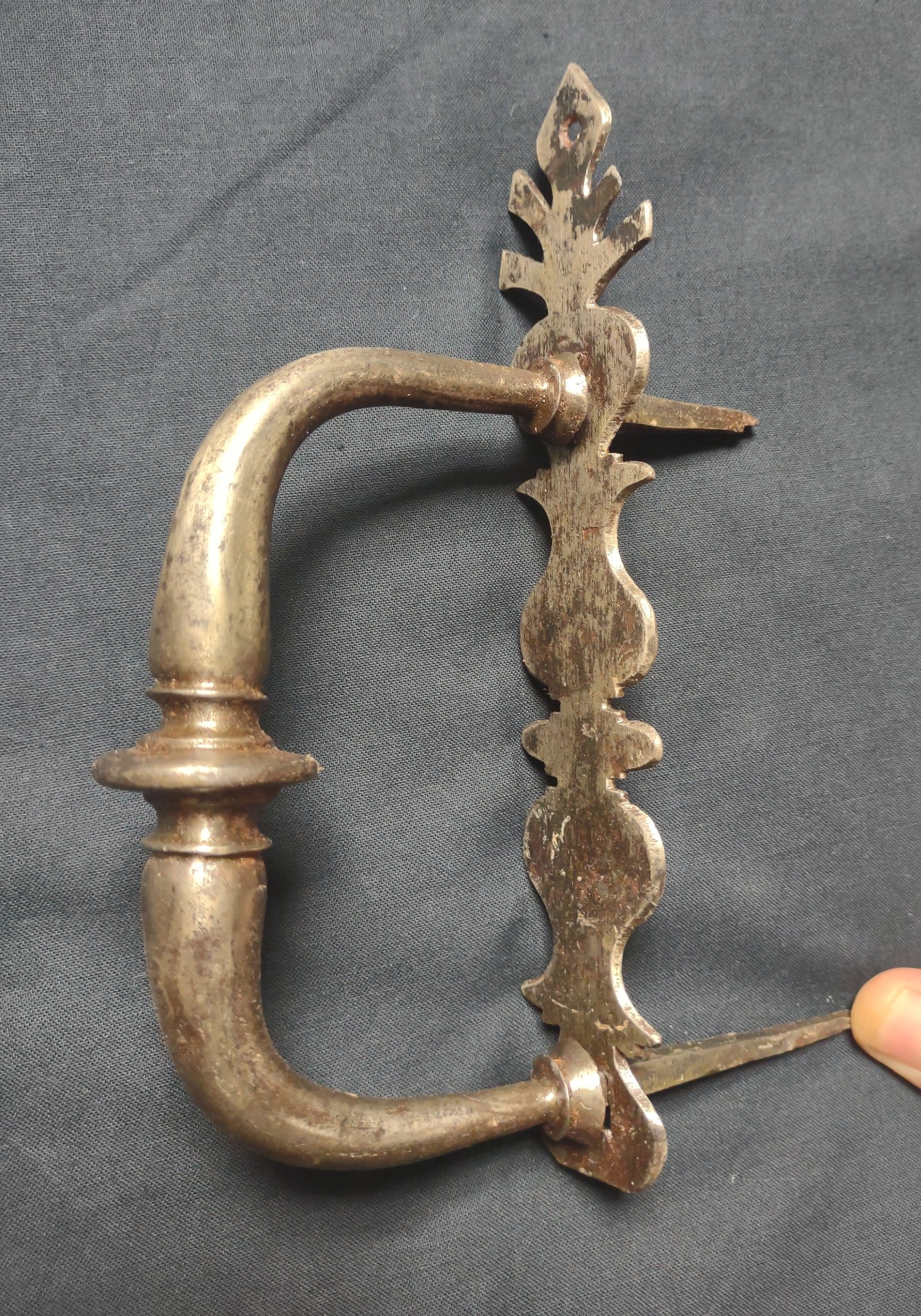 Beautiful wrought iron door handle in good condition, ready for mounting. The lower end of the plate is missing. Height 12 cm, depth 5.5 cm