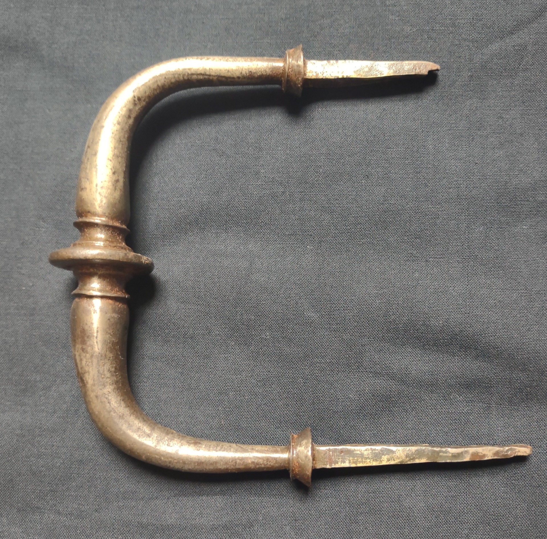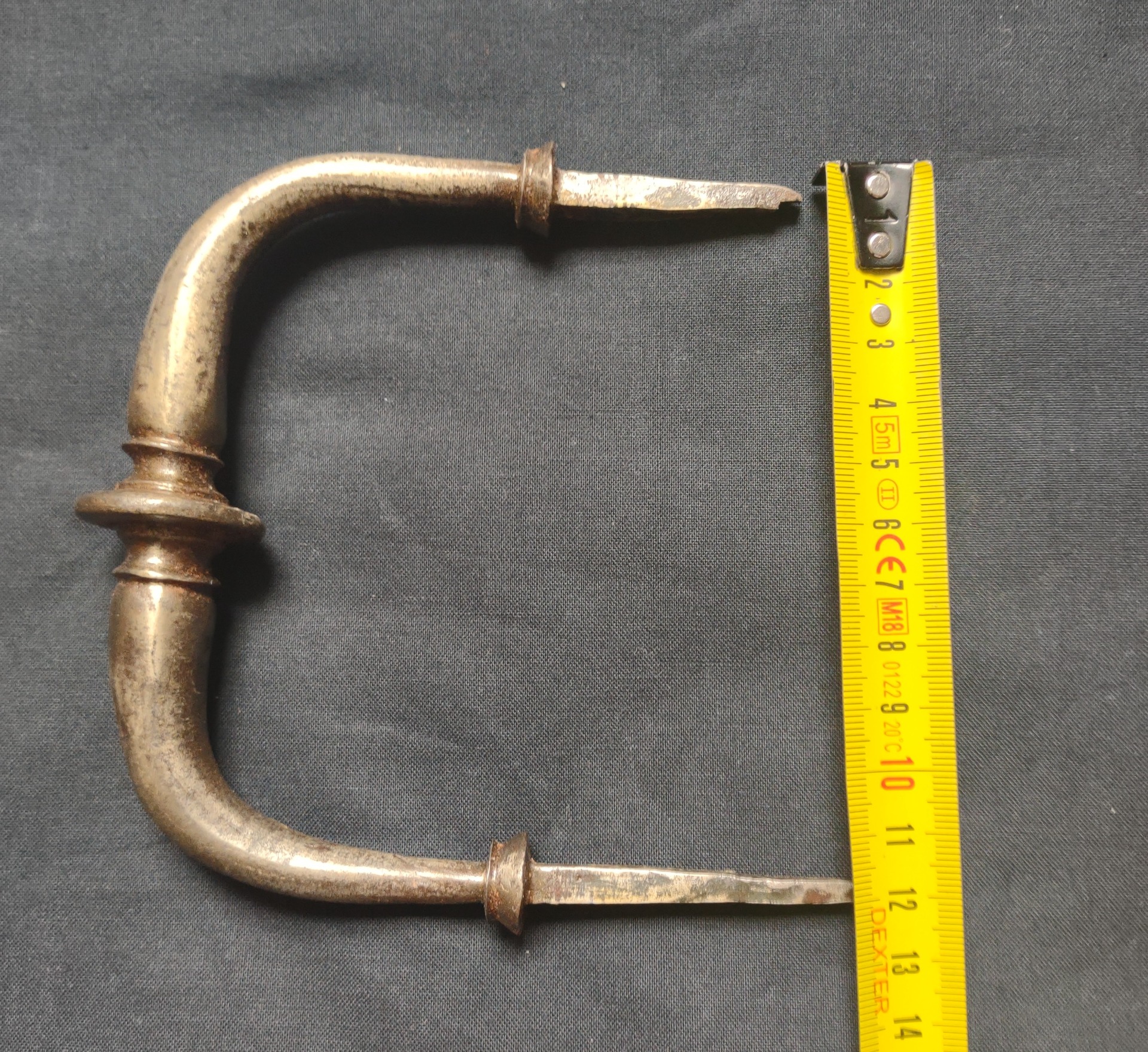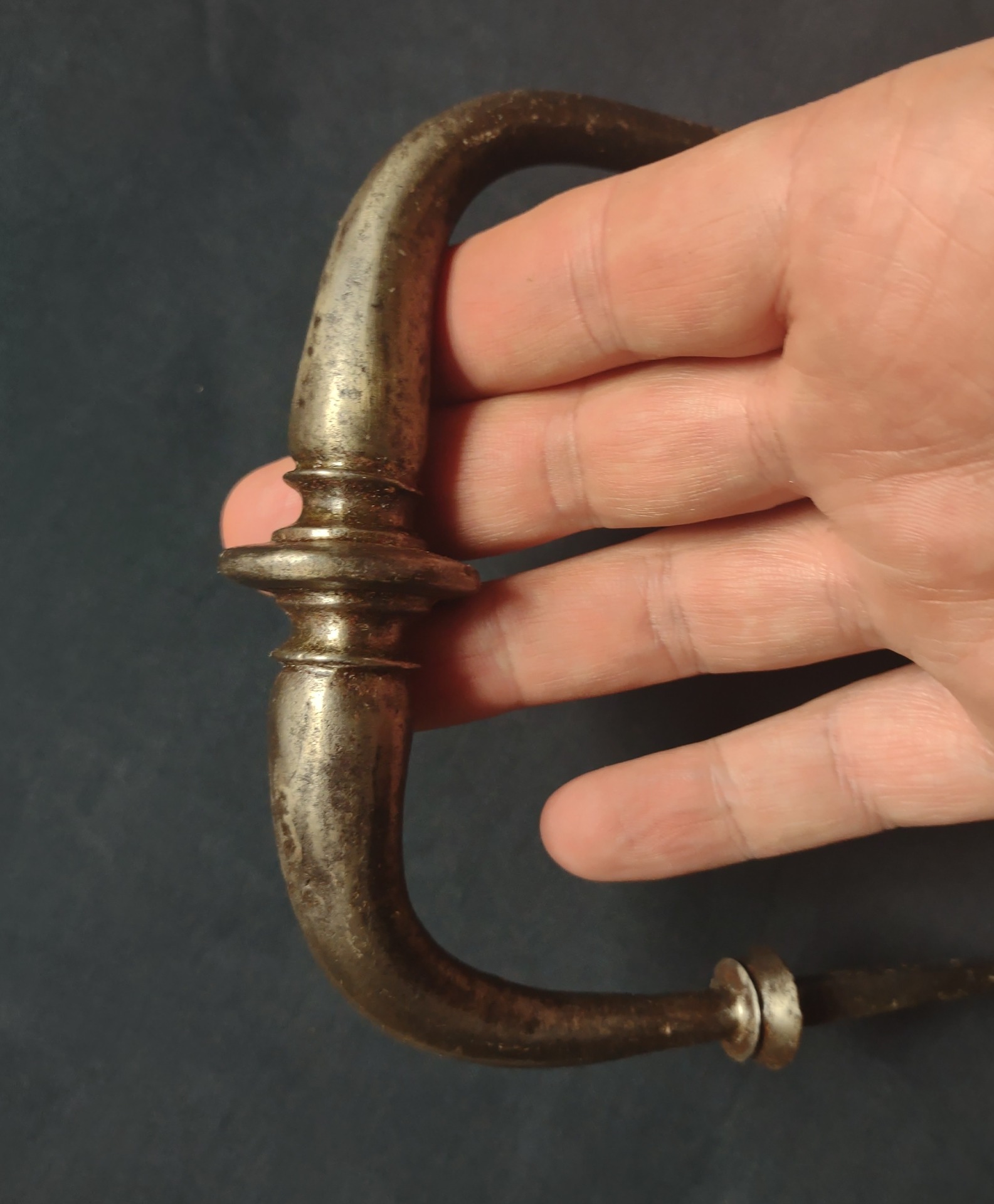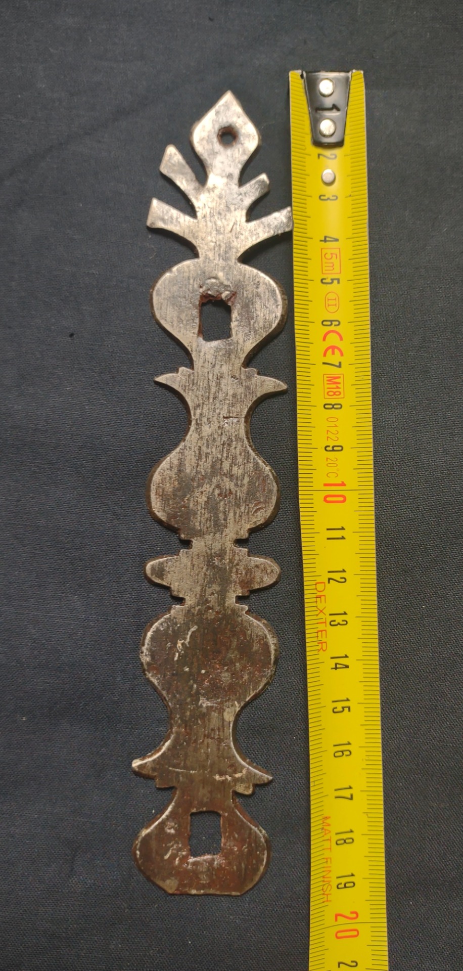 Beautiful wrought iron door handle in good condition, ready for mounting. The lower end of the plate is missing. Height 12 cm, depth 5.5 cm