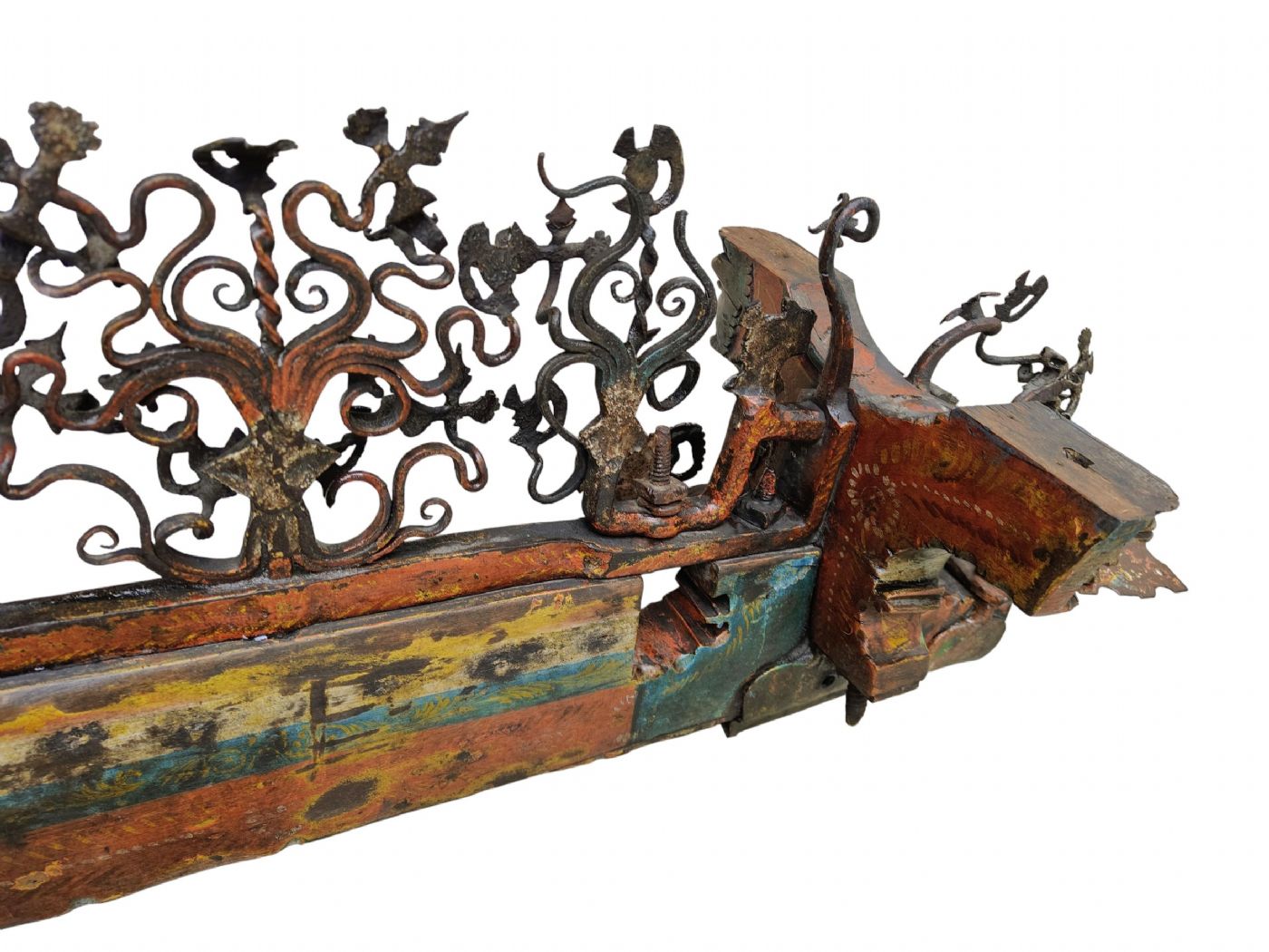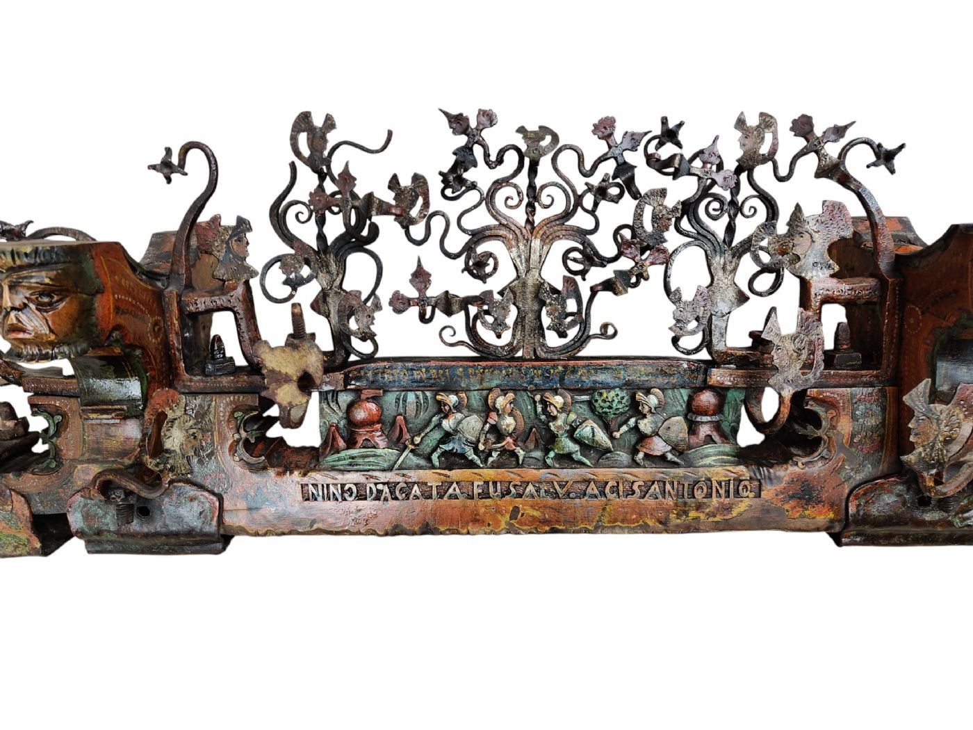 Bel cassafuso di carretto siciliano, realizzato dalla famiglia D'Agata di Aci Sant'Antonio. La famiglia D'Agata è stata la prima conosciuta ad introdurre nel XIX secolo la professione di mastro carrettiere ad Aci Santantonio, ritenuta una delle "capitali" del carretto siciliano. Questo cassafuso (elemento decorativo che collega le 2 ruote posteriori del carro) è di eccellente qualità scultorica e conserva la quasi totalità della policromia originale (molto raro). E' dipinta una data solo parzialmente leggibile (5 maggio sembrerebbe 1931 o 34). Bella la decorazione anche del lato posteriore. Lunghezza 117 cm, profondità 33. Non spedisco,l'oggetto è ingombrante, pesante e delicato. Ritiro a Milano o consegna in zone limitrofe