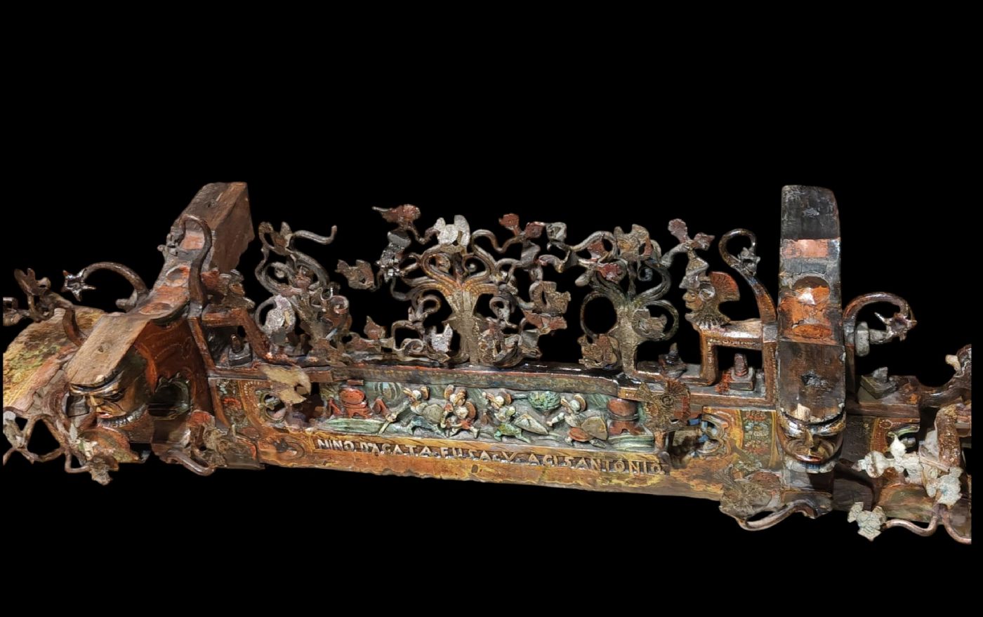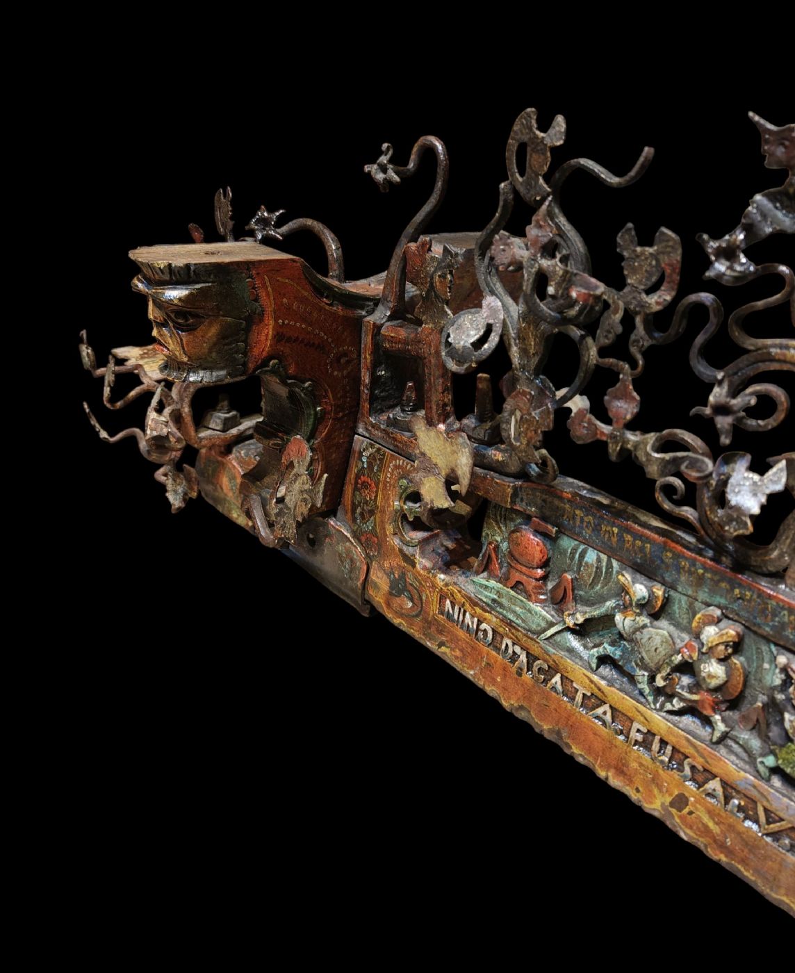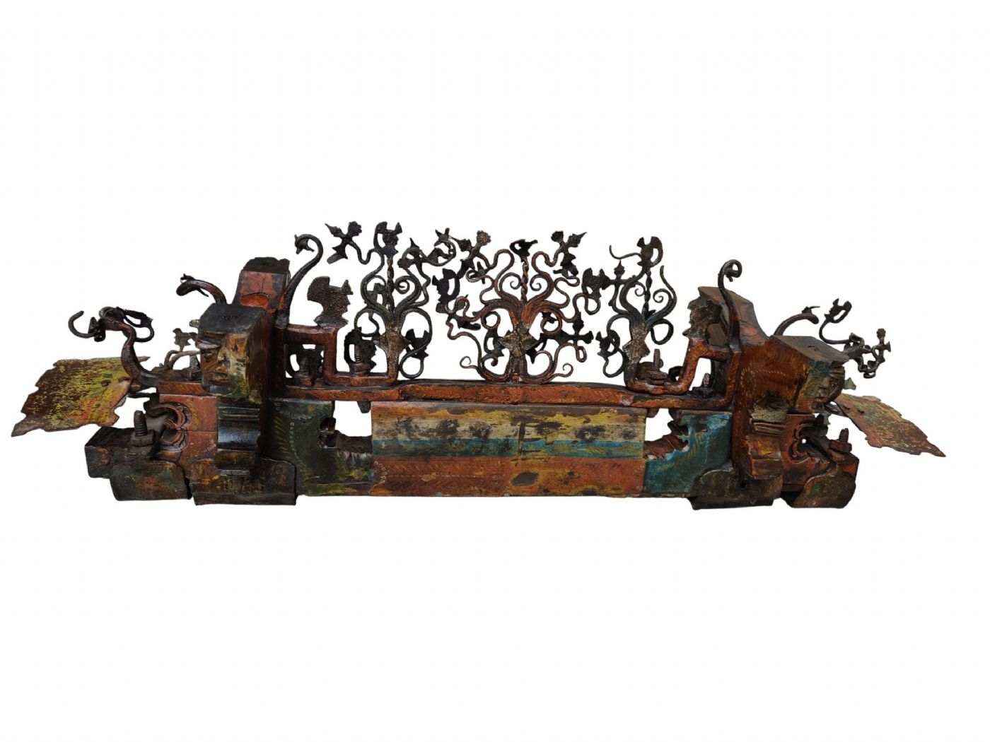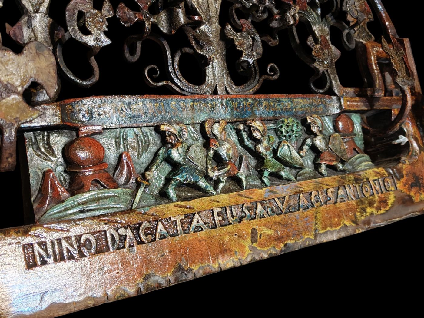 Bel cassafuso di carretto siciliano, realizzato dalla famiglia D'Agata di Aci Sant'Antonio. La famiglia D'Agata è stata la prima conosciuta ad introdurre nel XIX secolo la professione di mastro carrettiere ad Aci Santantonio, ritenuta una delle "capitali" del carretto siciliano. Questo cassafuso (elemento decorativo che collega le 2 ruote posteriori del carro) è di eccellente qualità scultorica e conserva la quasi totalità della policromia originale (molto raro). E' dipinta una data solo parzialmente leggibile (5 maggio sembrerebbe 1931 o 34). Bella la decorazione anche del lato posteriore. Lunghezza 117 cm, profondità 33. Non spedisco,l'oggetto è ingombrante, pesante e delicato. Ritiro a Milano o consegna in zone limitrofe