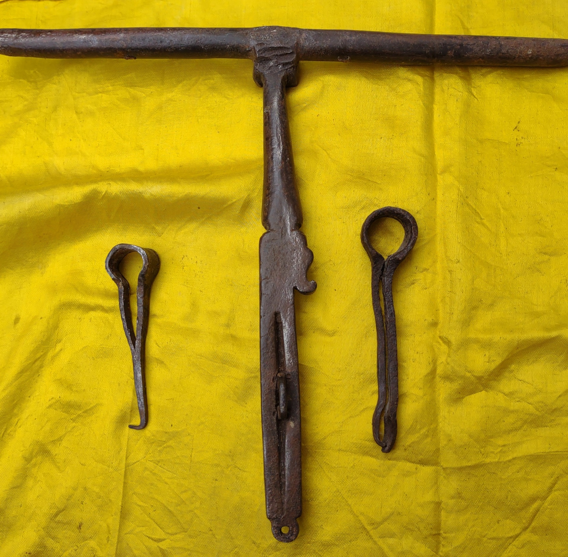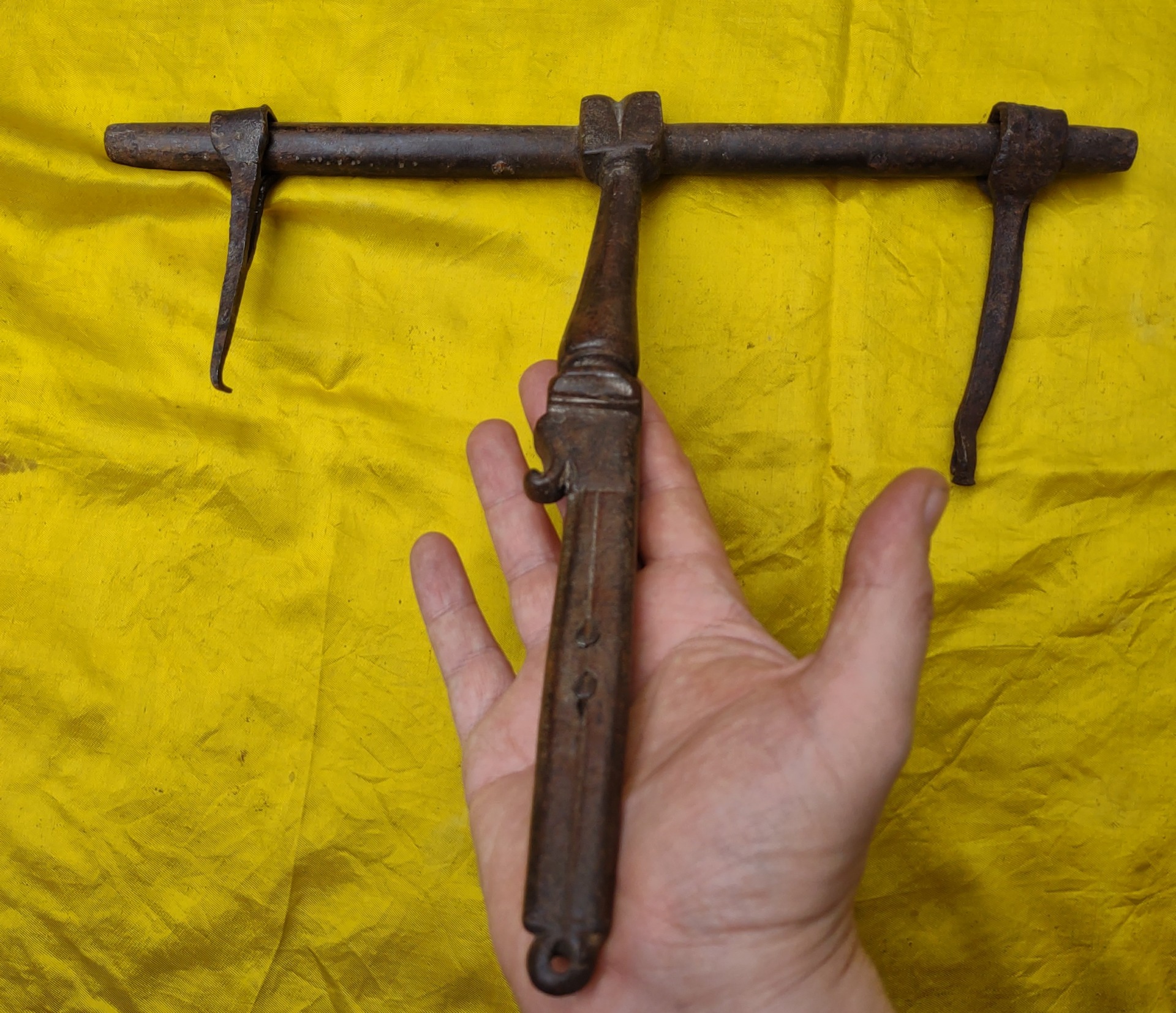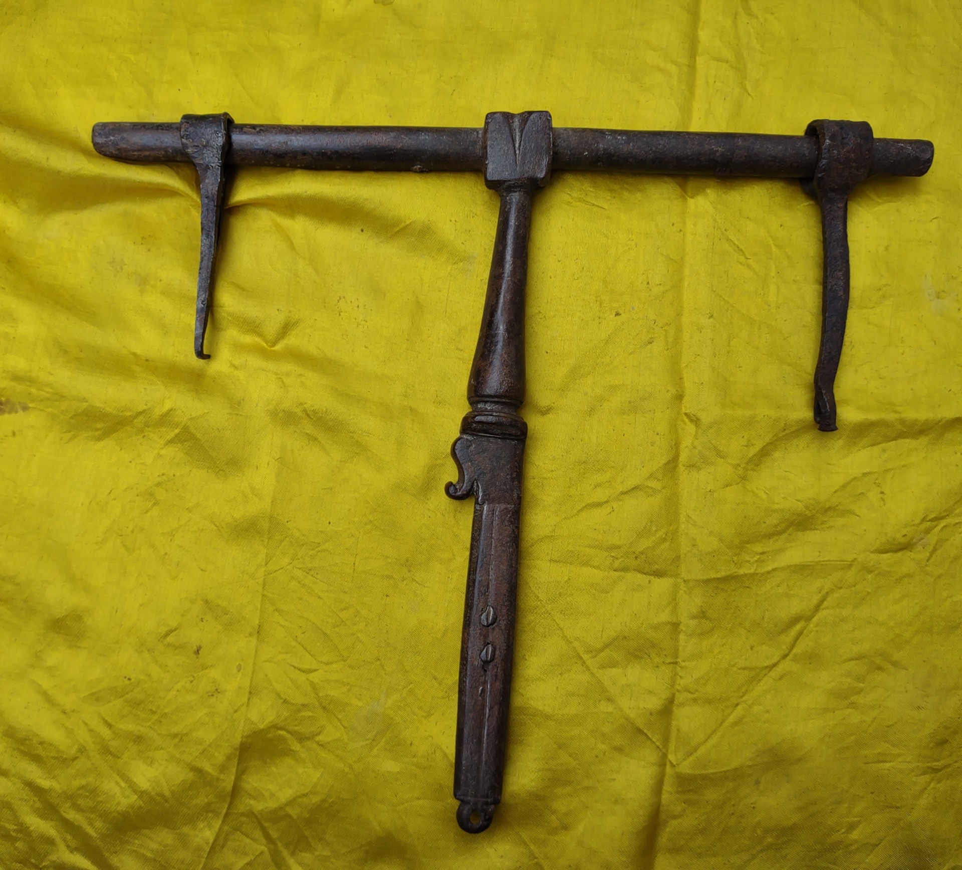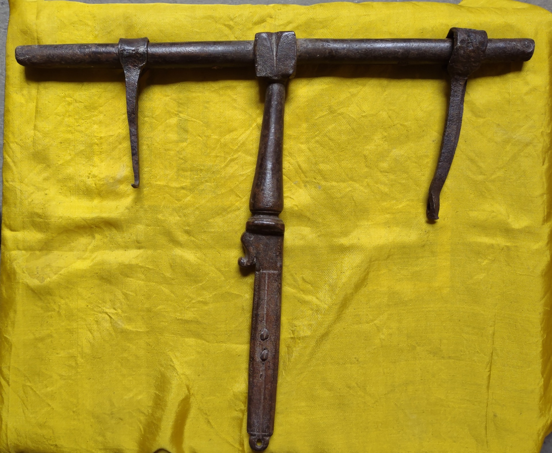 Beautiful wrought iron bolt, complete with 2 irons for fixing. Zoomorphic decoration on the handle. 17th century period, length 33 cm, height 29. Weight 1.5 kg