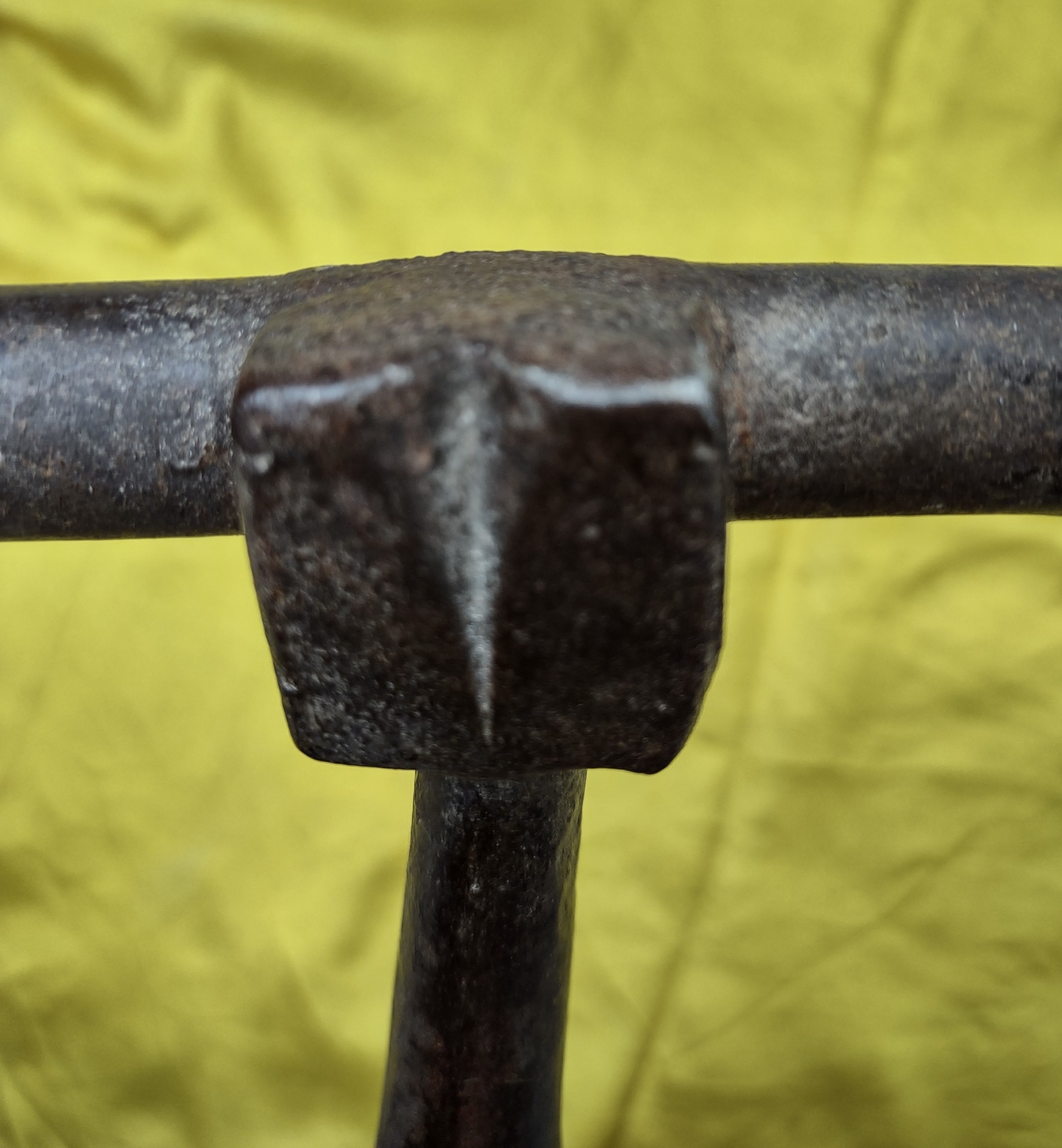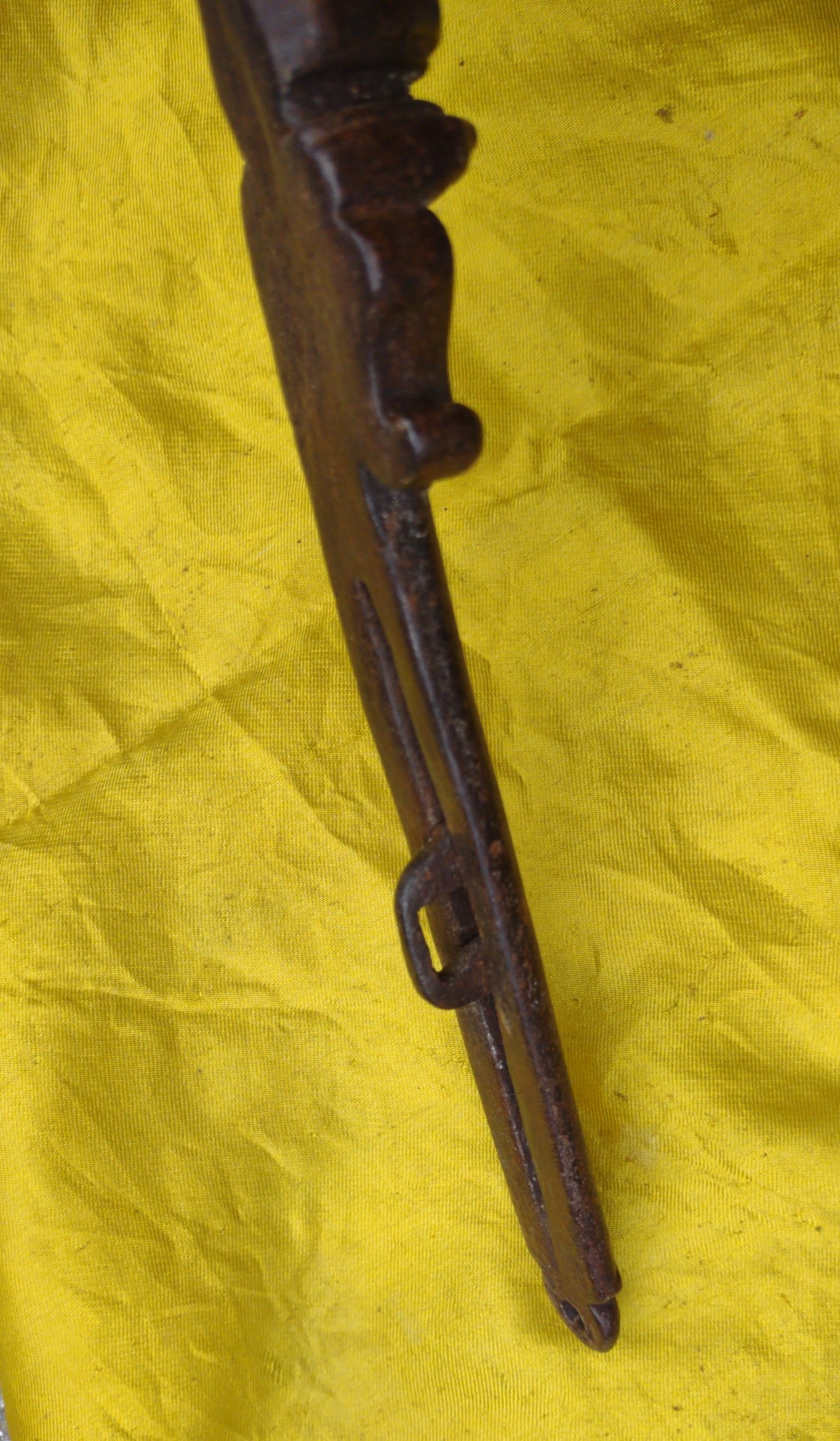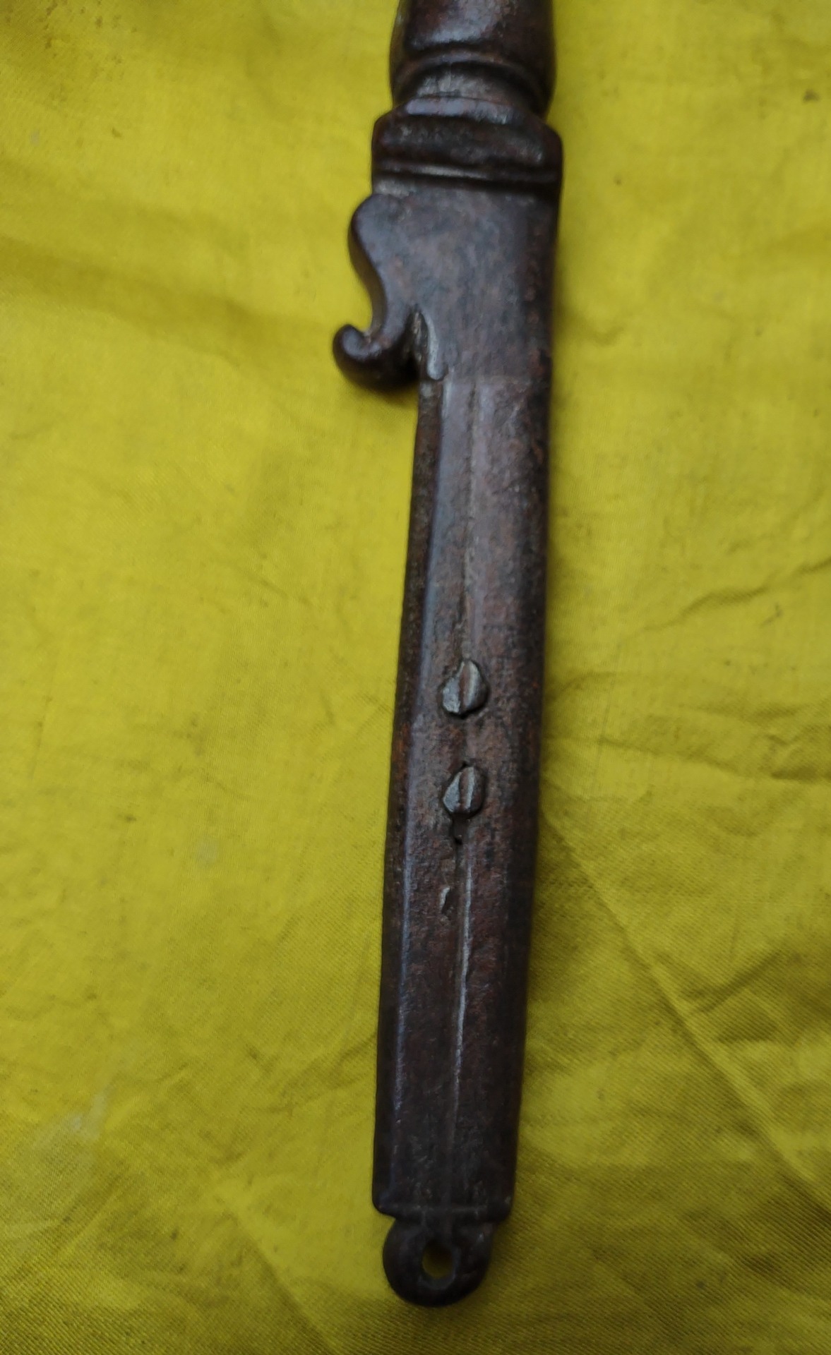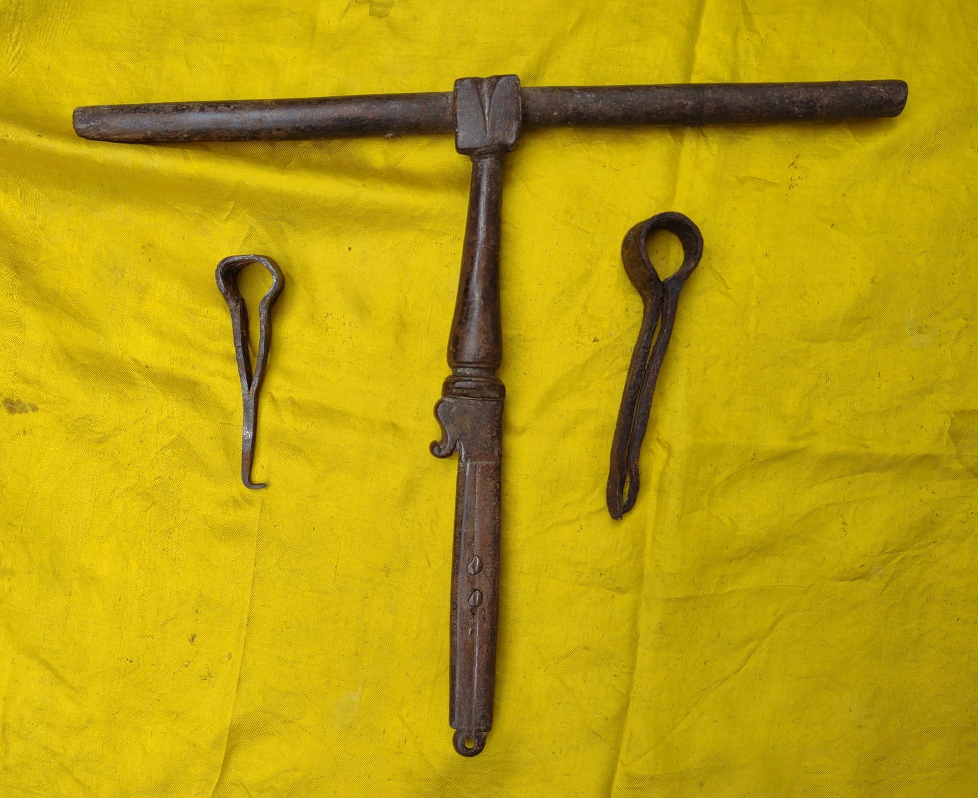 Beautiful wrought iron bolt, complete with 2 irons for fixing. Zoomorphic decoration on the handle. 17th century period, length 33 cm, height 29. Weight 1.5 kg