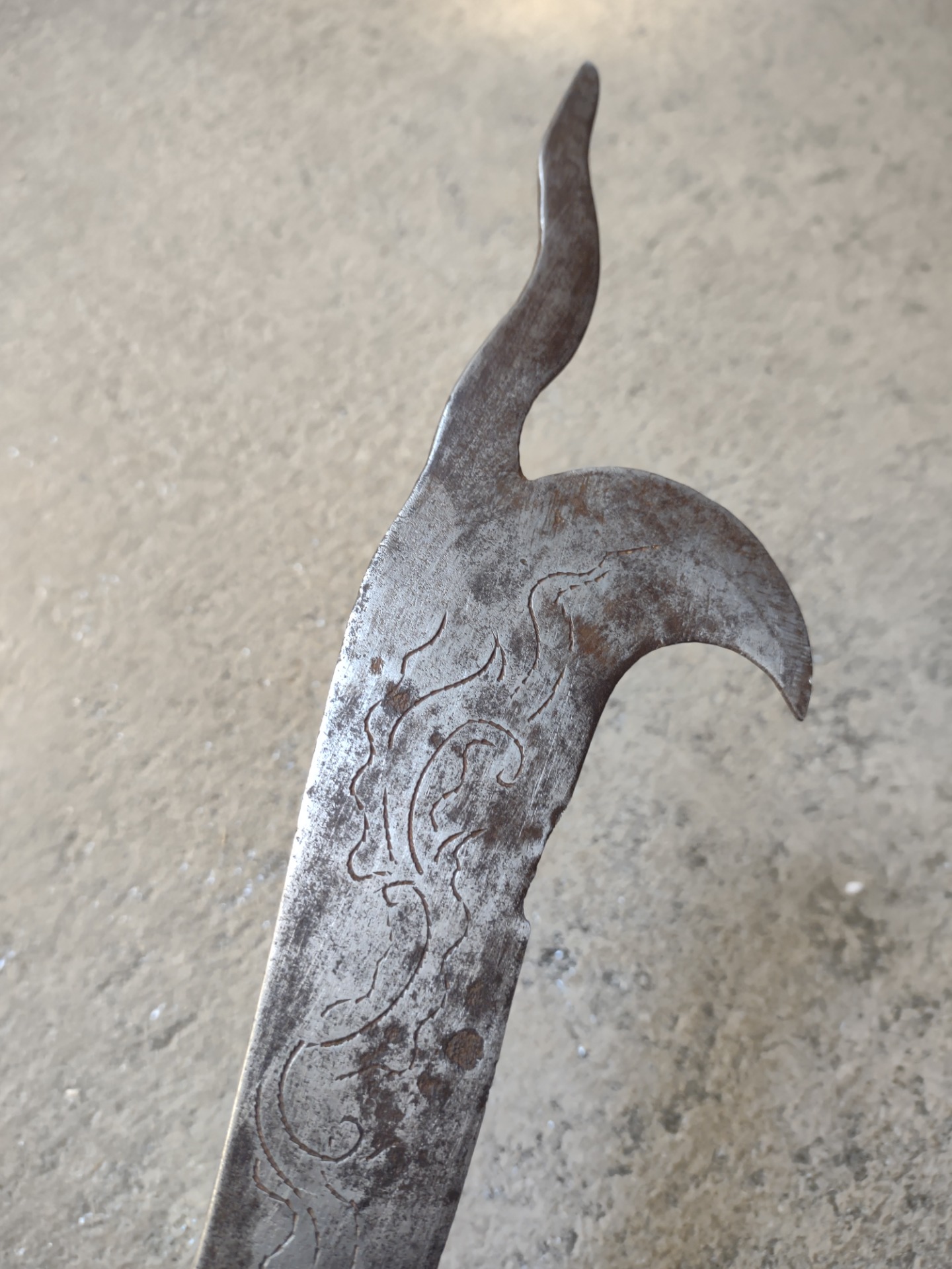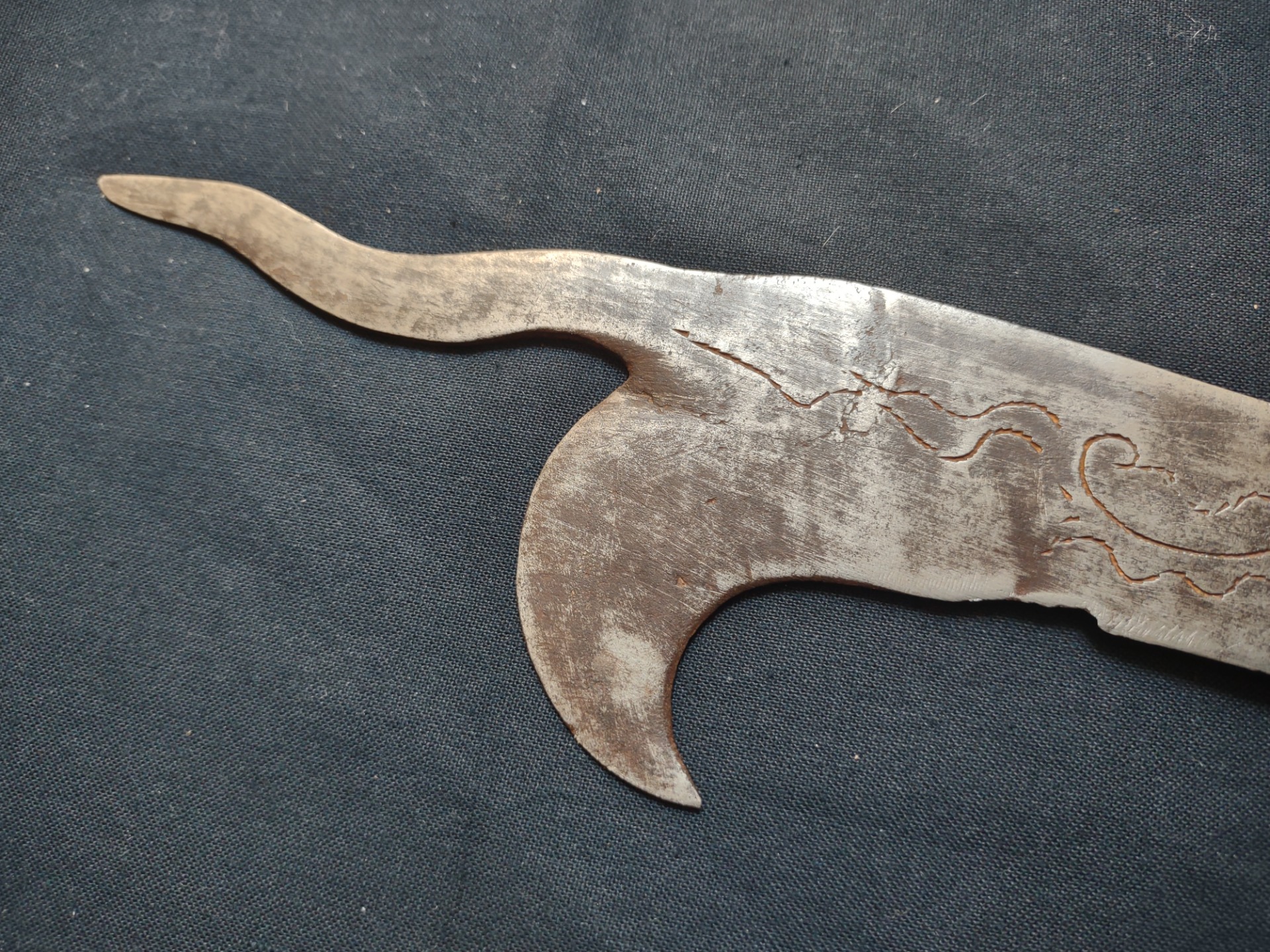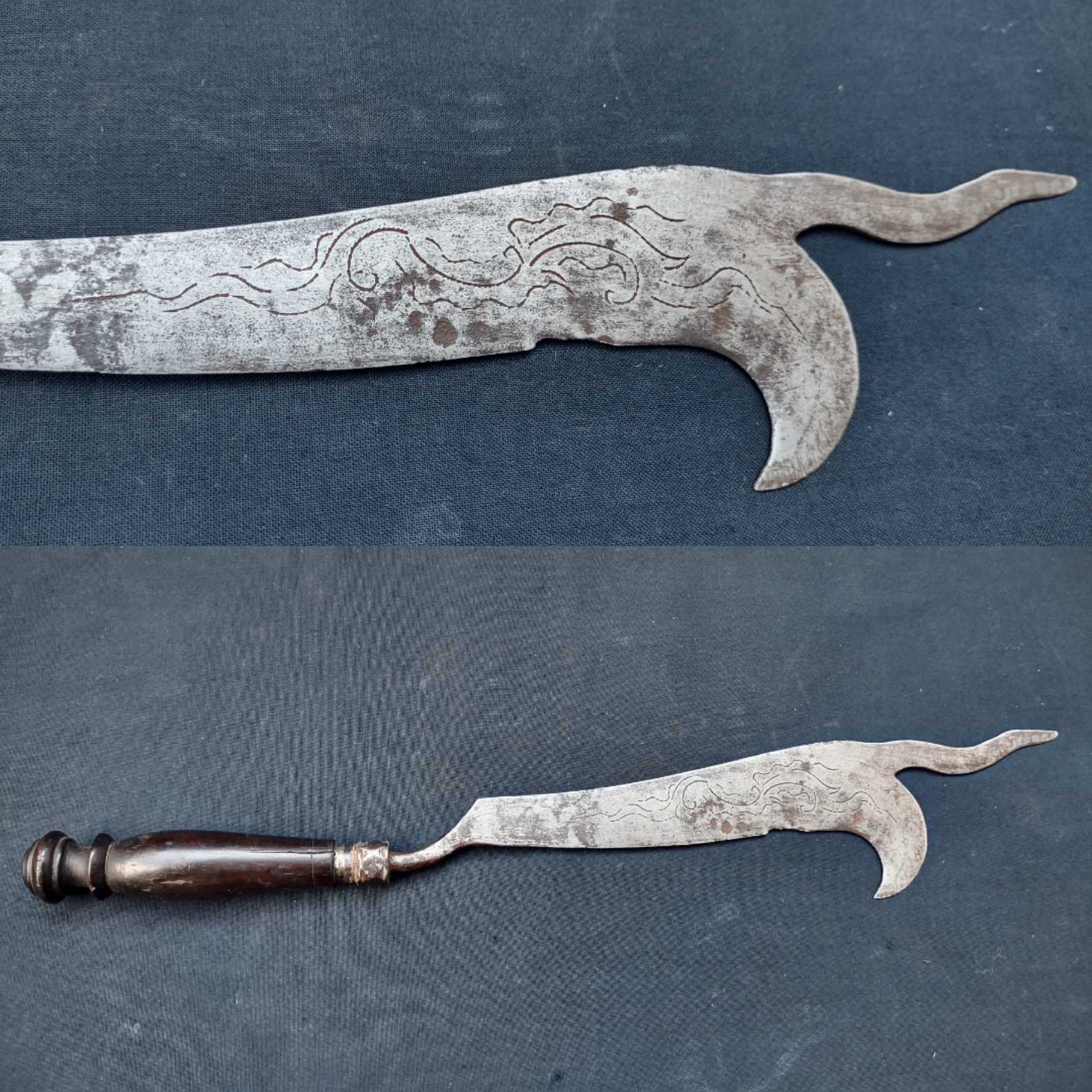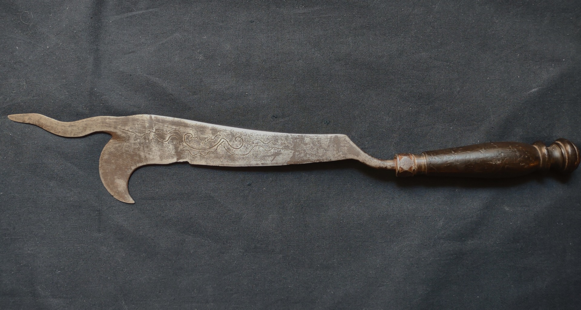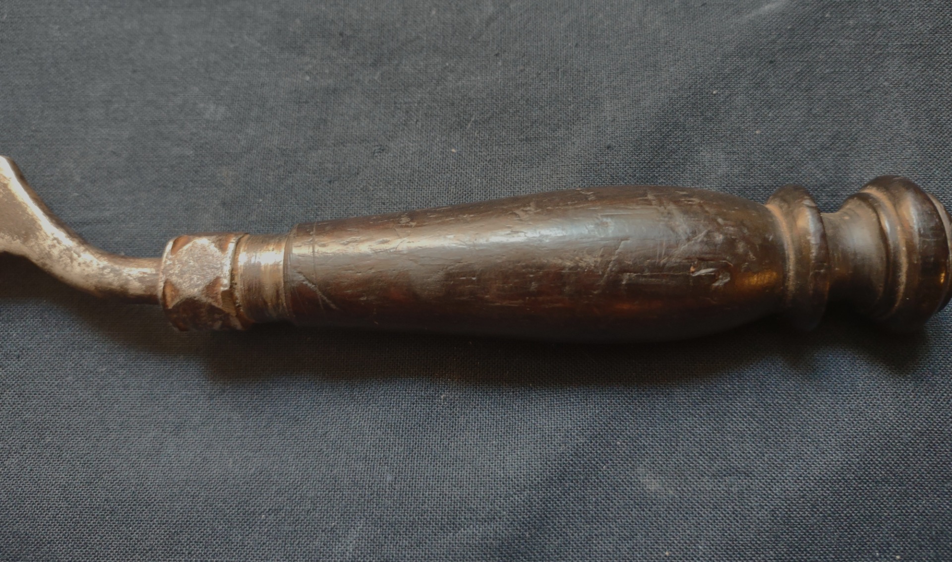 Splendid winegrower's tool in wrought iron and engraved with decorations on both sides. Refined and unusual shape, beautiful ebony handle with diamond-cut fitting. Length 40 cm.
