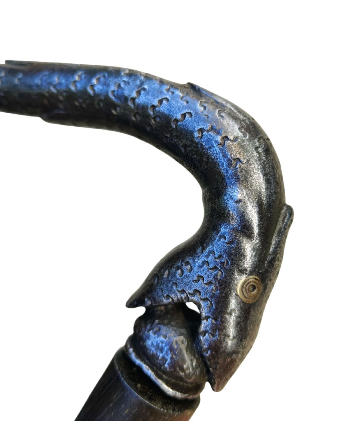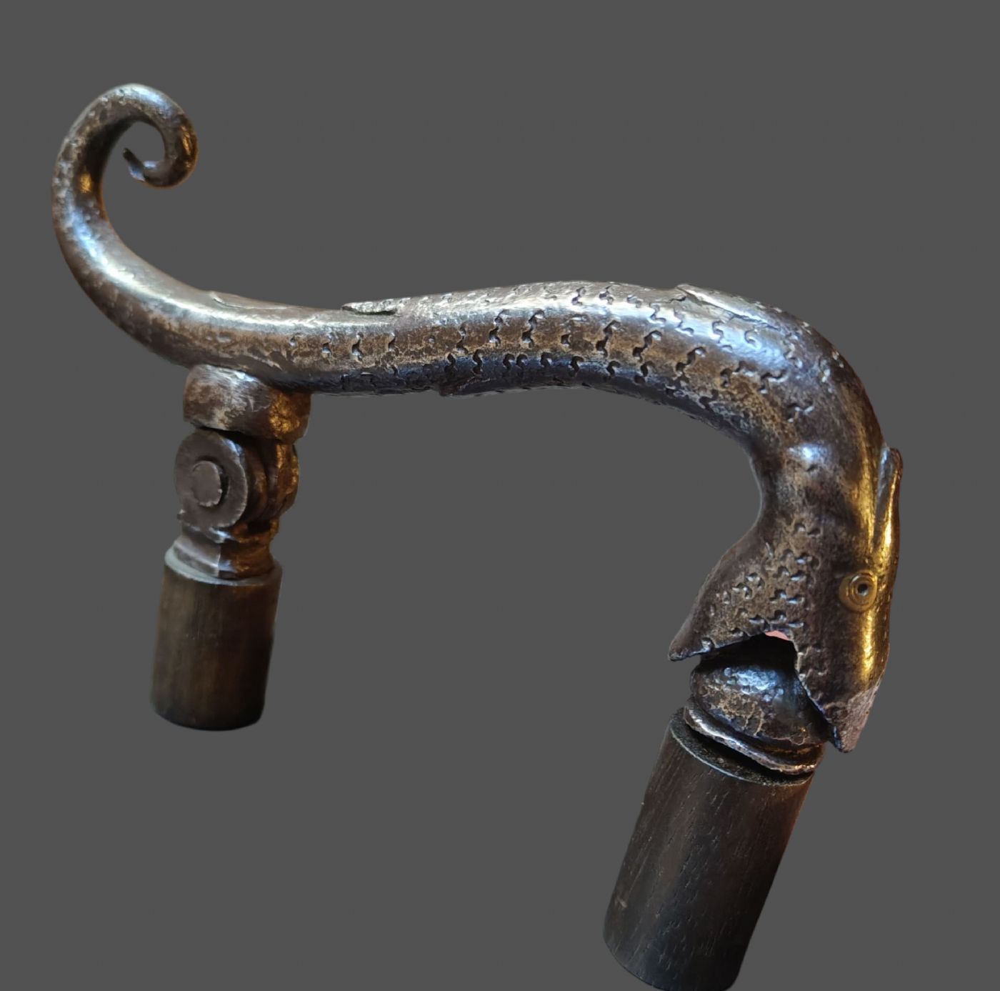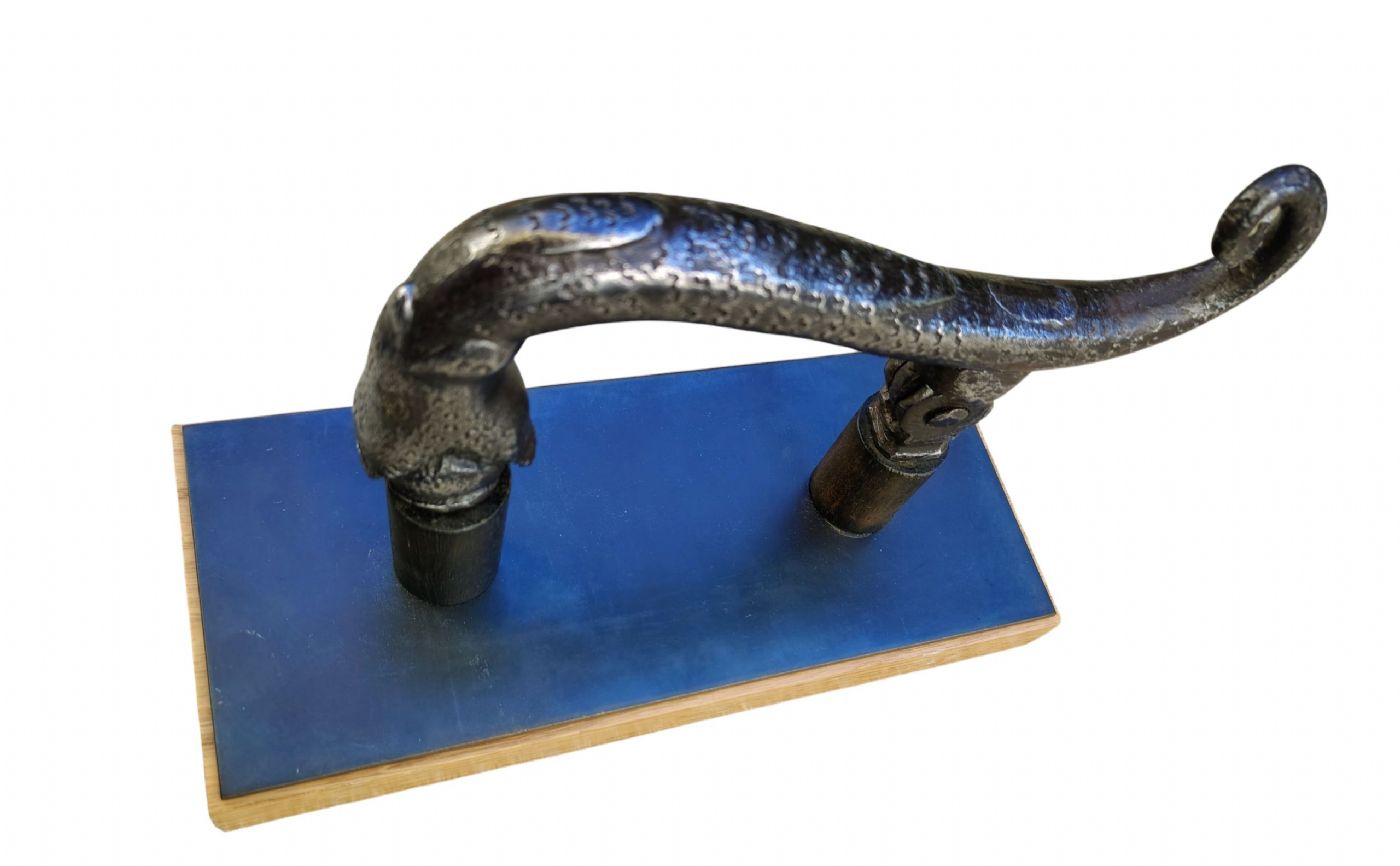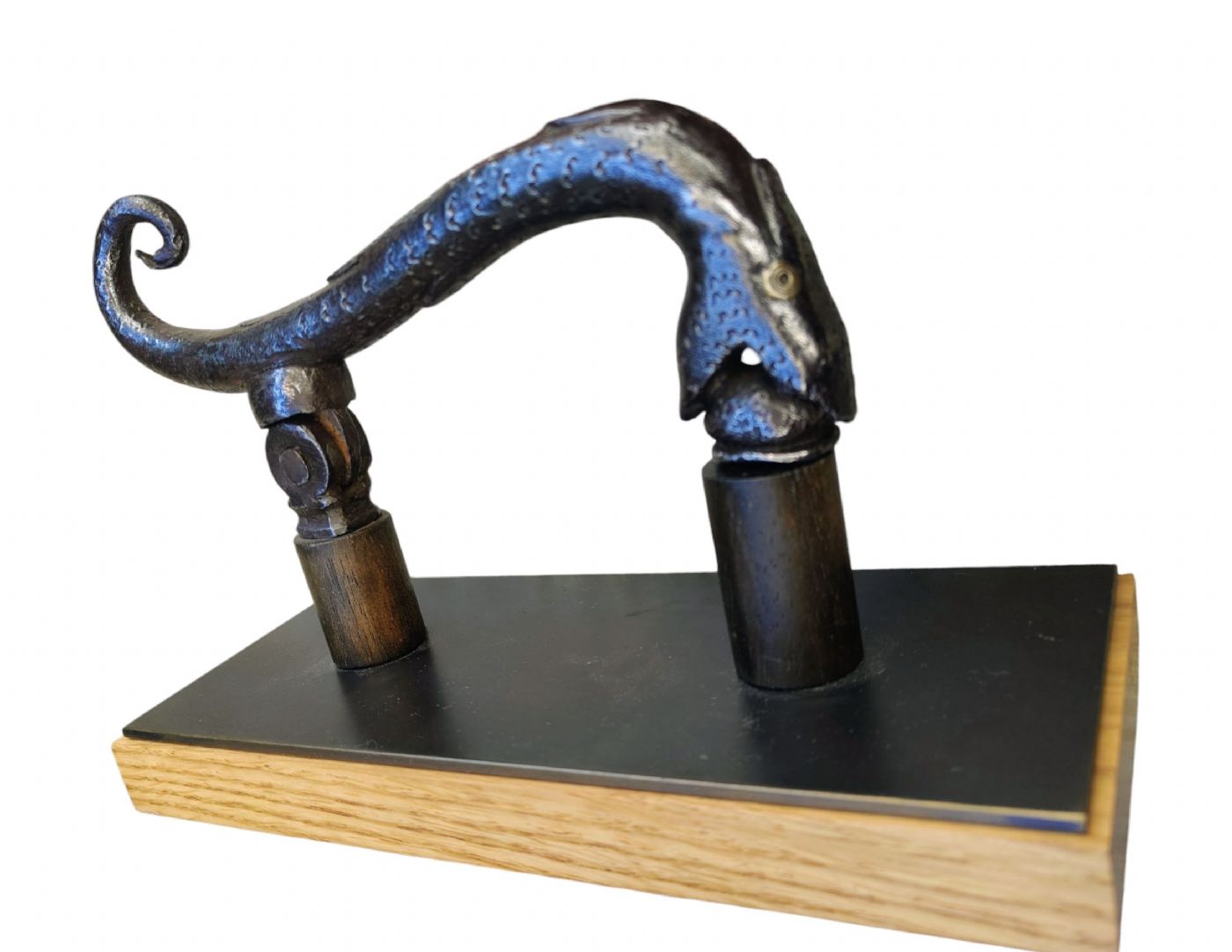Forged and engraved iron knocker shaped like a dragon sculpted in the round with an open mouth and curled tail, brass eyes (cm 19x9x2.5) mounted on a modern wooden and metal base. Italy 17th century.Published work, from the Cesati collection (expertise of the famous antique dealer included).