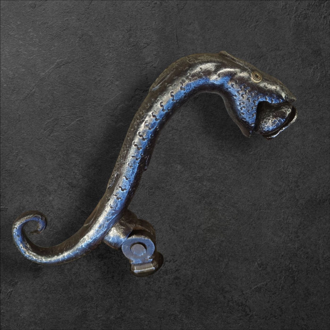 Forged and engraved iron knocker shaped like a dragon sculpted in the round with an open mouth and curled tail, brass eyes (cm 19x9x2.5) mounted on a modern wooden and metal base. Italy 17th century.Published work, from the Cesati collection (expertise of the famous antique dealer included).
