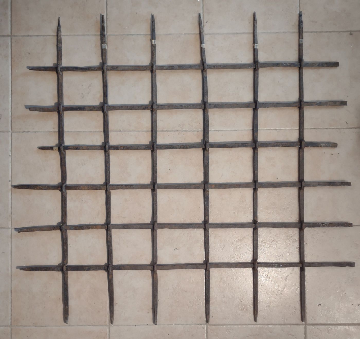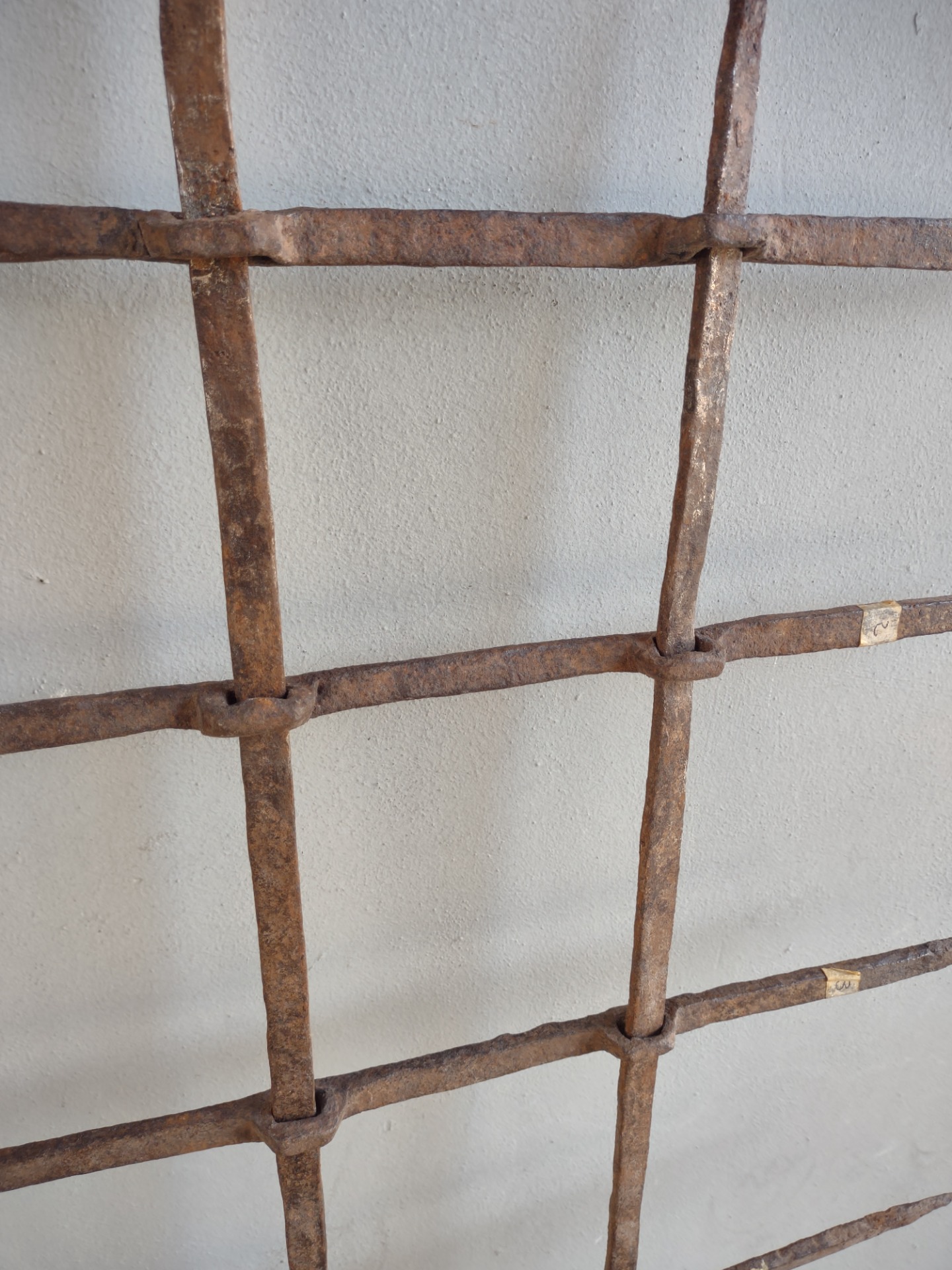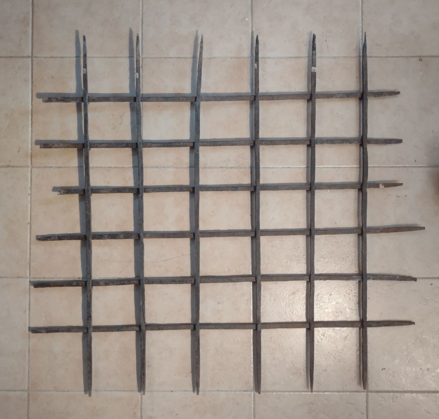 Splendid Lombard grate in wrought iron, composed of 6 female and 6 male bars, easily adjustable and removable.Very good condition considering the period.