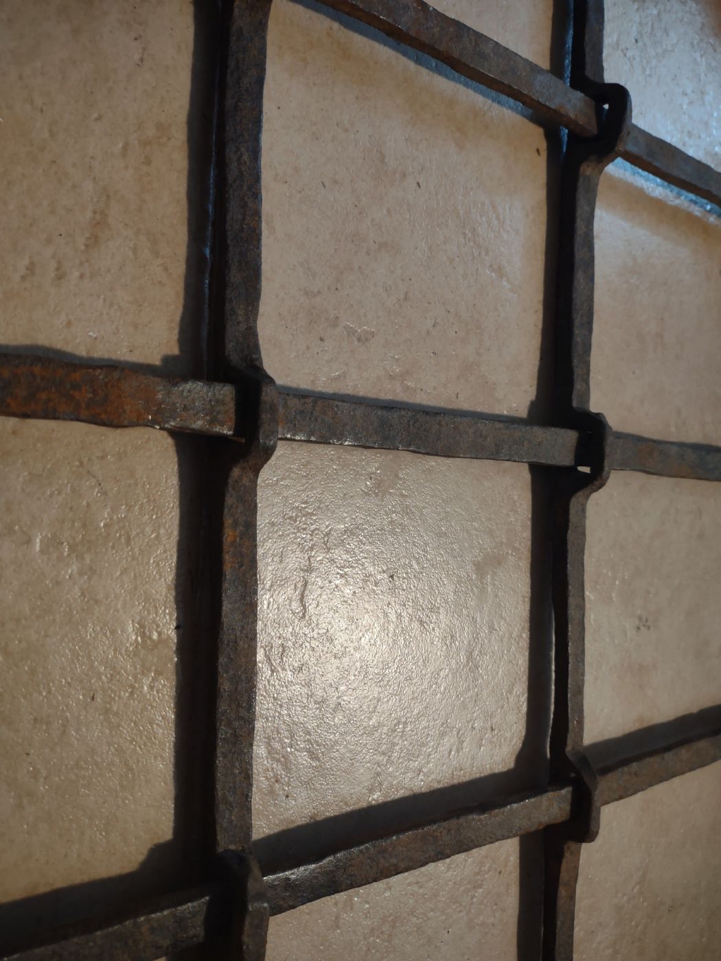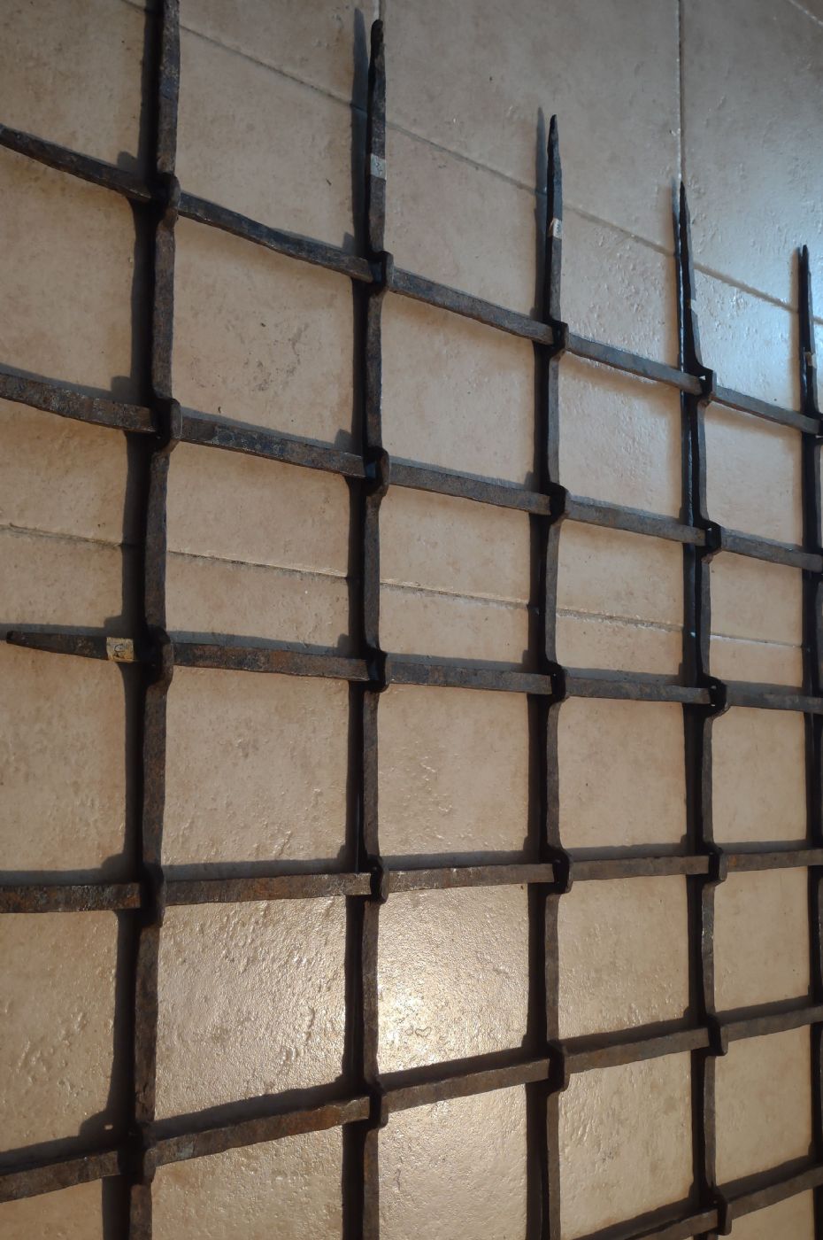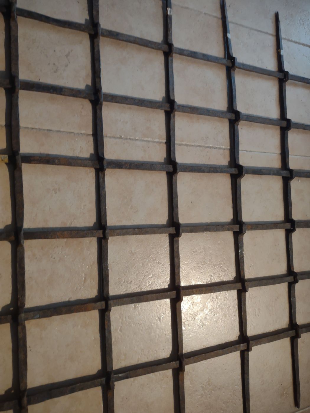 Splendid Lombard grate in wrought iron, composed of 6 female and 6 male bars, easily adjustable and removable.Very good condition considering the period.