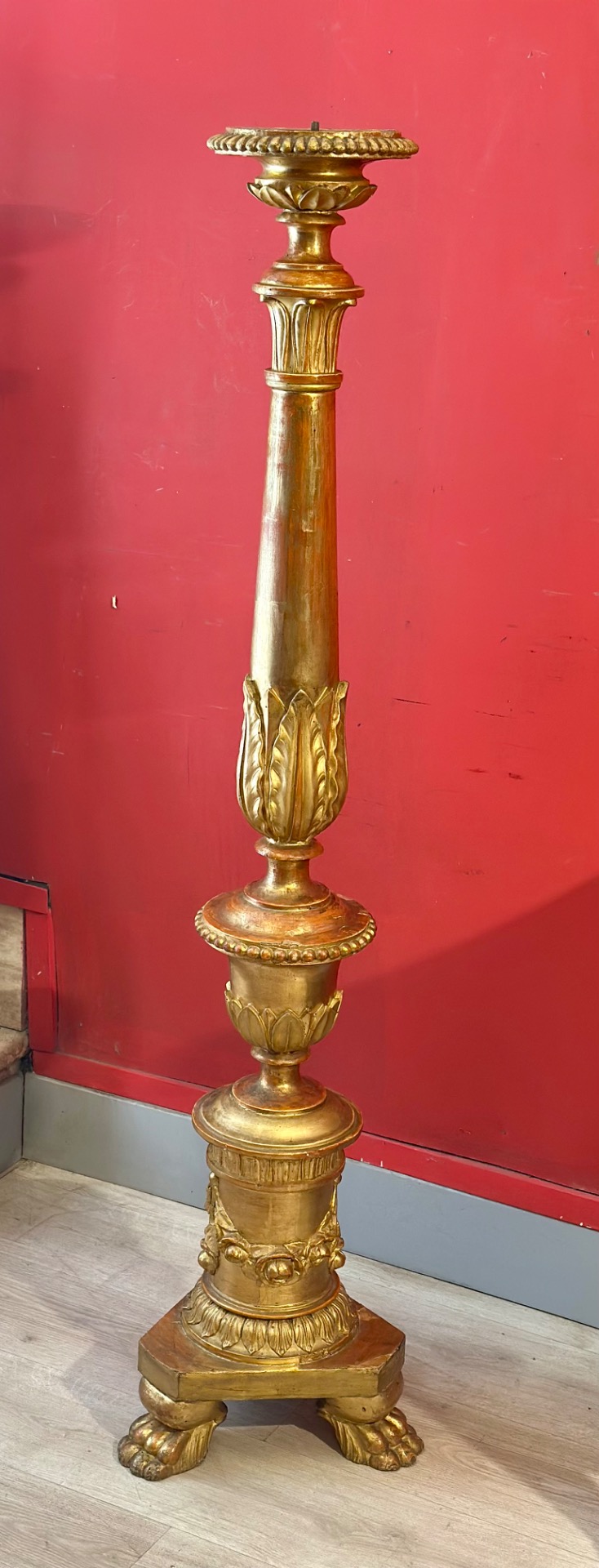 Finely carved and gilded with pure gold wooden candlestick, adapted into a floor lamp. The candlestick is 146 cm tall, and approximately 2.10 meters with the lampshade. The item is in excellent condition. Italian manufacture, approximately 1820.