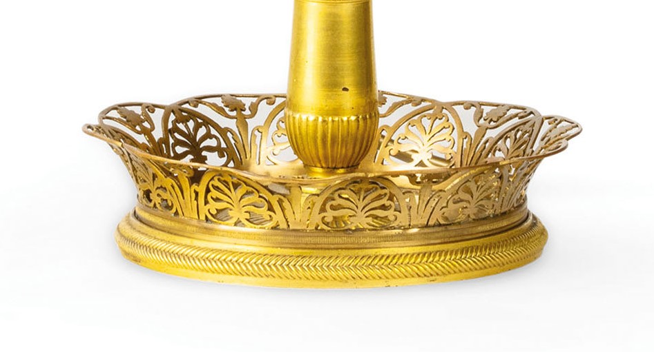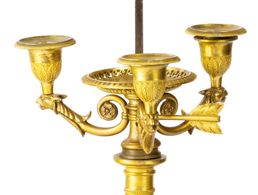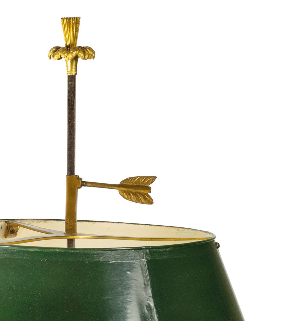 This elegant bouillotte table lamp was made in France in the early 19th century, in a classical style with Empire decorative elements. The structure is in finely chiseled and gilded bronze. With a circular base in the shape of an openwork basket, it has a turned stem with a small upper plate and three moving and curvilinear arms, which originate from a curl centered by a flower and end in the head of a fantastic animal. The bobeches, also in gilded bronze, are chiseled with palmette motifs. The upper socket has a floral decoration, and the two rods for adjusting the height of the lampshade and lights are in the shape of an arrow. The characteristic lampshade is made of painted tin.