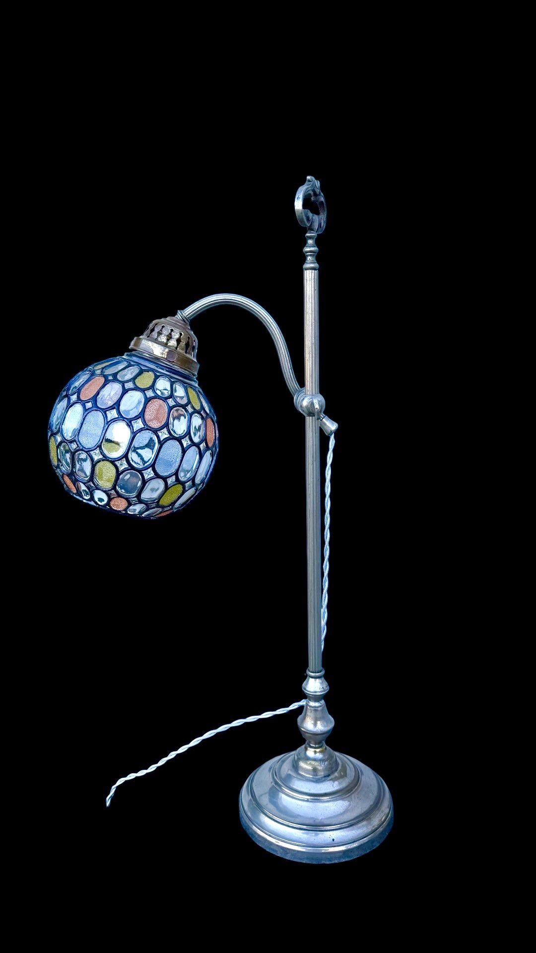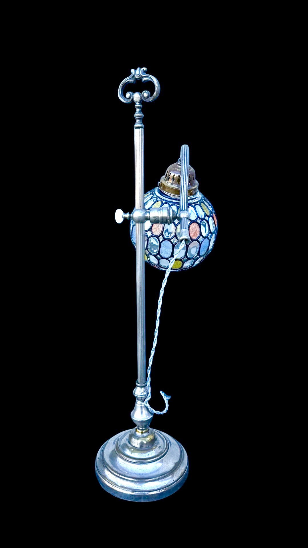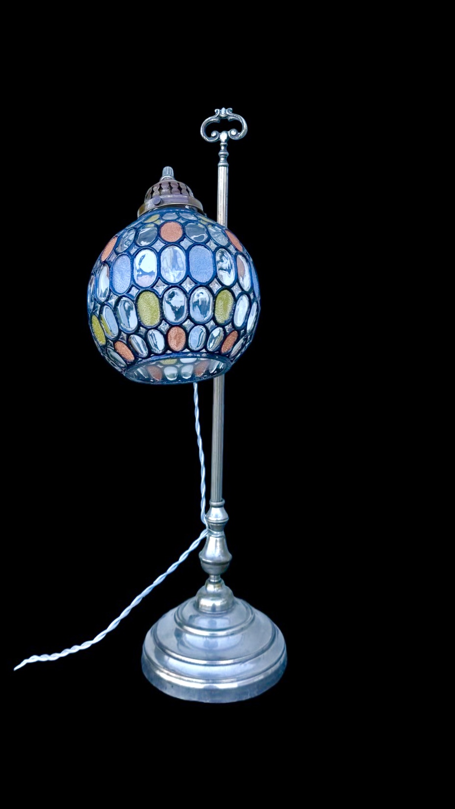 Lamp with metal stem and globular part with multicolored leaded glass. cm 55x13. Globular part cm 14.
