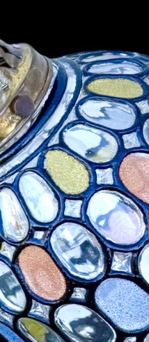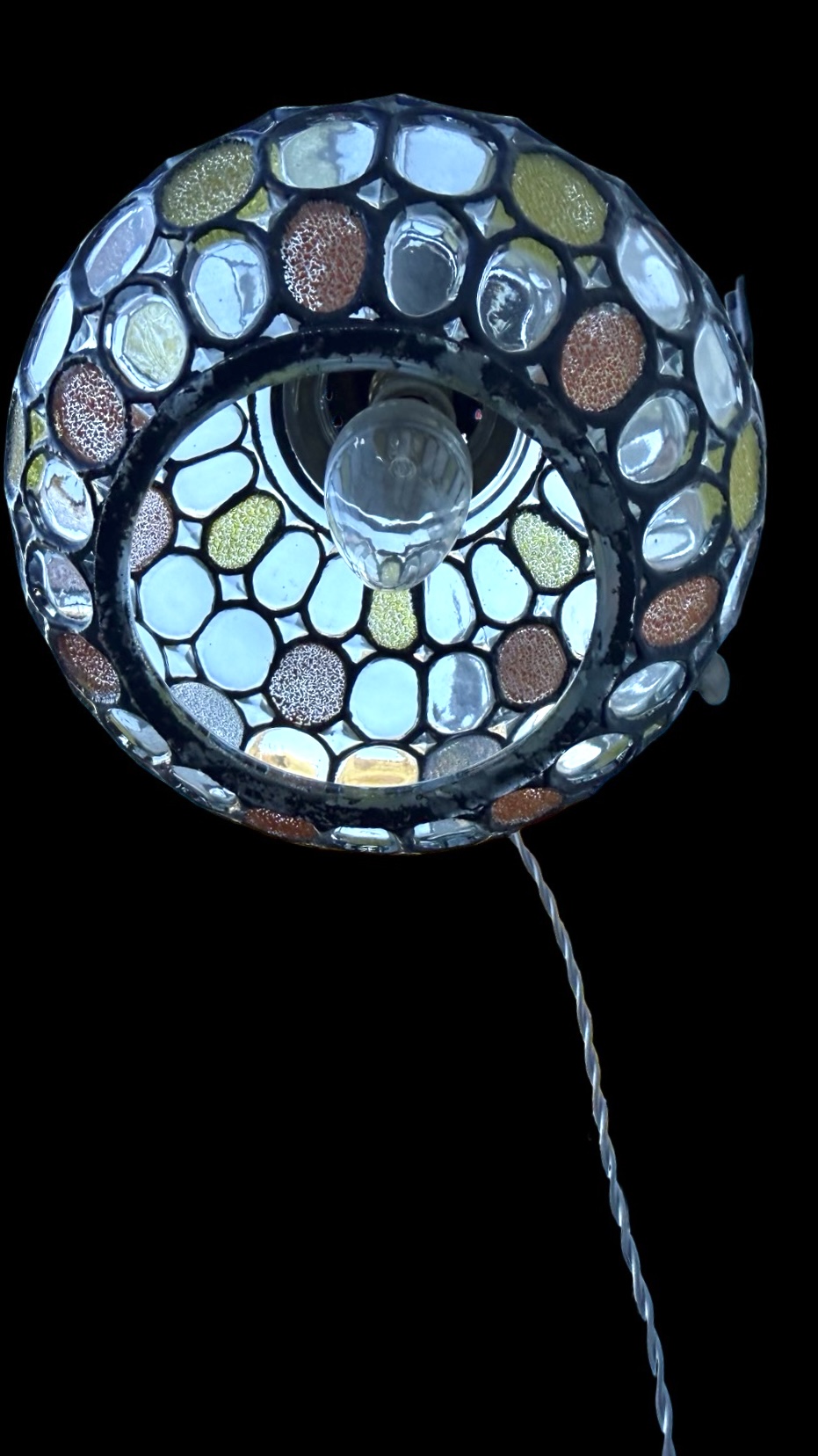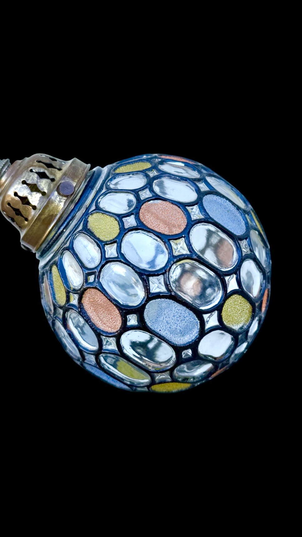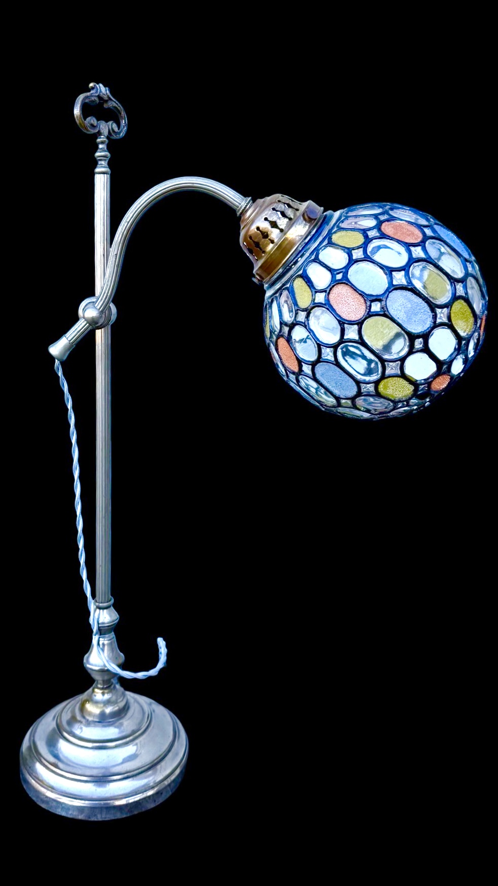 Lamp with metal stem and globular part with multicolored leaded glass. cm 55x13. Globular part cm 14.