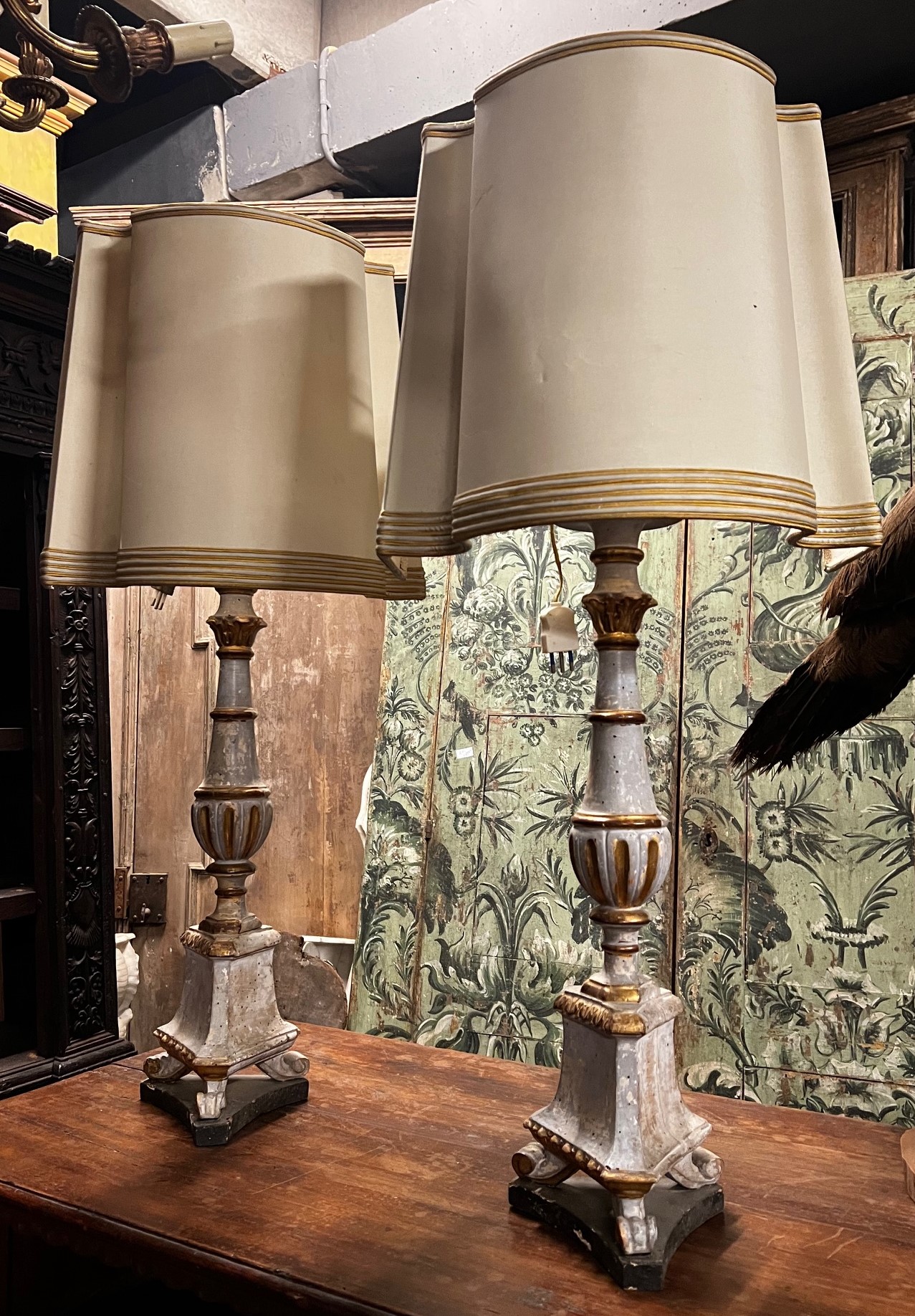 LAMP240 - Lacquered and sculpted wooden candlesticks, with gilded decorations.