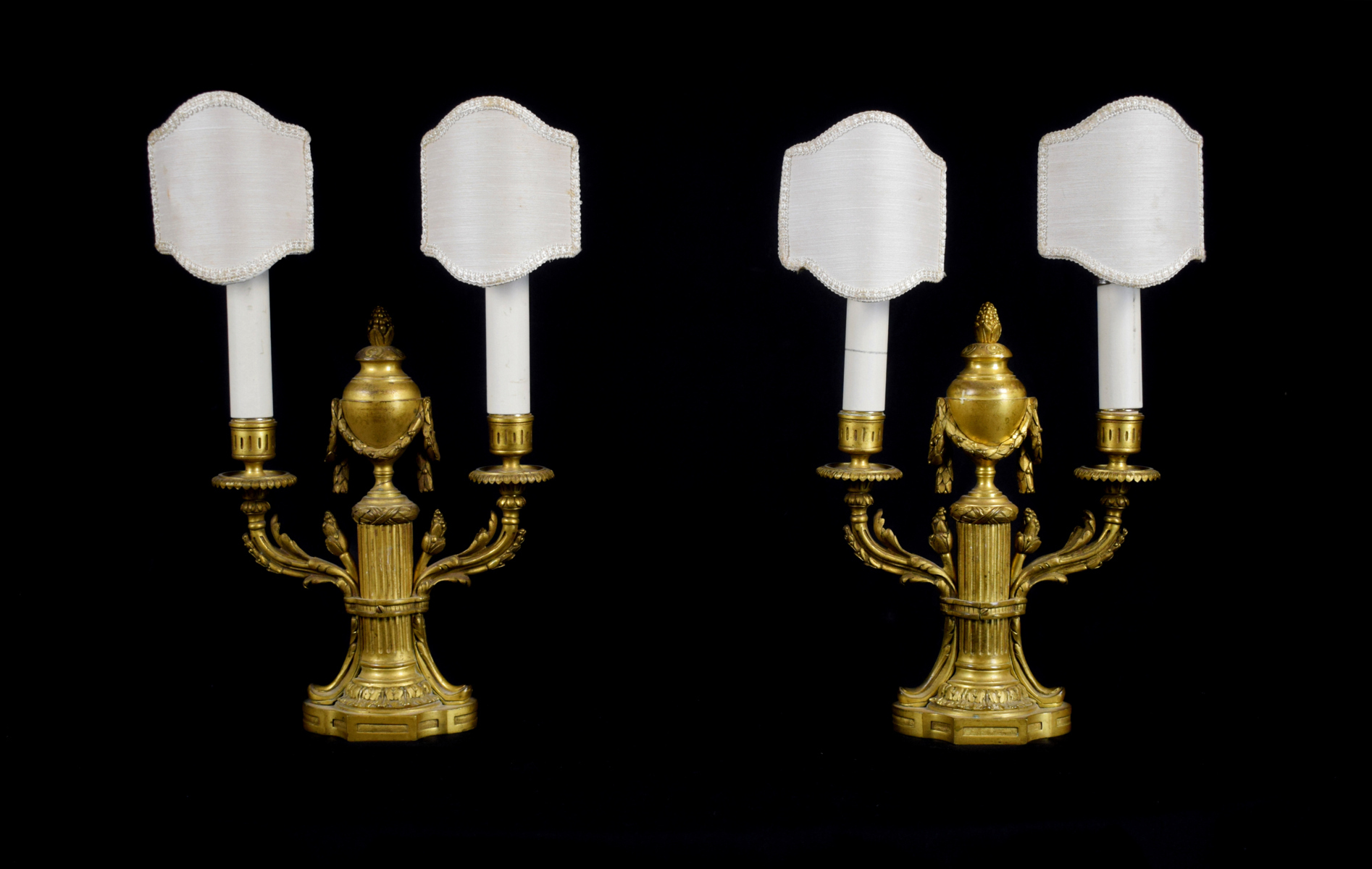 This graceful pair of candelabras was made in France around the early 19th century in finely chiselled and gilded bronze in the Louis XVI style. With an oval base, they feature a tapered column shaft from which two arms with leafy volutes originate, supporting two electrified candles fitted with fabric lampshades. On top of the central body is a bronze vase surrounded by laurel leaf garlands and on top a pine cone.
