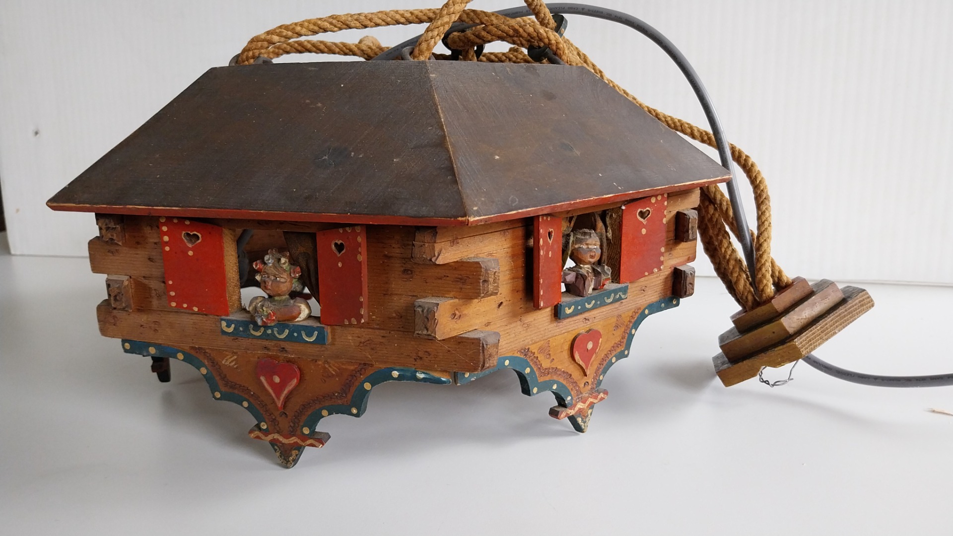Charming and refined wooden lamp from Val Gardena. Made between the 30s and 50s. All the small sculptures on the windows are intact. For the kitchen, living room or bedroom, a true taste of the mountains. Contained size: 35 cm in diameter. Working, perfect.
