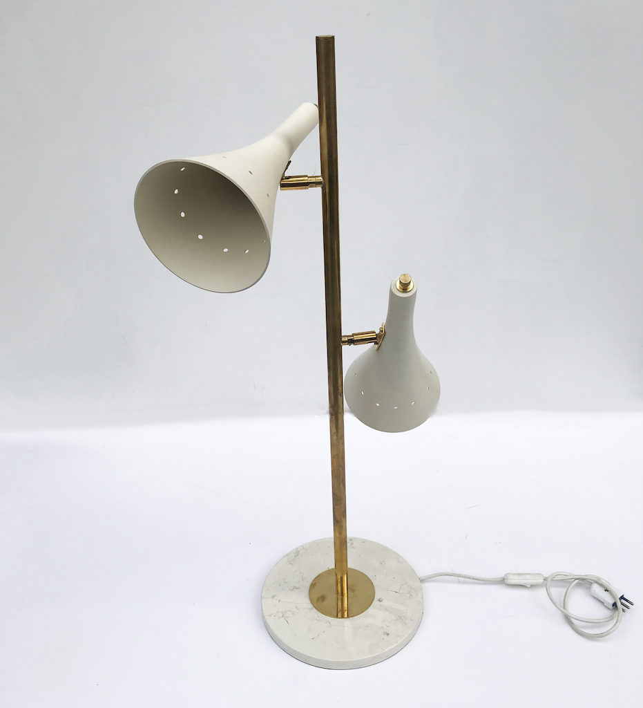 Unique vintage table lamp with double cone in white lacquered metal, brass stem, and marble base. Origin: Italy Period: 1970s Dimensions: ⌀ 24 x H 71 cm / Cone ⌀14 x L 31 cm Pair not available.