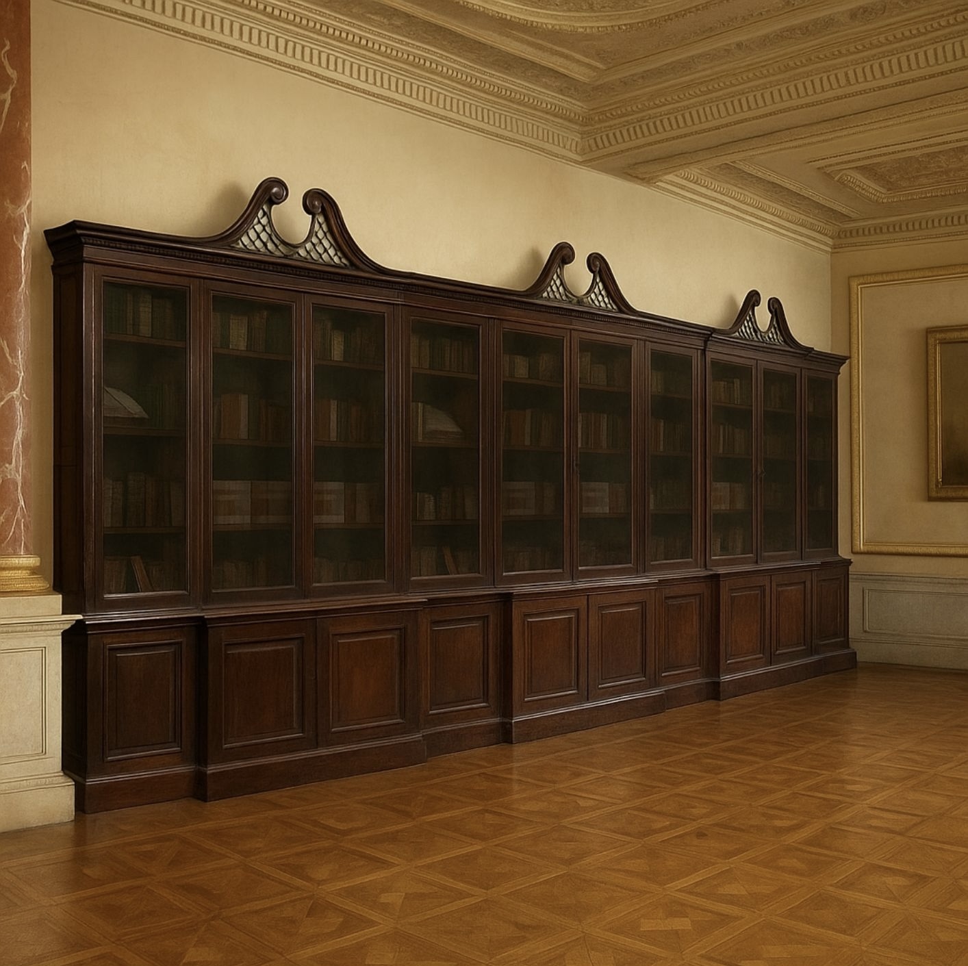 Rara e imponente libreria in palissandro, epoca Giorgio III, di grandi dimensioni, lunga quasi sette metri, con dieci scomparti inferiori (due alle estremità con cassetti interni) e ante a vetri nella parte superiore. Ogni sezione superiore è dotata di ripiani regolabili, ideali per libri o per esporre oggetti. I frontoni traforati a collo di cigno le conferiscono un’eleganza raffinata, rendendola un elemento centrale di grande impatto, tanto bello quanto pratico