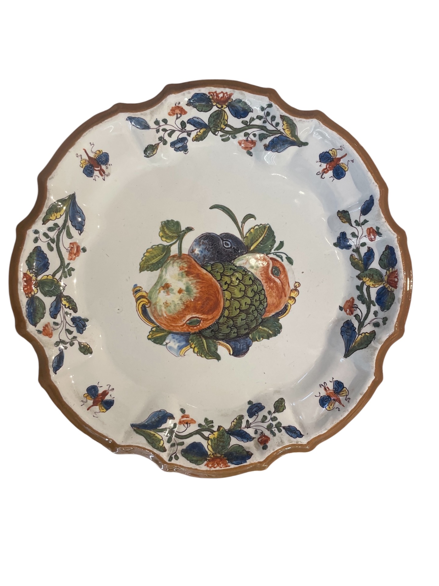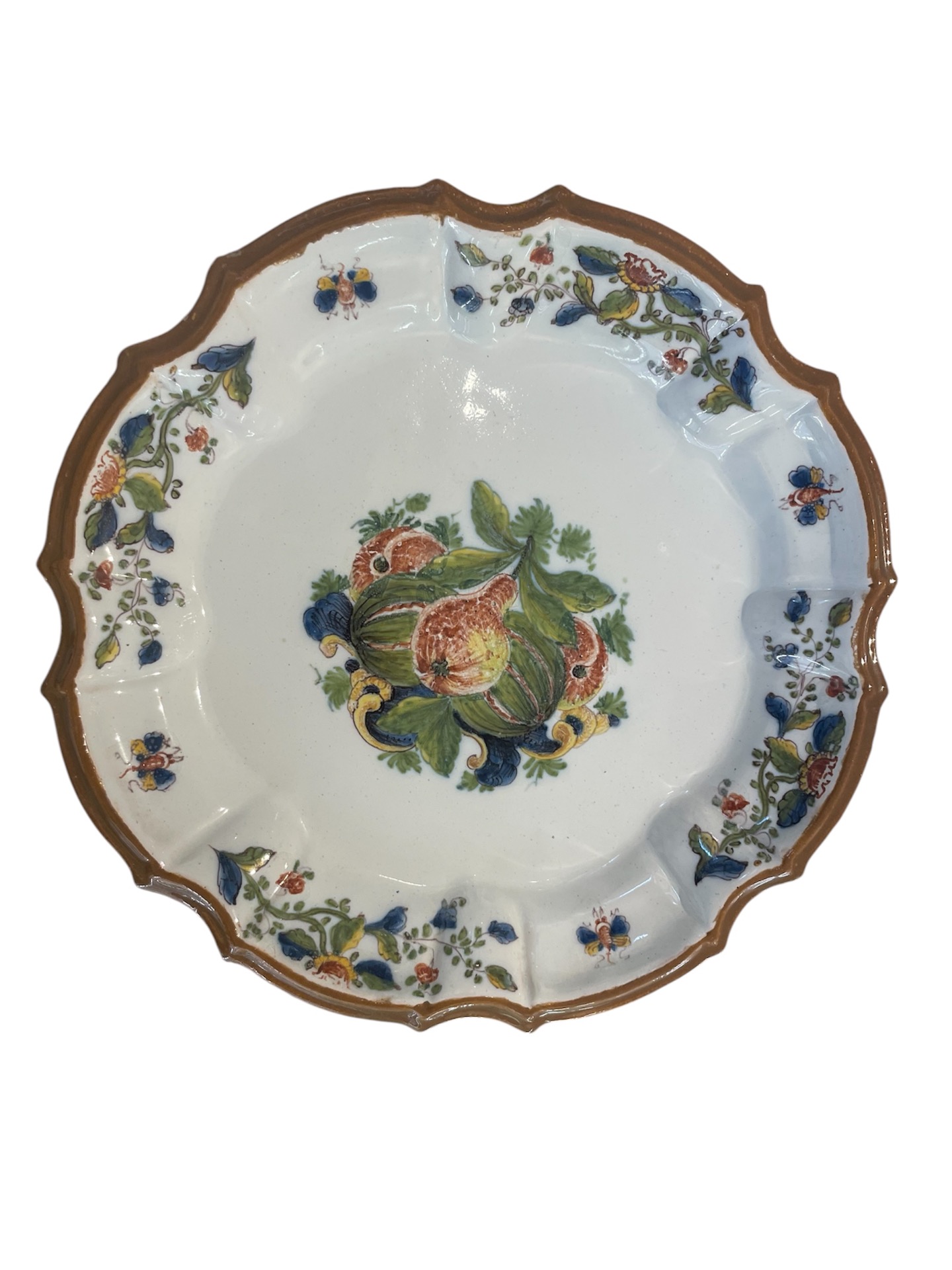 Dieci piatti in maiolica , manifattura Pasquale Antonibon, decoro alla frutta barocca con bordo canna . Cm 23,5 circa XVIII secolo