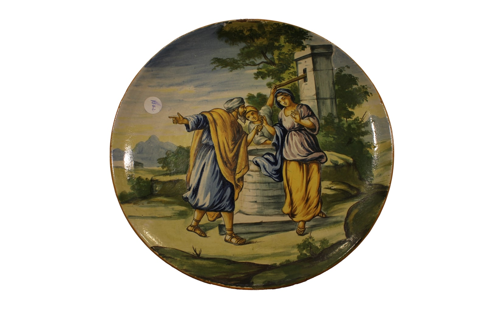 Finely decorated majolica plate depicting a biblical or mythological scene. Rich in details and with rather bright colors. Origin: France Period: first half of the 19th century Dimensions: ø 41 cm SKU: 17142 For any other curiosity visit our website:...