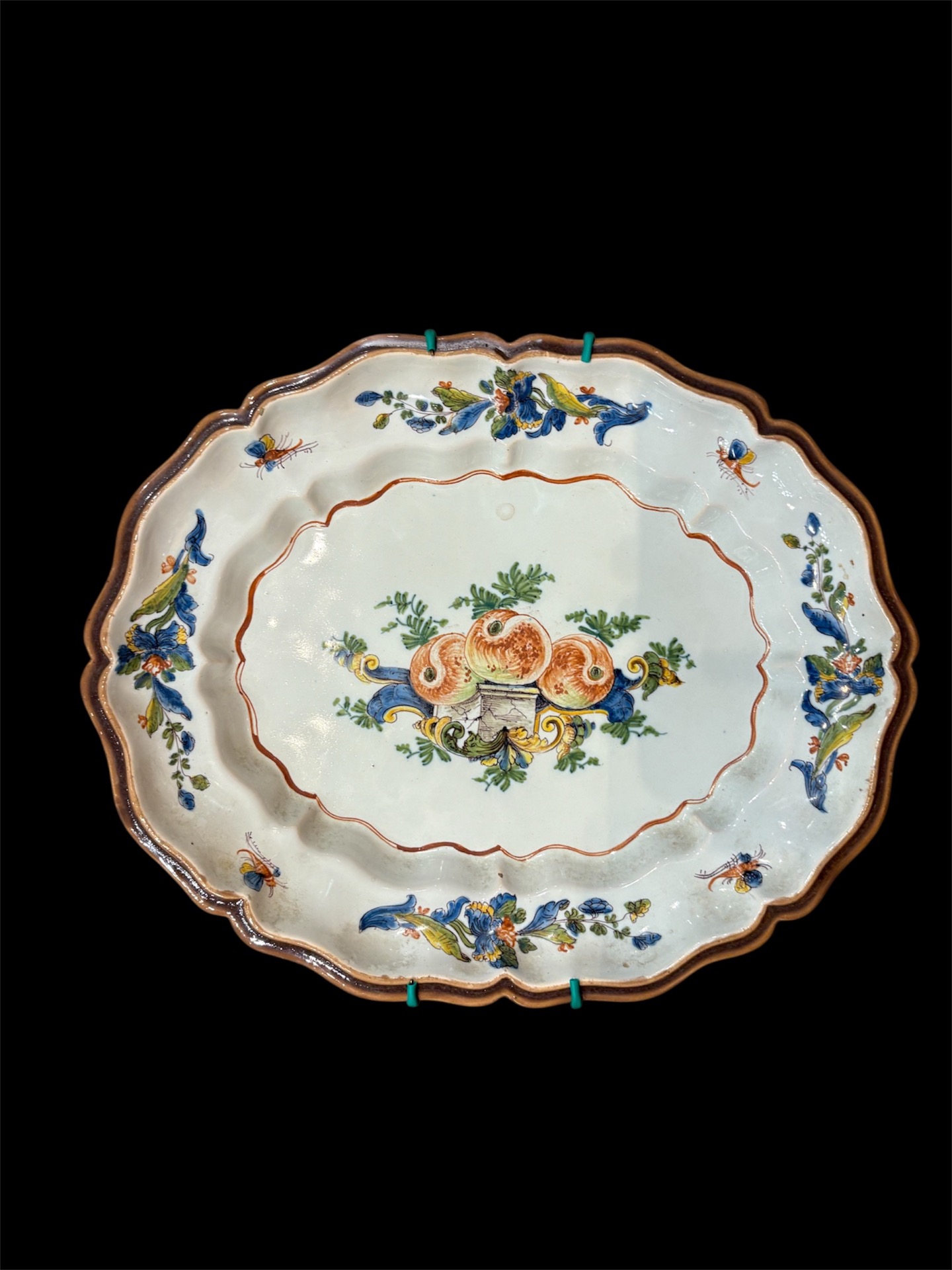 Grande Piatto sagomato in maiolica , manifattura Pasquale Antonibon , Nove di Bassano , decoro alla frutta barocca con colonna , 1740 circa , perfetto stato di conservazione cm 34 circa