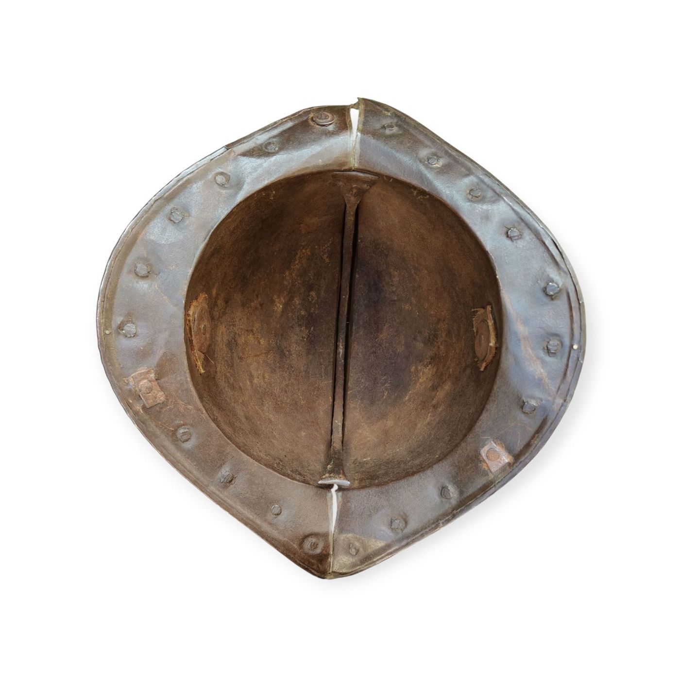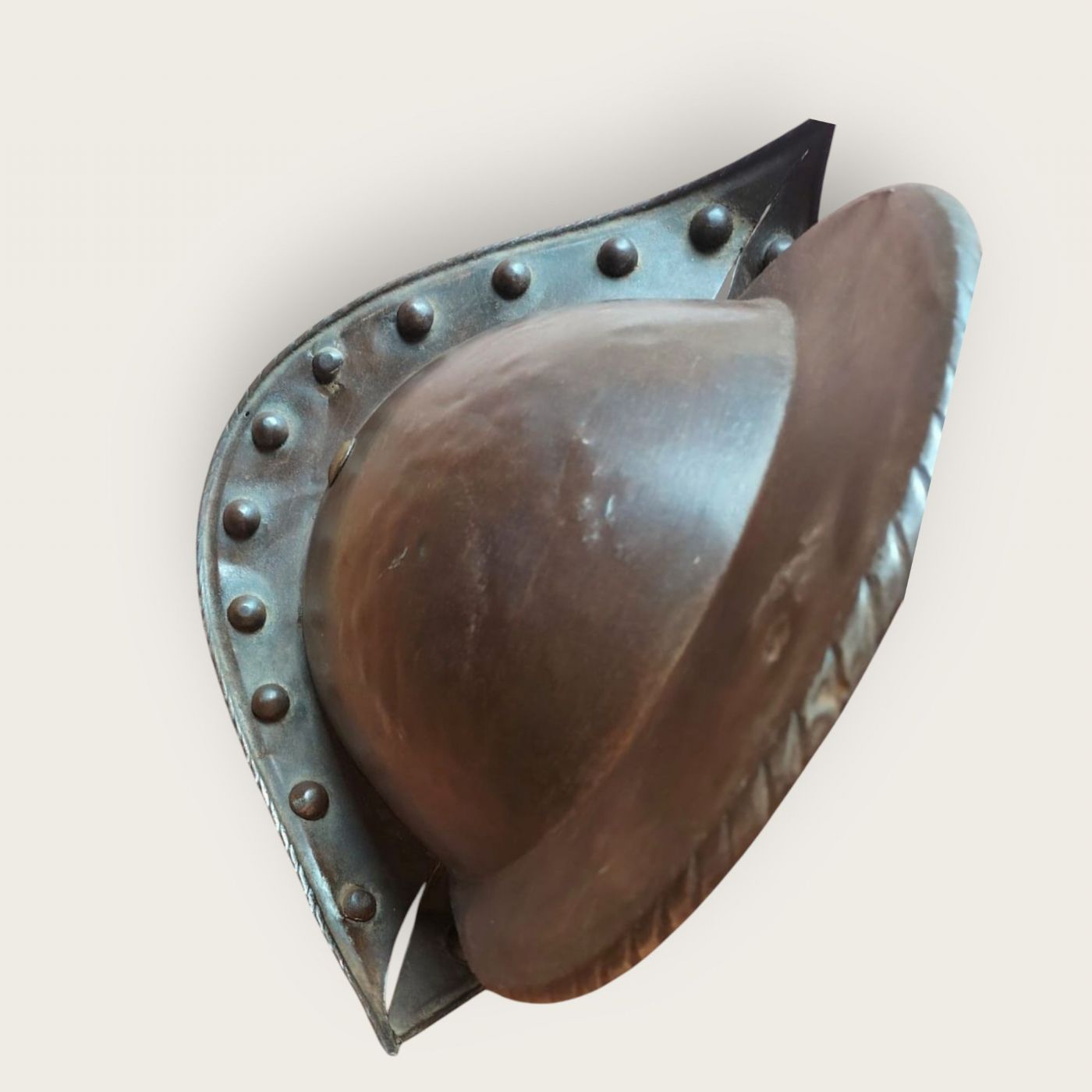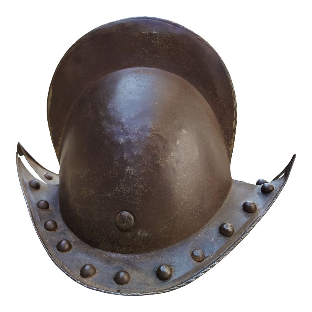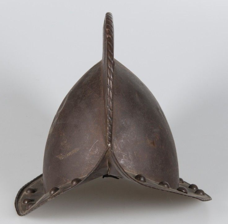 Interesting Spanish Morion with high crest for castle use (lighter than those for battle, intended for use within the walls) from the private collection of the Peruvian General and President Miguel Iglesias (1830-1909).The helmet has two visible engravings near the tips, probably made to display the helmet.