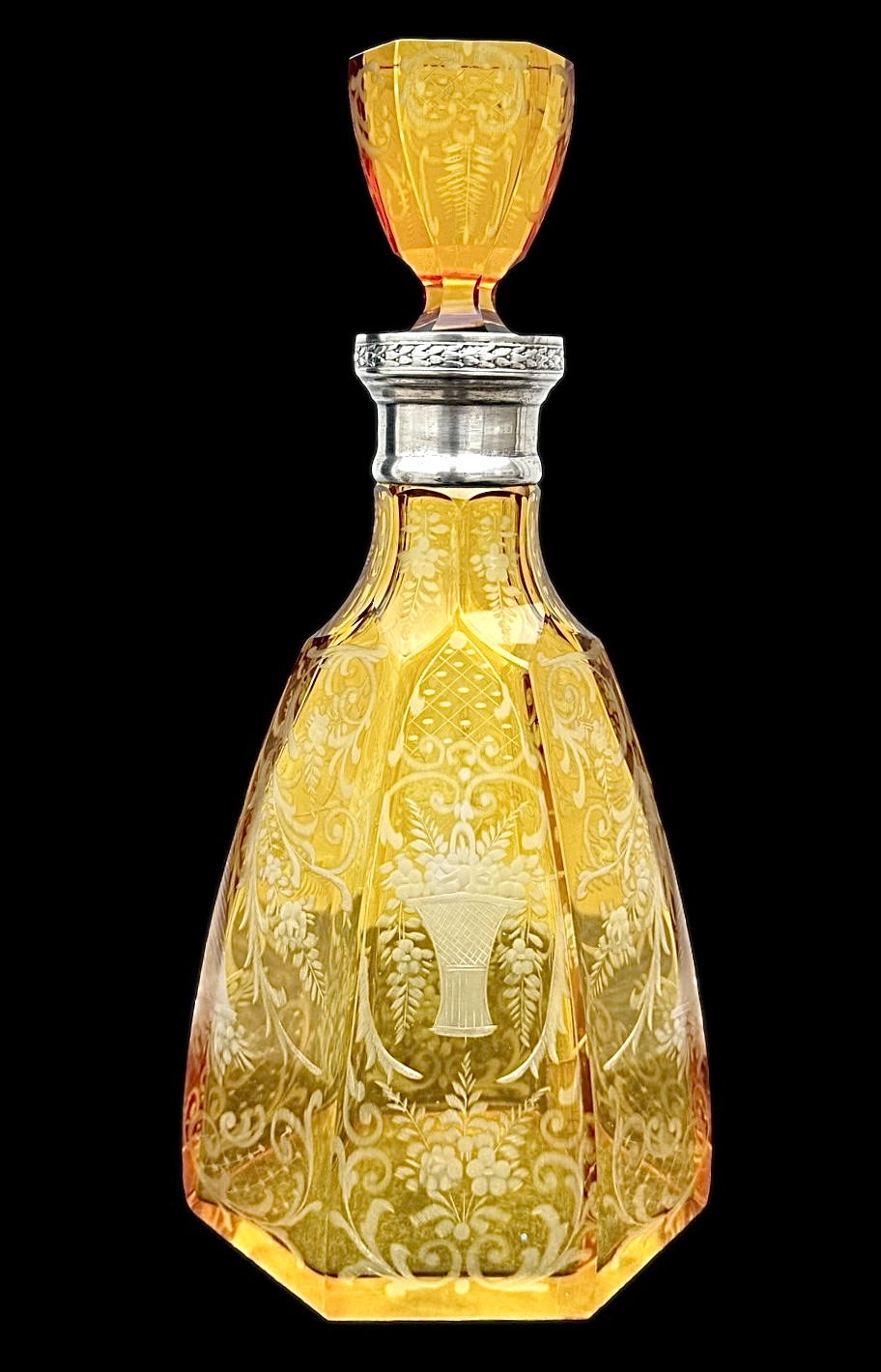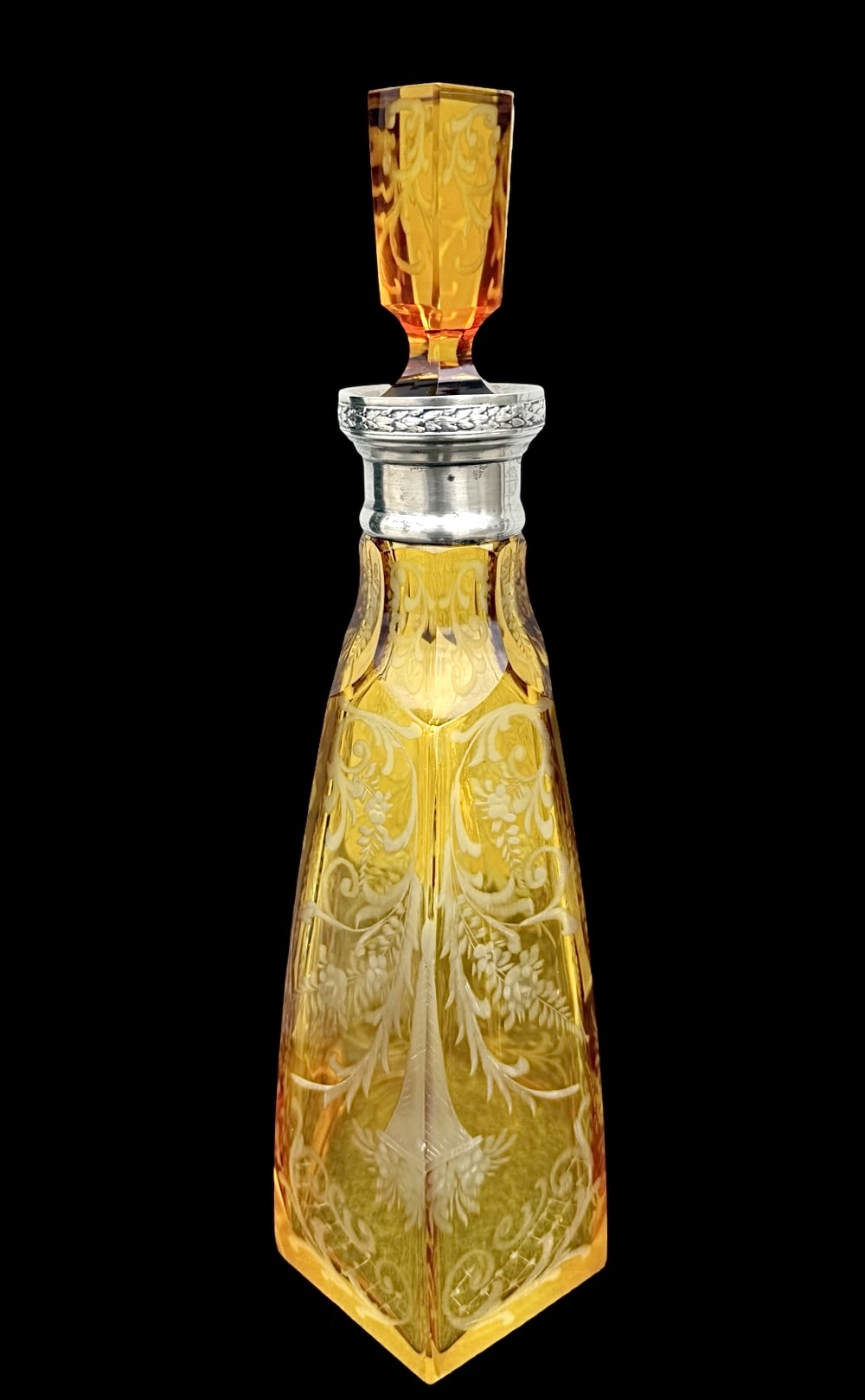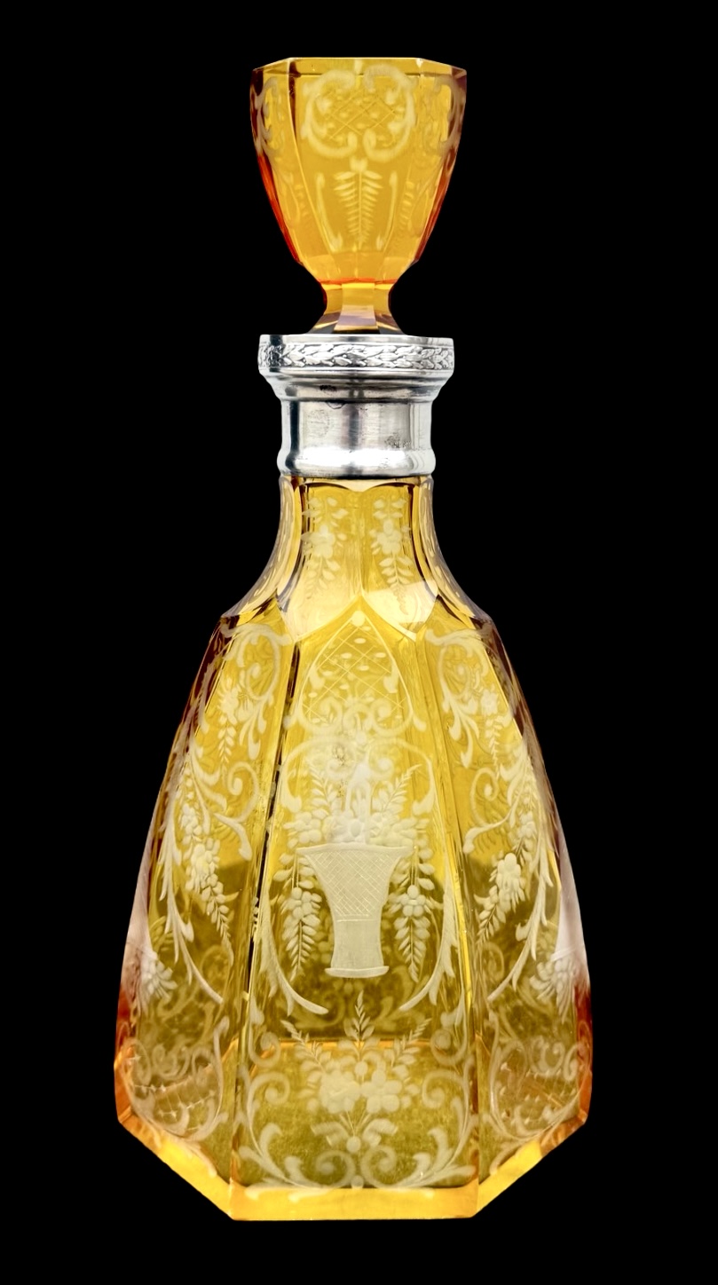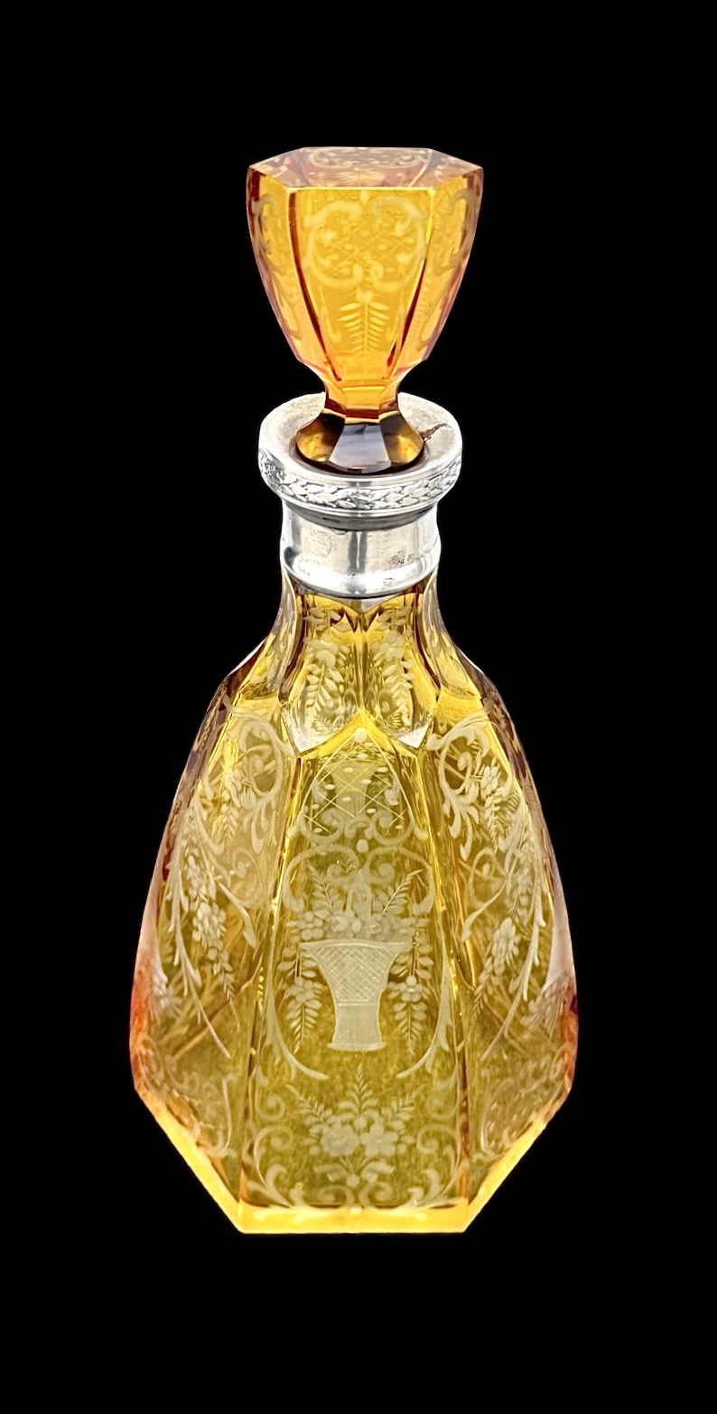 Hexagonal cased crystal bottle with floral and rocaille cut decorations. Silver neck with Italian hallmark. Bohemia. 30x13x8.5 cm.