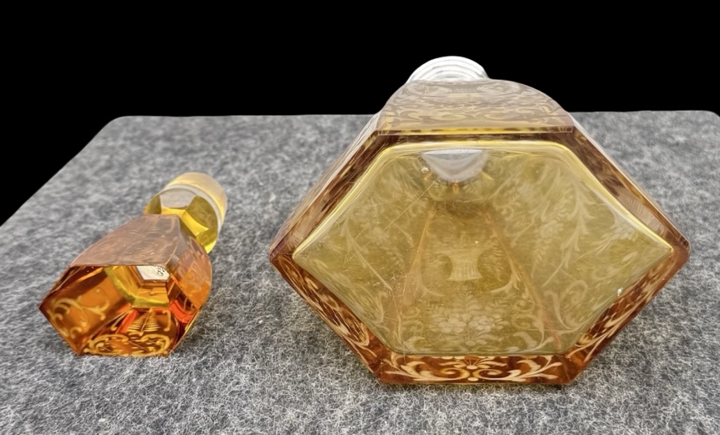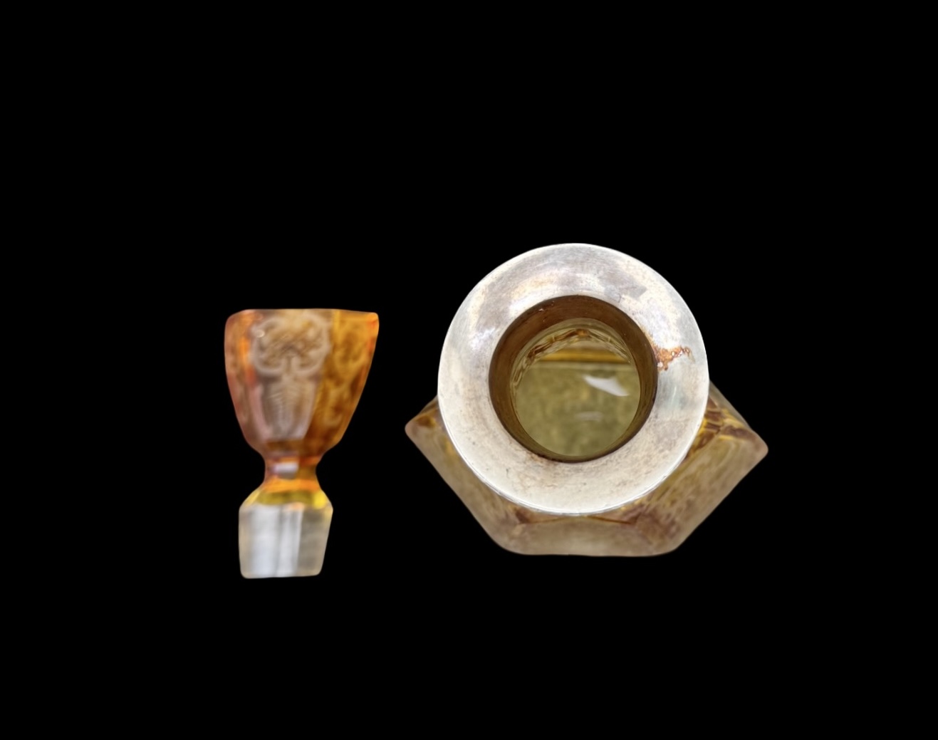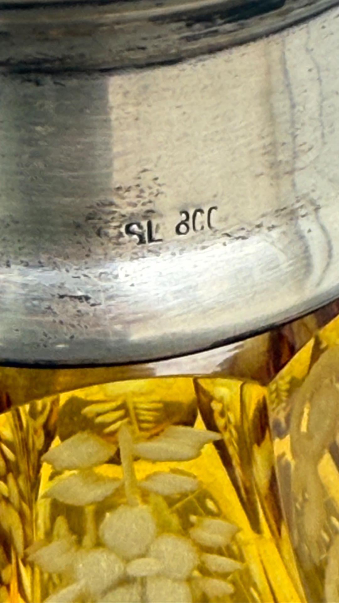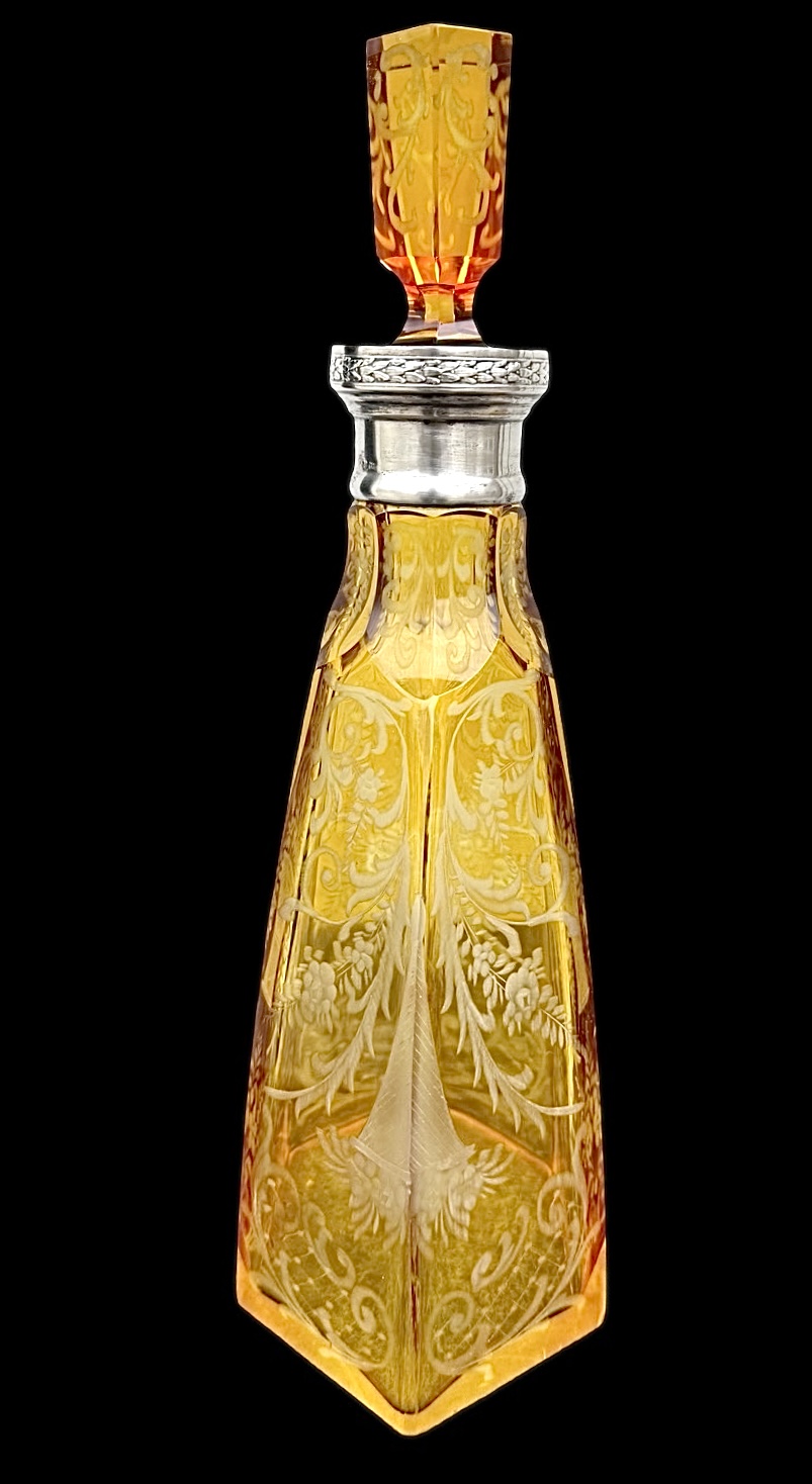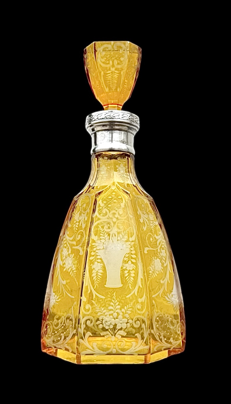 Hexagonal cased crystal bottle with floral and rocaille cut decorations. Silver neck with Italian hallmark. Bohemia. 30x13x8.5 cm.