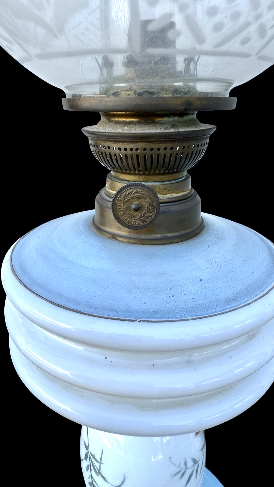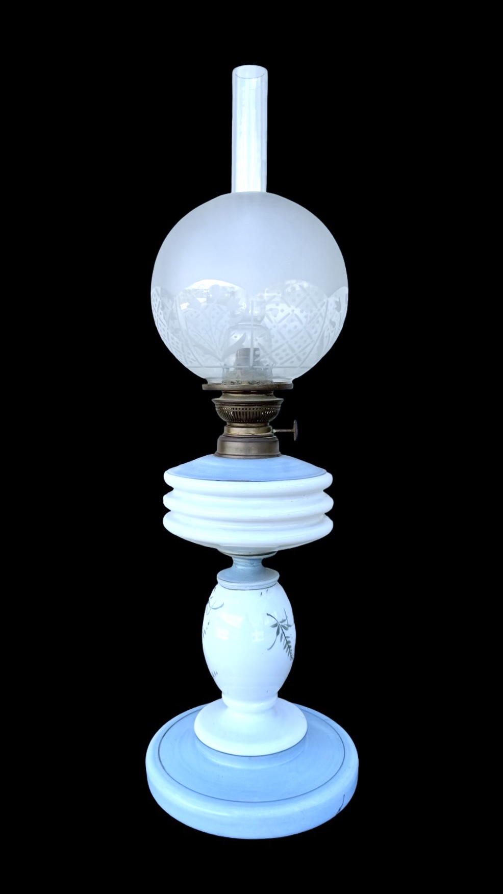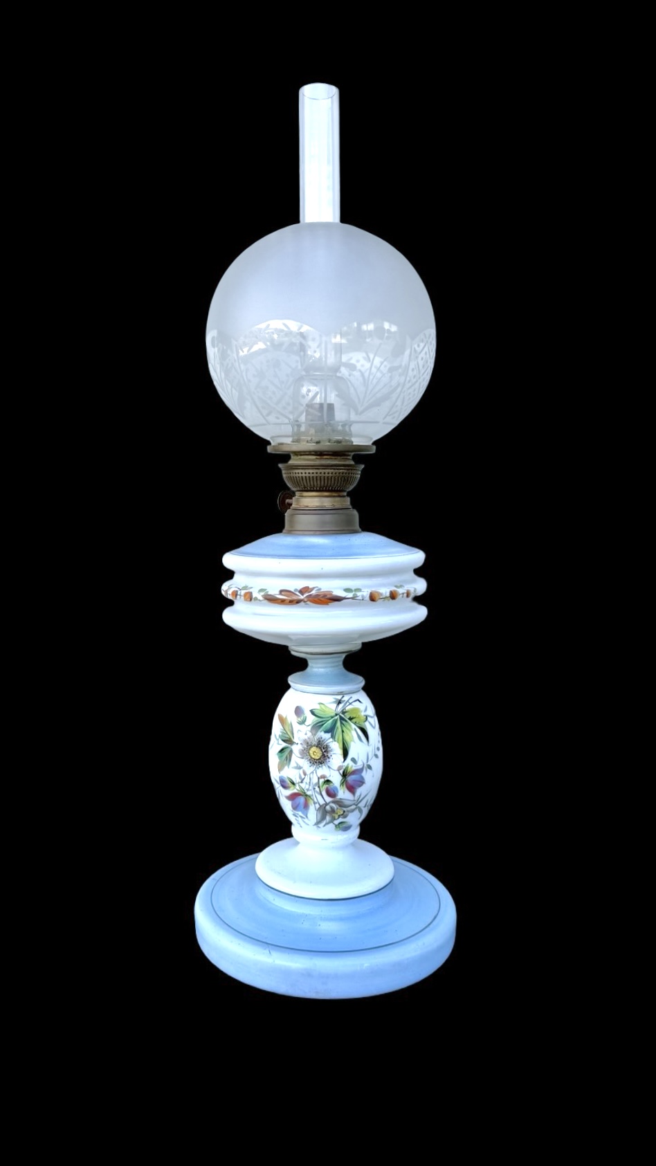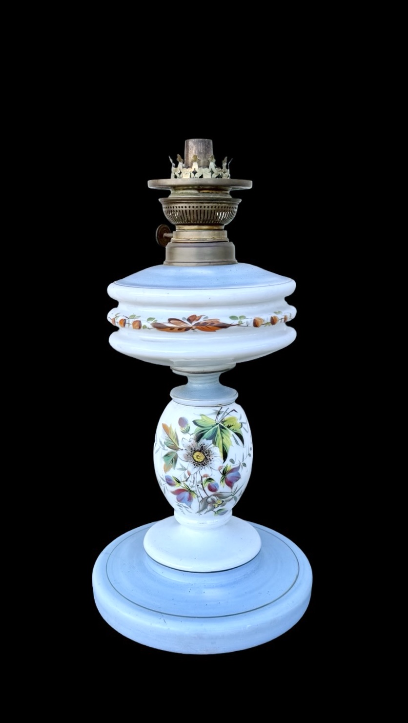 Milk glass oil lamp with light blue decoration and floral motifs. Kosmos Brenner manufacture. Germany.