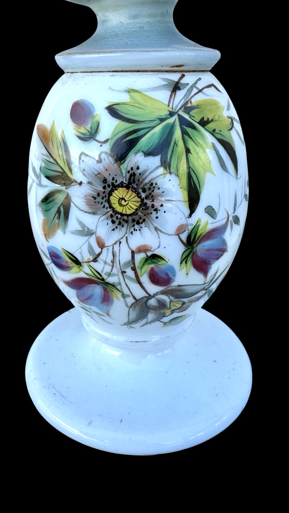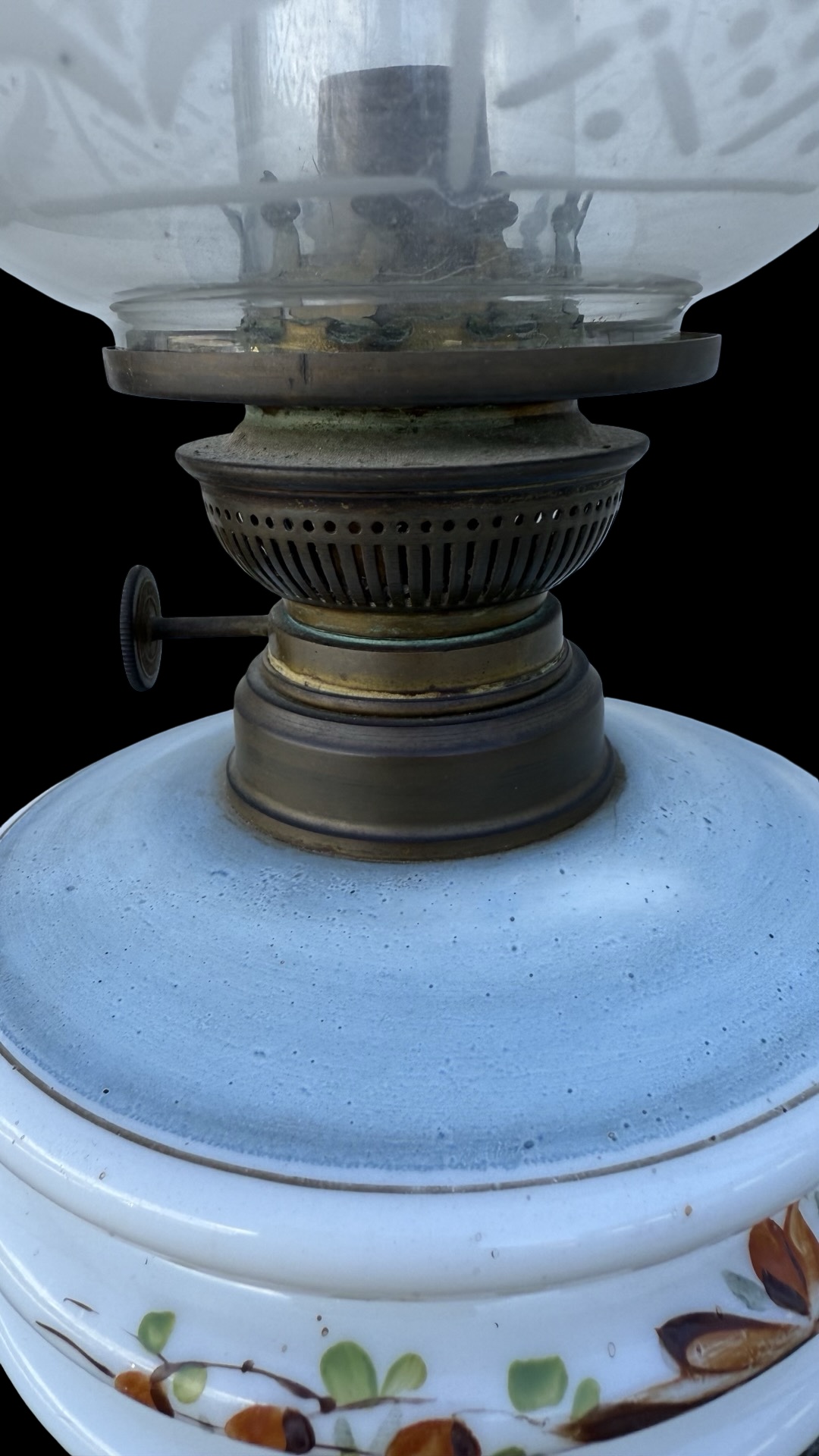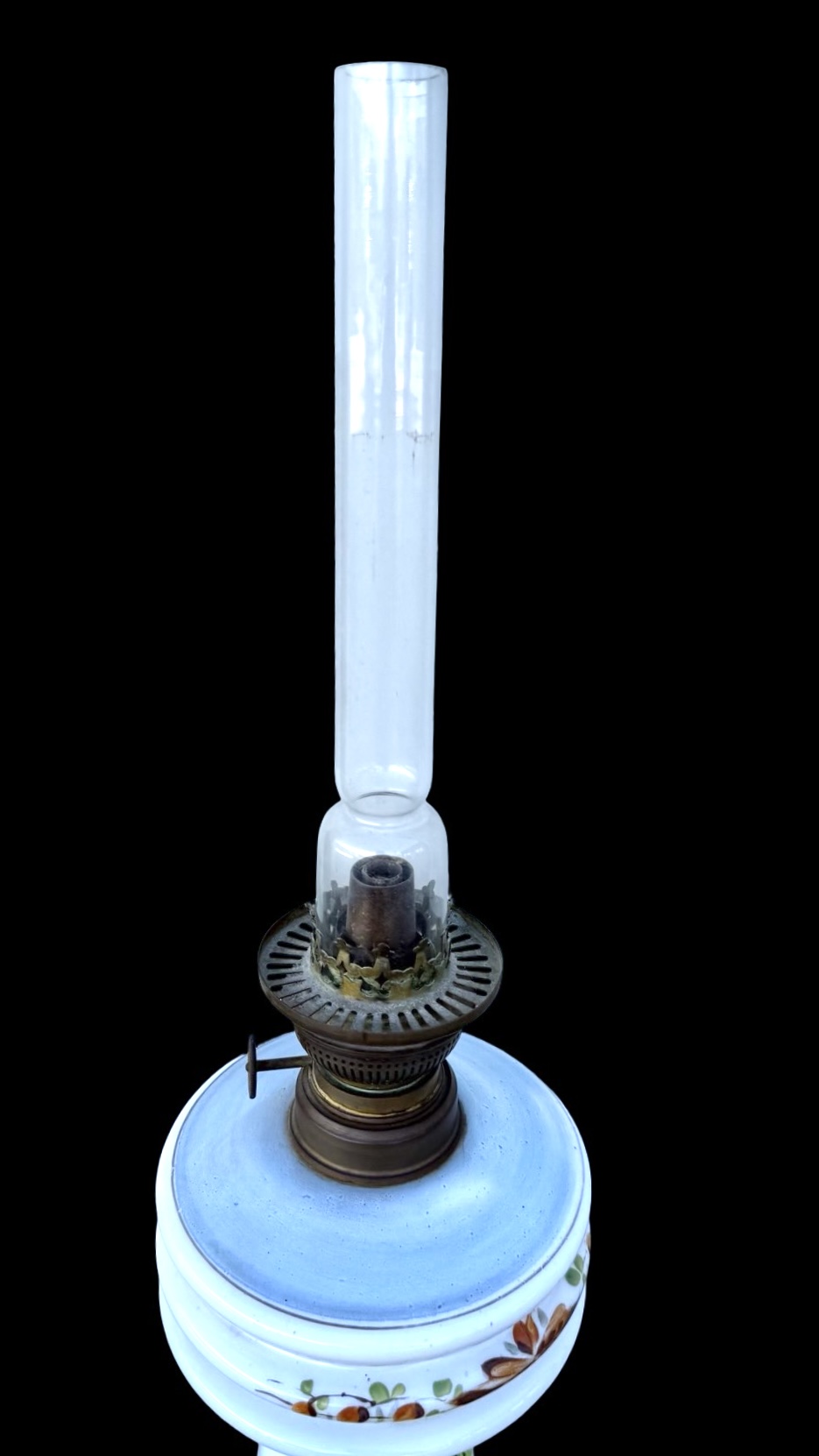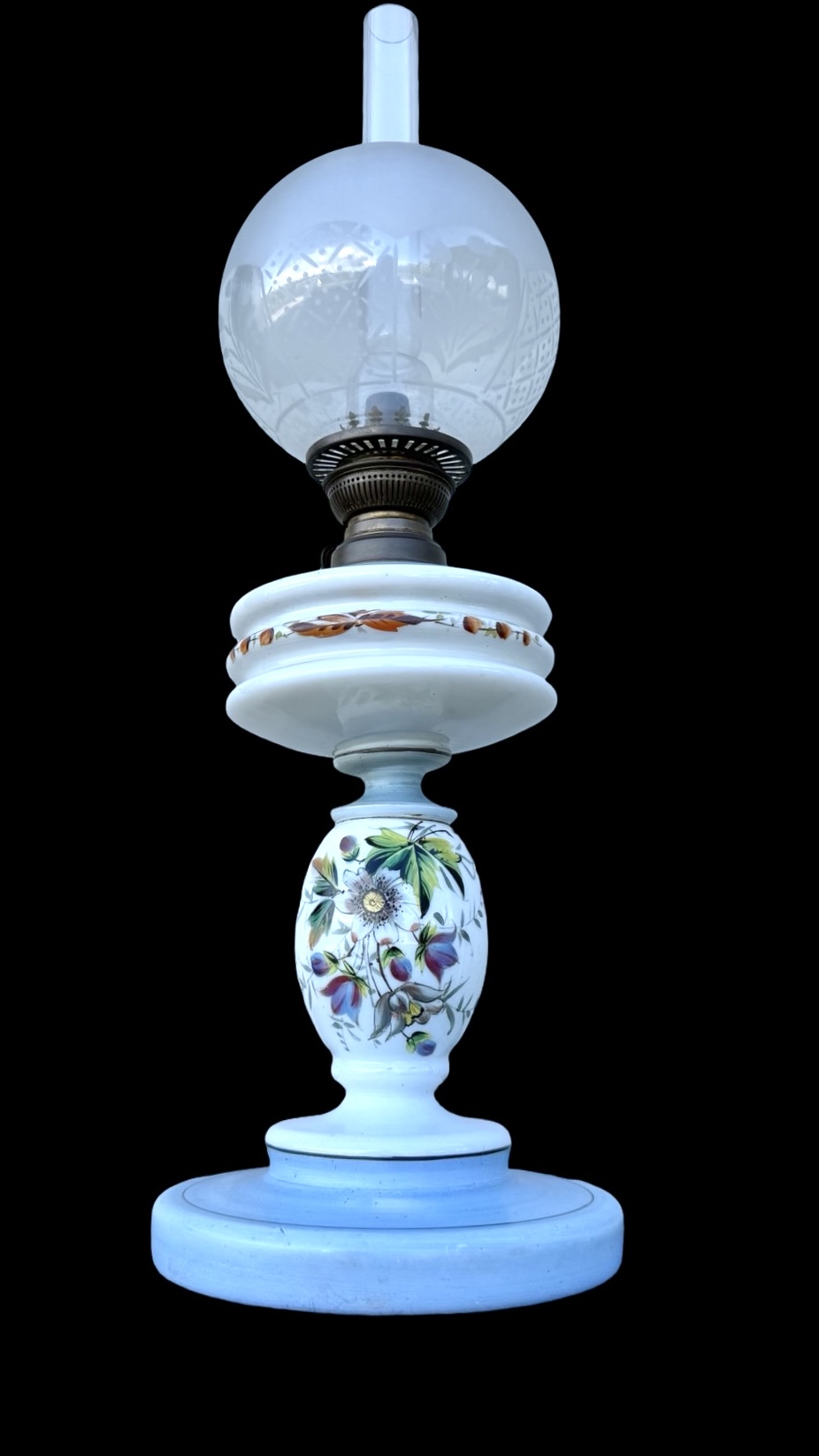 Milk glass oil lamp with light blue decoration and floral motifs. Kosmos Brenner manufacture. Germany.