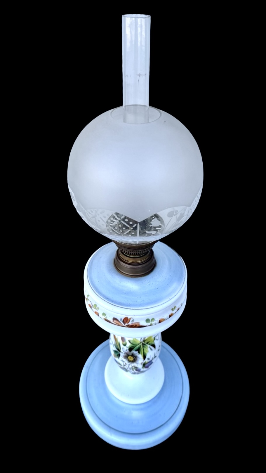 Milk glass oil lamp with light blue decoration and floral motifs. Kosmos Brenner manufacture. Germany. Total height: 55 cm. Glass part: 30x16 cm.