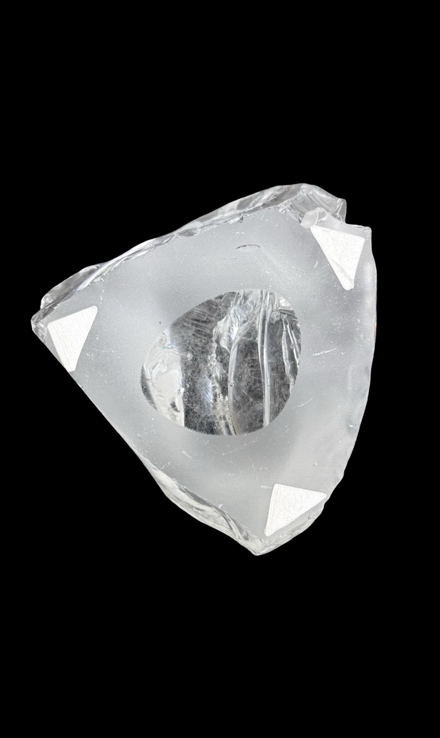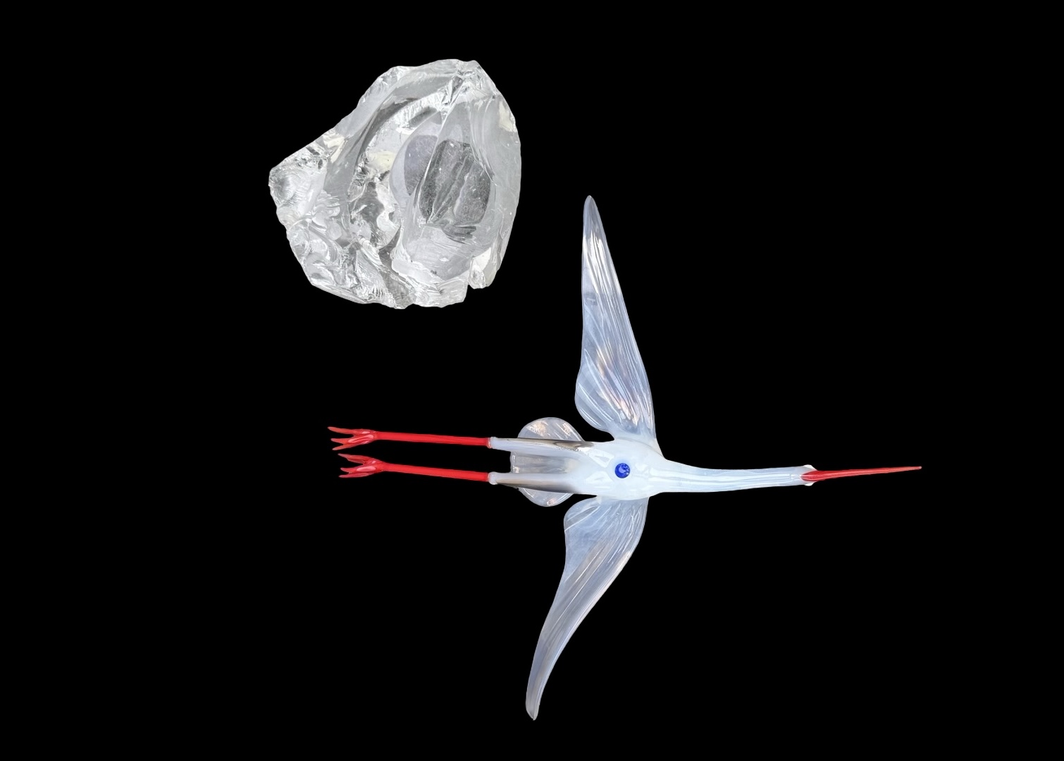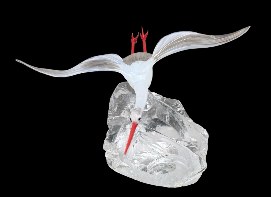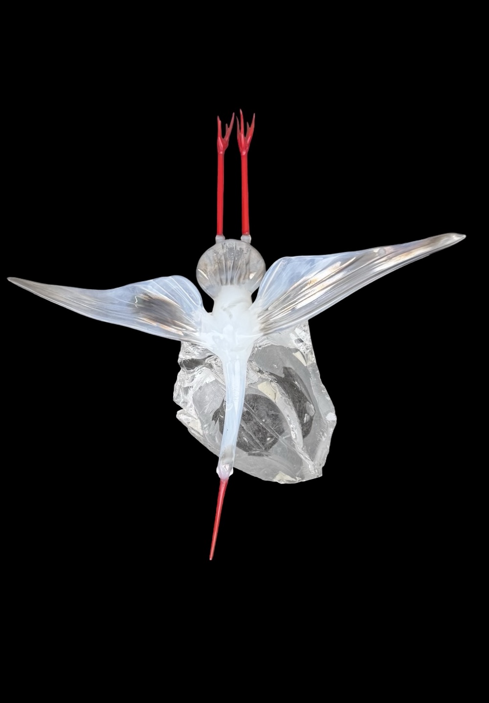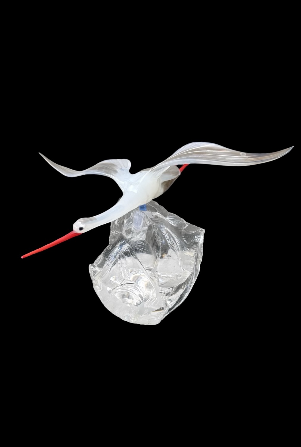 Glass sculpture depicting a stork in flight, with red legs and beak and 'lattimo' inclusion. It has a slight iridescence. Resting on a transparent base that simulates a rock. Murano. Cm 30x28x8. Base: cm 13x13x9.