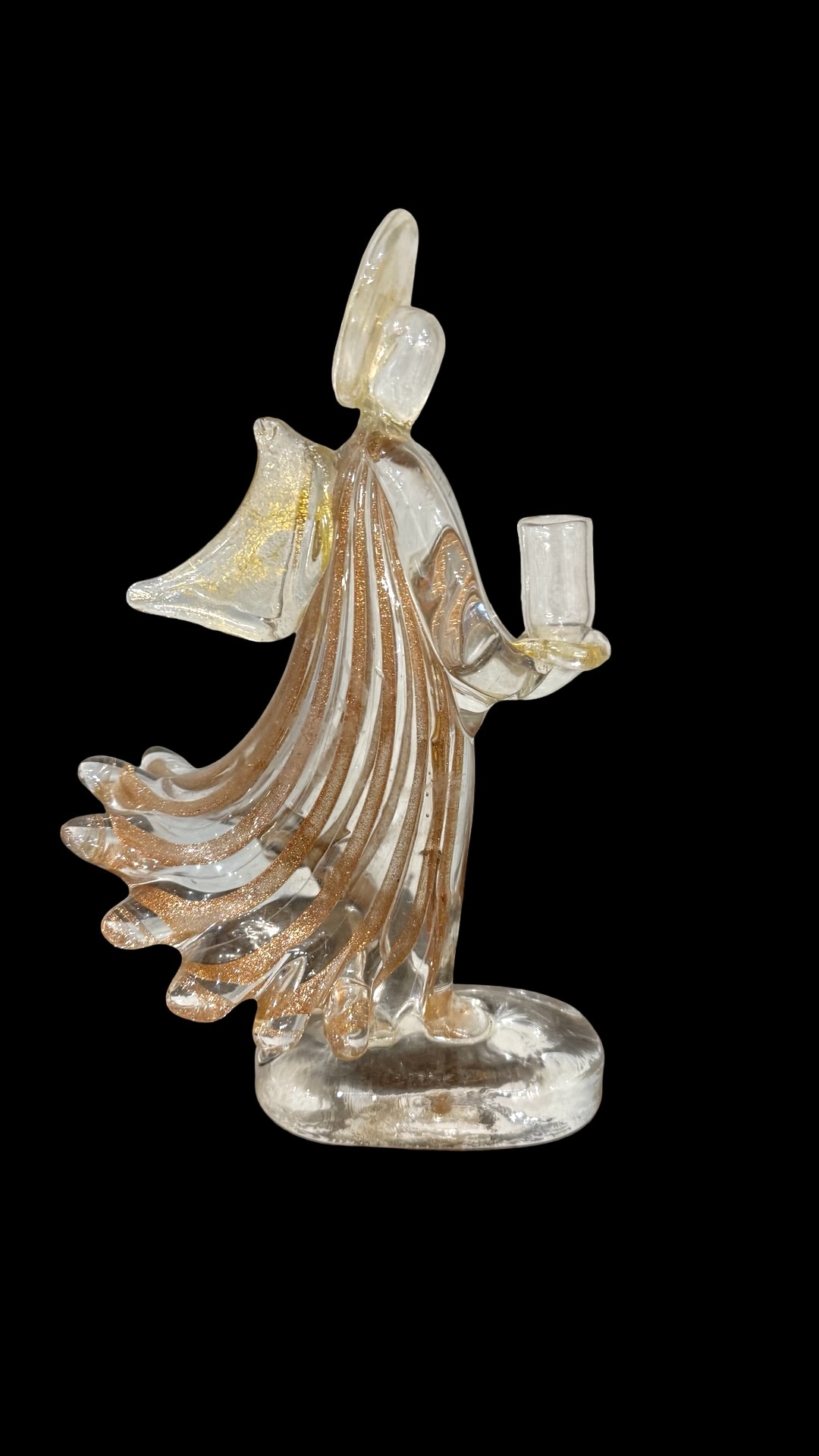 Heavy submerged glass angel candlestick with aventurine vertical bands and gold leaf inclusion. Murano. 23x15x10 cm.