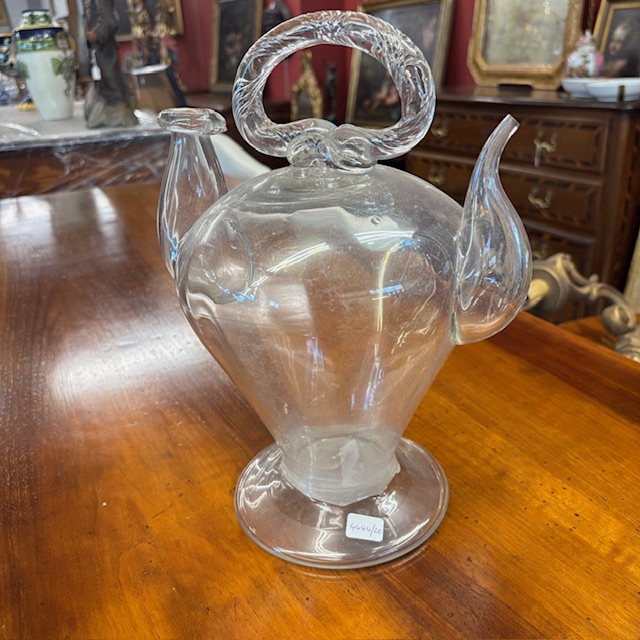 Antique splendid 18th-century blown glass holy water pitcher with double spout, one for water entry and one for exit. Dimensions H 32 W 23 base diameter 14 cm. Excellent condition. Rare item.
