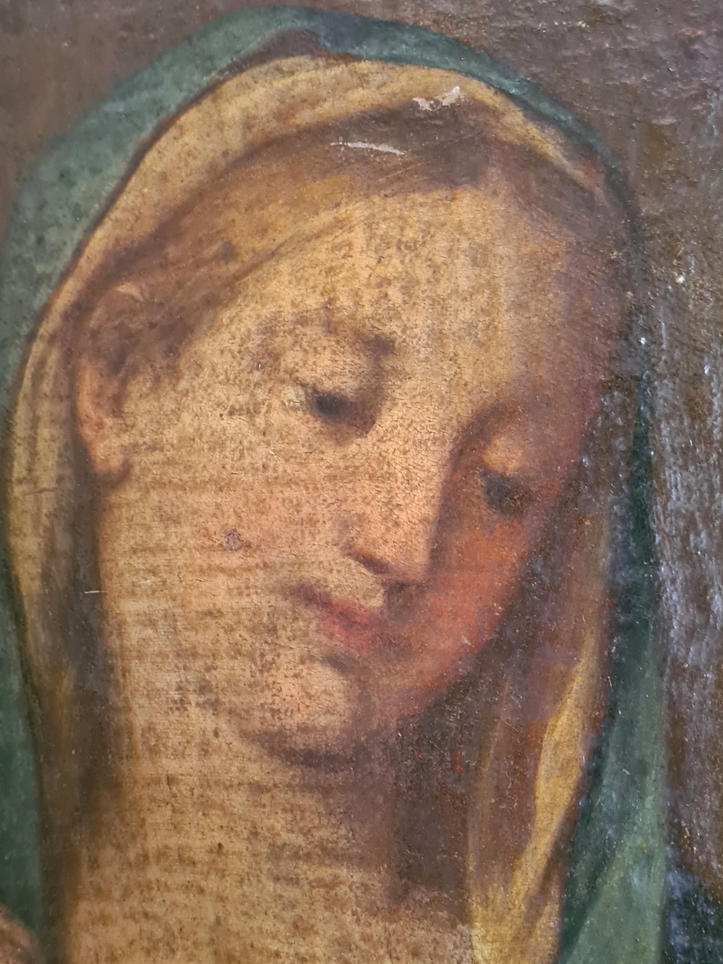 - "MADONNA" Bolognese School, late 17th century. Oil painting on canvas, relined, examined under Wood's lamp, shows some non-invasive restoration work.