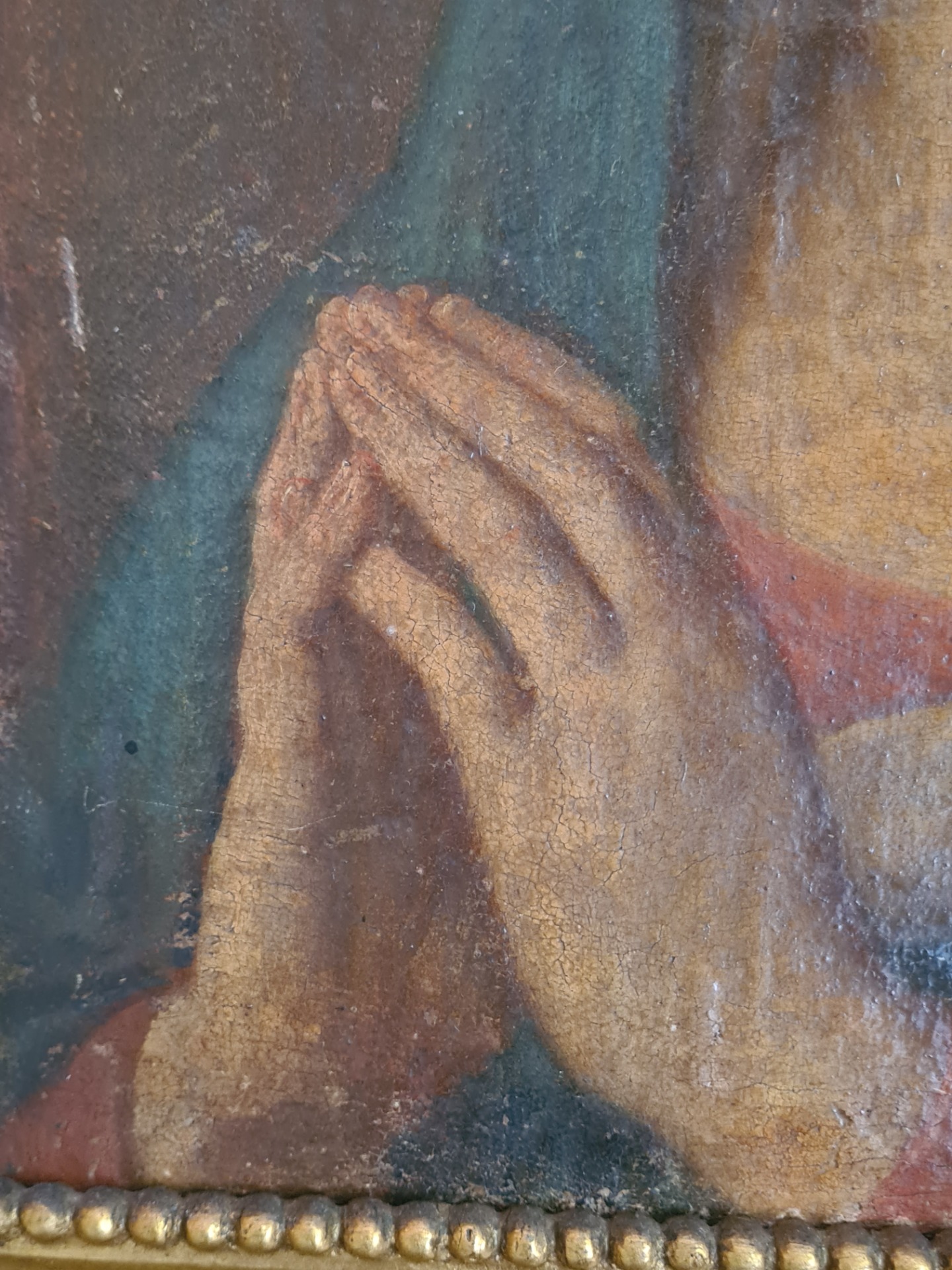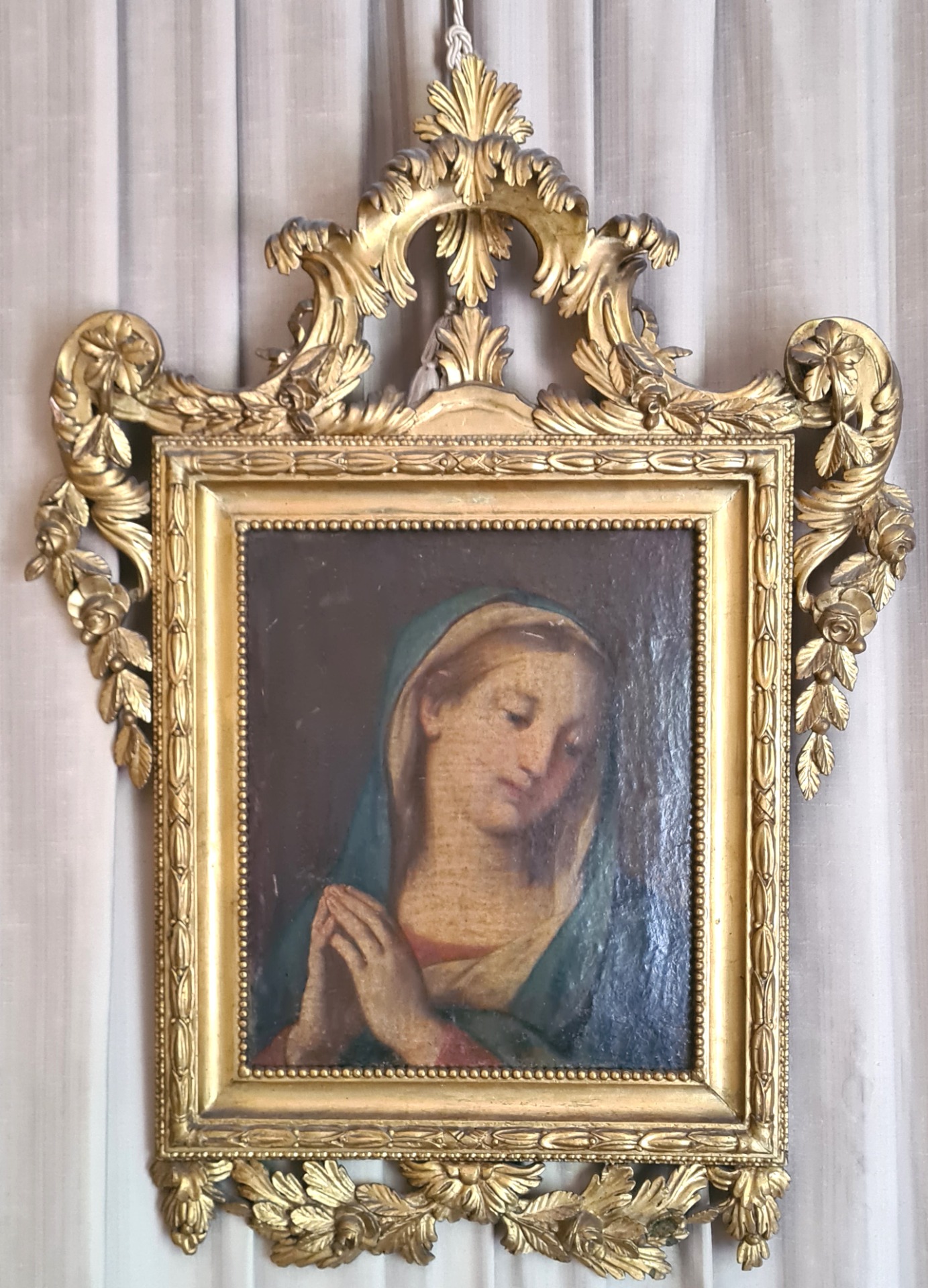 Canvas measures 46x30 cm, with a beautiful frame, in excellent condition, with carved and gold leaf gilded crest, 90x114 cm.