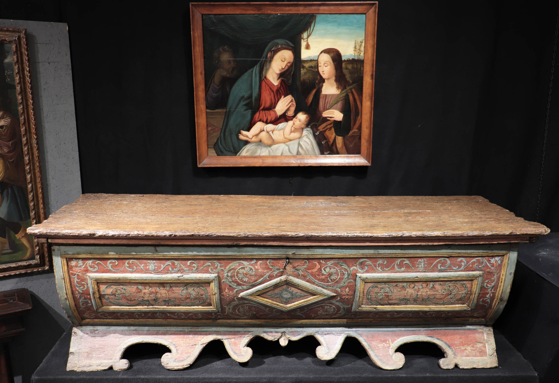 Dipinto ad olio su tavola, raffigurante la Sacra famiglia con Santa Caterina d'Alessandria.