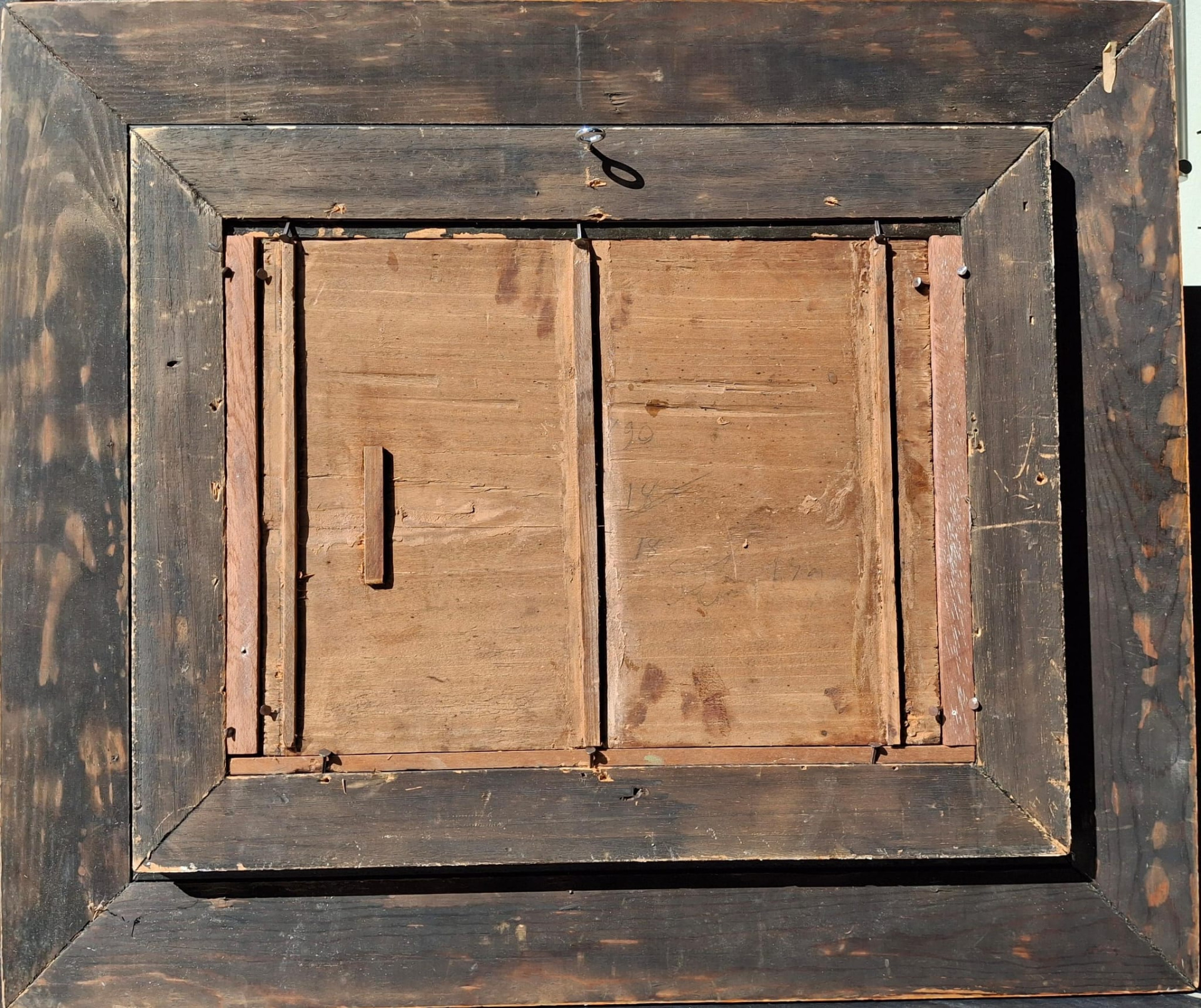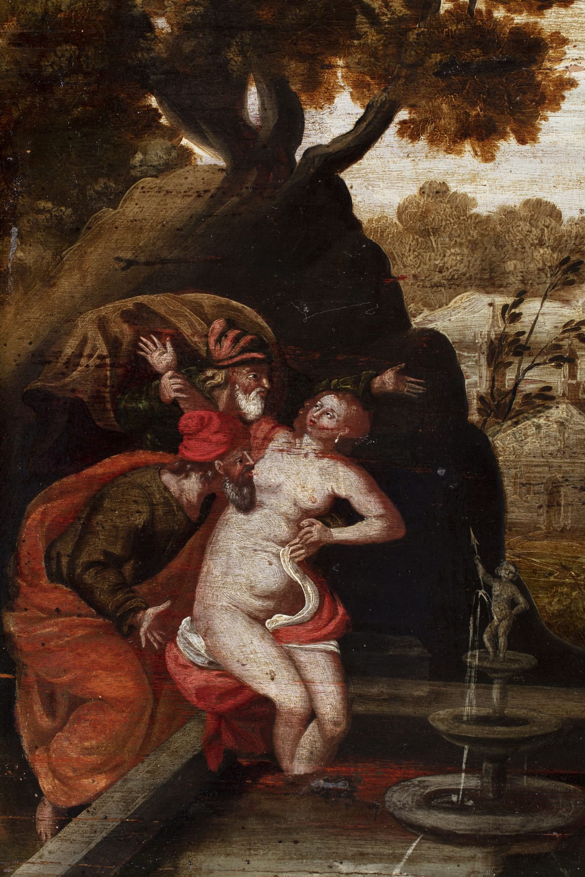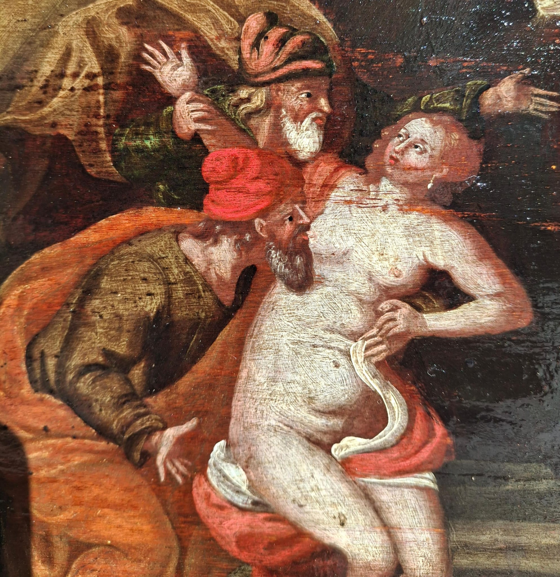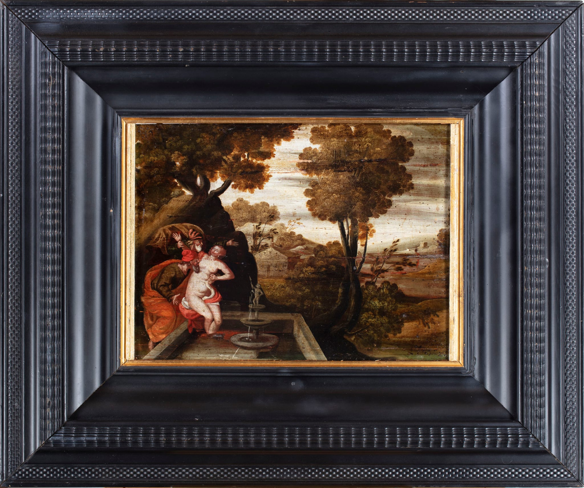Susanna and the Elders, a painting from the Antwerp school, first quarter of the 16th century, oil on panel, measuring 28.5x37 cm, 57x67.5 cm with frame.