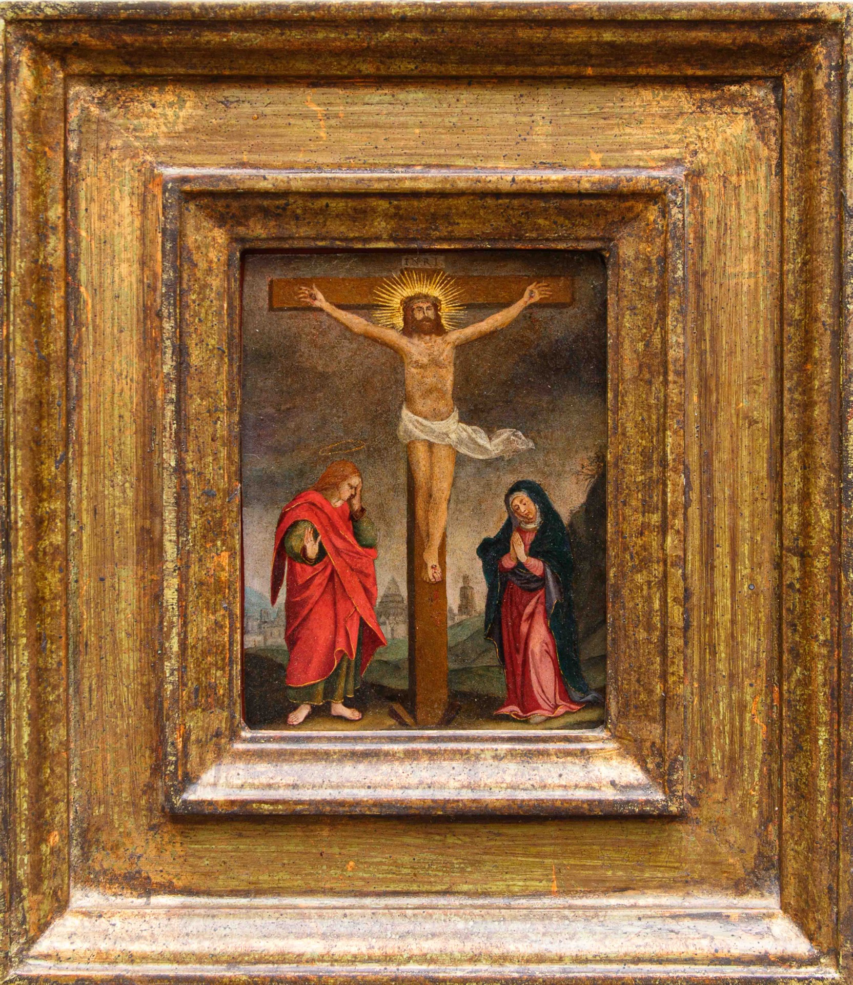 XVI secolo, Maestro fiammingo attivo in toscana Crocifissione Olio su rame, cm 18 x 13 Cornice 35 x 30 Il dipinto raffigurante la Crocifissione con Cristo, la Vergine Maria e San Giovanni Evangelista affronta un soggetto tra i più consueti e simbolicamente pregnanti...
